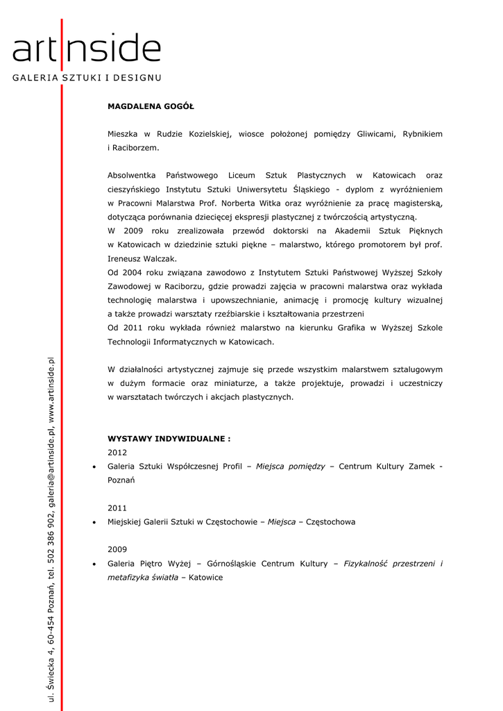 MAGDALENA GOGÓŁ Mieszka w Rudzie Kozielskiej, wiosce położonej pomiędzy Gliwicami, Rybnikiem i Raciborzem. Absolwentka Państwowego Liceum Sztuk Plastycznych w Katowicach oraz cieszyńskiego Instytutu Sztuki Uniwersytetu Śląskiego - dyplom z wyróżnieniem w Pracowni Malarstwa Prof. Norberta Witka oraz wyróżnienie za pracę magisterską, dotycząca porównania dziecięcej ekspresji plastycznej z twórczością artystyczną. W 2009 roku zrealizowała przewód doktorski na Akademii Sztuk Pięknych w Katowicach w dziedzinie sztuki piękne – malarstwo, którego promotorem był prof. Ireneusz Walczak. Od 2004 roku związana zawodowo z Instytutem Sztuki Państwowej Wyższej Szkoły Zawodowej w Raciborzu, gdzie prowadzi zajęcia w pracowni malarstwa oraz wykłada technologię malarstwa i upowszechnianie, animację i promocję kultury wizualnej a także prowadzi warsztaty rzeźbiarskie i kształtowania przestrzeni Od 2011 roku wykłada również malarstwo na kierunku Grafika w Wyższej Szkole Technologii Informatycznych w Katowicach. W działalności artystycznej zajmuje się przede wszystkim malarstwem sztalugowym w dużym formacie oraz miniaturze, a także projektuje, prowadzi i uczestniczy w warsztatach twórczych i akcjach plastycznych. WYSTAWY INDYWIDUALNE : 2012 Galeria Sztuki Współczesnej Profil – Miejsca pomiędzy – Centrum Kultury Zamek Poznań 2011 Miejskiej Galerii Sztuki w Częstochowie – Miejsca – Częstochowa 2009 Galeria Piętro Wyżej – Górnośląskie Centrum Kultury – Fizykalność przestrzeni i metafizyka światła – Katowice 2008 Klub Niezależnych Stowarzyszeń Twórczych Marchołt – inside-beside-outside – Katowice Galeria Epicentrum – wnętrzność z zewnątrz – Jastrzębie Zdrój 2007 Galeria 3 2 0 (z Prof. Kazimierzem Cieślikiem)- Festiwal Nauki i Sztuki – wnętrzność– Bielsko Biała Galeria Fundacji Elektrowni Rybnik - wnętrzność - Rybnik Galeria Forma – malarstwo – wystawa z okazji XV Finału WOŚP – Kuźnia Raciborska 2006 Galeria Klubu Akademickiego – malarstwo – Uniwersytet Opolski – Opole Galeria MDK – z perspektywy przyziemnej” – Mikołów 2005 Galeria Na Sali – malarstwo – DK Olza Galeria sztuki – malarstwo – Rybnickie Centrum Kultury– Rybnik Galeria Panorama – malarstwo - GCK – Jastrzębie Zdrój Galeria Sikornik – ego-kolor – Gliwice Mĕstská Galerie – malarstwo – Odry – Czechy 2004 Galeria Plamy- perspektywa egocentryczna – Rybnik 2001 Galeria TPZR – designed by … MAGDA GOGÓŁ” – Racibórz Galeria Epicentrum – TO JA – Jastrzębie Zdrój Galeria Stalowe Anioły – Sielsko- anielskie – Bytom 1999 Galeria MOK – pamiętam, wiem, przypuszczam… – instalacja i malarstwo – Powiatowa Inauguracja Roku Kulturalnego – Kuźnia Raciborska 1998 Galeria Antresola– malarstwo – Tarnowskie Góry Galeria Plenerowa Sorrento – malarstwo– Zabrze 1997 Galeria Przewiązka – malarstwo - Instytut Sztuki – Cieszyn Galeria Rotunda – malarstwo– Bytom WAŻNIEJSZE PROJEKTY I WYSTAWY ZBIOROWE : 2012 7 Międzynarodowe Biennale Miniatury – Częstochowa 2012 Wystawa miniatury malarskiej studentów IS PWSZ z pracowni Magdaleny GogółPeszke – małe obrazy o większym znaczeniu – Galeria RCI – Racibórz wystawa artystów-pedagogów I S PWSZ w Raciborzu oraz studentów i absolwentów kierunku: edukacja artystyczna w zakresie sztuk plastycznych - PRZEGLĄDARKA 1/1 Powiatowe Muzeum Ziemi Głubczyckiej Wystawa studentów i wykładowców Instytutu Sztuki PWSZ Racibórz – … w czasie - Galeria RCK – Racibórz 2011 VI Międzynarodowe Biennale Malarstwa i Tkaniny – Barwy i Faktury – Gdynia 2011 III Międzynarodowym Biennale Obrazu "QUADRO-ART" 2011 – Łódź 2011 CZAS-TIME-ZEIT – Wystawa międzynarodowa - Zamek Piastowski – Racibórz zdarzenia-zderzenia – cykl wystaw zbiorowych pedagogów IS PWSZ w Raciborzu – Zabrze, Racibórz, Wodzisław Jesienne Konfrontacje II Triennale Polskiego Malarstwa Współczesnego Rzeszów 2010 Galeria Umelcov Spisa w Novej Spisskiej Vsi - Słowacja 2010 II Międzynarodowy Konkurs Malarski - Przestrzeń Publiczna - Konteksty – Poznań 2010 Jesienne Konfrontacje II Triennale Polskiego Malarstwa Współczesnego Rzeszów 2010 VII Triennale Sztuki SACRUM – Dom -droga istnienia – Miejska Galeria Sztuki – Częstochowa II Międzynarodowe Biennale Obrazu Quadro-Art , Łódź 2009 8 Triennale Małych Form Malarskich –Galeria Sztuki Wozownia – Toruń 2010 Sen na jawie – Muzeum Miejskie w Siemianowicach XI Festiwal Sztuki Wysokiej –… od …do i pomiędzy – Bytom 2010 2009 I Międzynarodowy Konkurs Malarski - Obraz przestrzeni Publicznej – Poznań 2009 II Rybnik Art. Festiwal – Rybnik 2009 Z jawy – Galeria Marchołt - Katowice Wystawa twórczości artystów - pedagogów Instytutu Sztuki PWSZ w Raciborzu – Galeria Student – Ostrawa - Czechy Postawy 2009 - BWA Leszno Z bliska - Galeria Znad Wiliji – Wilno – Litwa X Festiwal Sztuki Wysokiej – Ciepłem skojarzeni – Bytom 2009 Plener Malarski Polsko-Czeski – Tworków 2009 2008 Festiwal Polskiego Malarstwa Współczesnego– Zamek Książąt Pomorskich – Szczecin 2008 Rybnik Art Festiwal 2008 I Międzynarodowe Biennale Obrazu – Quadro-art. - Łódź, 2007 IV Ogólnopolskie Biennale Malarstwa i Tkaniny Unikatowej - Trójmiasto '2007 Jesienne Konfrontacje Triennale Polskiego Malarstwa Współczesnego Rzeszów 2007 – najlepsze obrazy - Galeria Umelcov Spisa w Novej Spisskiej Vsi - Słowacja ze snu – Galeria Na II P – Gliwice 2007 udział w IV Wodzisławskim Przeglądzie Kina Uffowego – w kat. animacja, eksperyment - reż. animacja Podryw - Prezentacje Filmu Artystycznego Video-Art. Projekt Experimentart – Rybnik 2007 Jesienne Konfrontacje Triennale Polskiego Malarstwa Współczesnego - Rzeszów 2007 7 Triennale Małej Formy Malarskiej –Galeria Sztuki Wozownia - Toruń 2007- Wystawa -15 lat Ogólnopolskiego Konkursu Sztuki im. Vincenta V