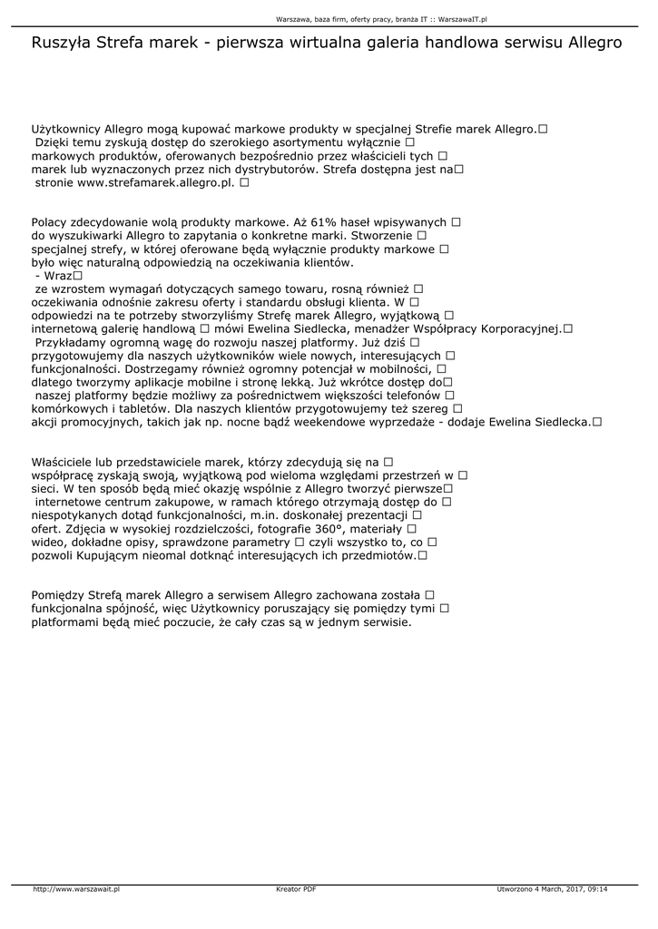 Warszawa, baza firm, oferty pracy, branża IT :: WarszawaIT.pl Ruszyła Strefa marek - pierwsza wirtualna galeria handlowa serwisu Allegro Użytkownicy Allegro mogą kupować markowe produkty w specjalnej Strefie marek Allegro. Dzięki temu zyskują dostęp do szerokiego asortymentu wyłącznie markowych produktów, oferowanych bezpośrednio przez właścicieli tych marek lub wyznaczonych przez nich dystrybutorów. Strefa dostępna jest na stronie www.strefamarek.allegro.pl. Polacy zdecydowanie wolą produkty markowe. Aż 61% haseł wpisywanych do wyszukiwarki Allegro to zapytania o konkretne marki. Stworzenie specjalnej strefy, w której oferowane będą wyłącznie produkty markowe było więc naturalną odpowiedzią na oczekiwania klientów. - Wraz ze wzrostem wymagań dotyczących samego towaru, rosną również oczekiwania odnośnie zakresu oferty i standardu obsługi klienta. W odpowiedzi na te potrzeby stworzyliśmy Strefę marek Allegro, wyjątkową internetową galerię handlową mówi Ewelina Siedlecka, menadżer Współpracy Korporacyjnej. Przykładamy ogromną wagę do rozwoju naszej platformy. Już dziś przygotowujemy dla naszych użytkowników wiele nowych, interesujących funkcjonalności. Dostrzegamy również ogromny potencjał w mobilności, dlatego tworzymy aplikacje mobilne i stronę lekką. Już wkrótce dostęp do naszej platformy będzie możliwy za pośrednictwem większości telefonów komórkowych i tabletów. Dla naszych klientów przygotowujemy też szereg akcji promocyjnych, takich jak np. nocne bądź weekendowe wyprzedaże - dodaje Ewelina Siedlecka. Właściciele lub przedstawiciele marek, którzy zdecydują się na współpracę zyskają swoją, wyjątkową pod wieloma względami przestrzeń w sieci. W ten sposób będą mieć okazję wspólnie z Allegro tworzyć pierwsze internetowe centrum zakupowe, w ramach którego otrzymają dostęp do niespotykanych dotąd funkcjonalności, m.in. doskonałej prezentacji ofert. Zdjęcia w wysokiej rozdzielczości, fotografie 360°, materiały wideo, dokładne opisy, sprawdzone parametry czyli wszystko to, co pozwoli Kupującym nieomal dotknąć interesujących ich przedmiotów. Pomiędzy Strefą marek Allegro a serwisem Allegro zachowana została funkcjonalna spójność, więc Użytkownicy poruszający się pomiędzy tymi platformami będą mieć poczucie, że cały czas są w jednym serwisie. http://www.warszawait.pl Kreator PDF Utworzono 4 March, 2017, 09:14