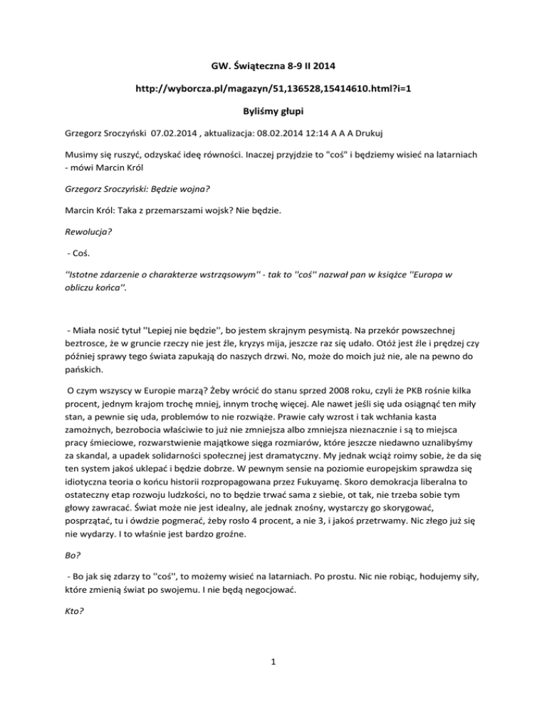 GW. Świąteczna 8-9 II 2014 http://wyborcza.pl/magazyn/51,136528,15414610.html?i=1 Byliśmy głupi Grzegorz Sroczyński 07.02.2014 , aktualizacja: 08.02.2014 12:14 A A A Drukuj Musimy się ruszyć, odzyskać ideę równości. Inaczej przyjdzie to "coś" i będziemy wisieć na latarniach - mówi Marcin Król Grzegorz Sroczyński: Będzie wojna? Marcin Król: Taka z przemarszami wojsk? Nie będzie. Rewolucja? - Coś. ''Istotne zdarzenie o charakterze wstrząsowym'' - tak to ''coś'' nazwał pan w książce ''Europa w obliczu końca''. - Miała nosić tytuł ''Lepiej nie będzie'', bo jestem skrajnym pesymistą. Na przekór powszechnej beztrosce, że w gruncie rzeczy nie jest źle, kryzys mija, jeszcze raz się udało. Otóż jest źle i prędzej czy później sprawy tego świata zapukają do naszych drzwi. No, może do moich już nie, ale na pewno do pańskich. O czym wszyscy w Europie marzą? Żeby wrócić do stanu sprzed 2008 roku, czyli że PKB rośnie kilka procent, jednym krajom trochę mniej, innym trochę więcej. Ale nawet jeśli się uda osiągnąć ten miły stan, a pewnie się uda, problemów to nie rozwiąże. Prawie cały wzrost i tak wchłania kasta zamożnych, bezrobocia właściwie to już nie zmniejsza albo zmniejsza nieznacznie i są to miejsca pracy śmieciowe, rozwarstwienie majątkowe sięga rozmiarów, które jeszcze niedawno uznalibyśmy za skandal, a upadek solidarności społecznej jest dramatyczny. My jednak wciąż roimy sobie, że da się ten system jakoś uklepać i będzie dobrze. W pewnym sensie na poziomie europejskim sprawdza się idiotyczna teoria o końcu historii rozpropagowana przez Fukuyamę. Skoro demokracja liberalna to ostateczny etap rozwoju ludzkości, no to będzie trwać sama z siebie, ot tak, nie trzeba sobie tym głowy zawracać. Świat może nie jest idealny, ale jednak znośny, wystarczy go skorygować, posprzątać, tu i ówdzie pogmerać, żeby rosło 4 procent, a nie 3, i jakoś przetrwamy. Nic złego już się nie wydarzy. I to właśnie jest bardzo groźne. Bo? - Bo jak się zdarzy to ''coś'', to możemy wisieć na latarniach. Po prostu. Nic nie robiąc, hodujemy siły, które zmienią świat po swojemu. I nie będą negocjować. Kto? 1 - Choćby nacjonaliści. Przecież idzie ta fala. Żeby demokracja liberalna przetrwała najbliższe 50 lat, muszą zajść bardzo istotne zmiany polegające na odzyskaniu idei równości w jakiejś sensownej formie, co nie jest proste i nikt nie wie, jak to robić. Ja w każdym razie nie wiem. Wiem tylko, że żyjemy w świecie, gdzie 85 osób ma majątek większy niż połowa ludzkości, czyli 3,5 miliarda ludzi. Sytuacja absolutnie chora. Nigdy w czasie swojego życia nie byłem panikarzem, nawet jak mnie Gomułka w 1968 roku wsadzał do więzienia, uważałem, że wszystko się dobrze skończy. A dzisiaj po raz pierwszy czuję strach, że nie będzie happy endu. I napisałem ponurą książkę, żeby tym strachem ludzi pozarażać. Może to kogoś ruszy. Skończymy marnie, jeśli rozsądni ludzie nie podejmą uniwersalnych ideałów - równości i braterstwa. To coś nowego. - Nowego? Stare hasła. Wolność, równość, braterstwo. Tak. Tyle że z tej triady pańskie pokolenie wybrało wolność i głównie o niej nam mówiło. Wolni i przedsiębiorczy ludzie sami sobie świetnie poradzą, byle im nie przeszkadzać. Kwartalnik ''Res Publica'', którym pan kierował, pełen był takich tekstów. - Głupi byliśmy. W latach 80. zaraziliśmy się ideologią neoliberalizmu, rzeczywiście sporo się tutaj zasłużyłem, namawiałem do tego Tuska, Bieleckiego, całe to gdańskie towarzystwo. Pisma Hayeka im pracowicie podtykałem. Mieliśmy podobne poglądy z Balcerowiczem, dzisiaj się rozjechaliśmy. Wygasł we mnie ten zapał dość szybko. Zorientowałem się, że w liberalizmie zaczyna dominować składnik indywidualizmu, który po kolei wypiera inne ważne wartości i zabija wspólnotę. To zresztą łatwo wyjaśnić. Indywidualizm ma bardzo mocne wsparcie ze strony sił wolnego rynku, który na indywidualistycznym modelu życia zbija pieniądze. Natomiast wartości społeczne i obywatelskie, solidarność, współdziałanie nie mają takiego dopalacza. One są ''nieefektywne'' z punktu widzenia ekonomii. Zapanowało złudzenie, że każdy człowiek może żyć osobno, w ramach swojej osobistej wolności gdzieś tam pracować, zarabiać możliwie jak najwięcej, używać życia jak najwięcej, a ktoś tam będzie nami rządził. Można się zająć własnymi przyjemnościami, a nie zawracać sobie głowy sprawami tego świata. Przyjemne życie. - Ma to swoją ideologię od ponad dwustu lat, powstało tysiąc książek na ten temat, tylko nikt nie ma odwagi nazwać tego absolutyzmem oświeconym. Ale tak naprawdę o to chodzi. Amerykański modny politolog Fareed Zakaria przekonuje, że demokracja przeszkadza dziś w rządzeniu. Politycy marnują energię na umizgi wobec wyborców, a mogliby się przecież zająć poważniejszymi sprawami, dalekosiężnymi reformami najlepiej. Powinno więc być mniej demokracji, a jeszcze więcej liberalizmu. Niech ludzie mają pełną wolność w swoich domach, w łóżkach, przed 2 telewizorami, niech tam robią, co chcą, aby tylko się nie wtrącali do polityki. Bo przecież polityka wymaga ekspertów, sprawy współczesnego świata są okropnie skomplikowane. Są. - Pewnie. Nawet tak z pozoru banalna sprawa jak nasze polskie OFE. Nie mam zdania na ten temat. Pan ma? Mam. - No to dziwne. Bo rozsądny człowiek nie może mieć zdania o OFE. Można mieć emocje i uczucia z tym związane. I gwałtownie je wyrażać. Ale zdanie to mogą mieć ekonomiści, eksperci. I nie wierzę im jak psom. Bo? - Bo jeden pracował w banku, który jest właścicielem OFE, inny po prostu doradza OFE i się bezczelnie wypowiada, a trzeci nie chce sobie robić kłopotów w środowisku i uchodzić za oszołoma, więc mówi to samo co tamci dwaj. To jest świetny przykład pokazujący 