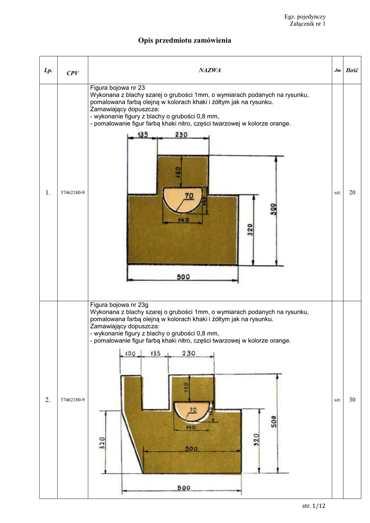 Egz. pojedynczy Załącznik nr 1 Opis przedmiotu zamówienia Lp. CPV NAZWA Jm Ilość szt. 20 szt. 30 Figura bojowa nr 23 Wykonana z blachy szarej o grubości 1mm, o wymiarach podanych na rysunku, pomalowana farbą olejną w kolorach khaki i żółtym jak na rysunku. Zamawiający dopuszcza: - wykonanie figury z blachy o grubości 0,8 mm, - pomalowanie figur farbą khaki nitro, części twarzowej w kolorze orange. 1. 37462180-9 Figura bojowa nr 23g Wykonana z blachy szarej o grubości 1mm, o wymiarach podanych na rysunku, pomalowana farbą olejną w kolorach khaki i żółtym jak na rysunku. Zamawiający dopuszcza: - wykonanie figury z blachy o grubości 0,8 mm, - pomalowanie figur farbą khaki nitro, części twarzowej w kolorze orange. 2. 37462180-9 str. 1/12 Egz. pojedynczy Załącznik nr 1 Figura bojowa nr 27 Wykonana z blachy szarej o grubości 1mm, o wymiarach podanych na rysunku, pomalowana farbą olejną w kolorach khaki i żółtym jak na rysunku. Zamawiający dopuszcza: - wykonanie figury z blachy o grubości 0,8 mm, - pomalowanie figur farbą khaki nitro, części twarzowej w kolorze orange, - zastosowanie ryfla. 3. 37462180-9 szt. 50 szt. 60 Figura bojowa nr 30 Wykonana z blachy szarej o grubości 0,8mm, o wymiarach podanych na rysunku, pomalowana farbą olejną w kolorach khaki i żółtym jak na rysunku. Zamawiający dopuszcza: - wykonanie figury z blachy o grubości 0,8 mm, - pomalowanie figur farbą khaki nitro, części twarzowej w kolorze orange, - zastosowanie ryfla. 4. 37462180-9 str. 2/12 Egz. pojedynczy Załącznik nr 1 Figura bojowa nr 31 Wykonana z blachy szarej o grubości 0,8mm, o wymiarach podanych na rysunku, pomalowana farbą olejną w kolorach khaki, czarnym i żółtym jak na rysunku. Zamawiający dopuszcza: - wykonanie figury z blachy o grubości 0,8 mm, - pomalowanie figur farbą khaki nitro, części twarzowej w kolorze orange, - zastosowanie ryfla. 5. 37462180-9 szt. 30 szt. 80 Figura bojowa nr 40 Wykonana z blachy szarej o grubości 0,8mm, o wymiarach podanych na rysunku, pomalowana farbą olejną w kolorach khaki i żółtym jak na rysunku. Zamawiający dopuszcza: - wykonanie figury z blachy o grubości 0,8 mm, - pomalowanie figur farbą khaki nitro, części twarzowej w kolorze orange, - zastosowanie ryfla. 6. 37462180-9 str. 3/12 Egz. pojedynczy Załącznik nr 1 Figura bojowa nr 40a Wykonana z blachy szarej o grubości 0,8mm, o wymiarach podanych na rysunku, pomalowana farbą olejną w kolorach khaki i żółtym jak na rysunku. Zamawiający dopuszcza: - wykonanie figury z blachy o grubości 0,8 mm, - pomalowanie figur farbą khaki nitro, części twarzowej w kolorze orange, - zastosowanie ryfla. 7. 37462180-9 szt. 15 szt. 10 Podstawa na ekrany strzeleckie Podstawa wykonana z drewna z zamocowanymi dwoma elementami z ceownika stalowego oraz czterema matalowymi szpilami. 8. 37462170-6 str. 4/12 Egz. pojedynczy Załącznik nr 1 Stelaż do ekranów strzeleckich a) Konstrukcja wykonana z kantówki sosnowej o wym. 70 x 70 mm, 9. 37462170-6 szt. 20 szt. 70 750 Stelaż do ekranów strzeleckich b) Wykonany z tarcicy, z drzewa iglastego, o przekroju 40 mm x 50 mm, łączenie kamowane, niemalowany. Zamawiający informuje, że akceptuje łączenie ekranów strzeleckich sposobem gniazdo i czop. 37462170-6 2200 10. 50 40 str. 5/12 Egz. pojedynczy Załącznik nr 1 Stelaż do ekranów strzeleckich c) Rama stelaża wykonana w całości z wysuszonego, heblowanego oraz bez sękowego drzewa sosnowego (kantówki o grubości 6x7 cm jako elementy składowe stelaża). Łączenia ramy wykonane za pomocą zacięć klejonych i ściskanych prasą hydrauliczną („łączenia czopowane”). Powierzchnia strzelnicza („lustro stelaża”) wykonane z płyty pilśniowej o grubości 0,3 cm wsuwanej przez górną krawędź stelaża w frez głębokości 1 cm znajdujący się w wewnętrznej części ramy. 11. 37462170-6 szt. 30 szt. 120 Ekran strzelecki a) Ekran tarczy wykonany z płyty paździerzowej o grubości 5 mm o wym. 100 x 100 cm z „gładkiej strony” koloru białego. 12. 37462180-9 str. 6/12 Egz. pojedynczy Załącznik nr 1 13. 750 Ekran strzelecki b) Wykonany z płyty pilśniowej twardej grubości 5mm, o wymiarach 750mm x750mm, pomalowany po stronie gładkiej biała farbą olejną 37462180-9 szt. 350 szt. 500 750 Noga do figury bojowej a) 2200 Wykonane z tarcicy, z drzewa iglastego o przekroju 50 mm x 25 mm. 37462170-6 25 14. 50 str. 7/12 Egz. pojedynczy Załącznik nr 1 Noga do figury bojowej b) Wykonane z tarcicy, z drzewa iglastego o przekroju 50 mm x 25 mm. szt. 500 szt. 500 37462180-9 Drewniane wkłady do wysadzania a) Wykonane z płyty paździerzowej o grubości 0,8 – 1,2 cm. Docięte do kwadratu o boku długości 100 cm. szt. 100 37462180-9 Drewniane wkłady do wysadzania b) Wykonane z płyty pilśniowej o grubości 0,8 – 1,2 cm. Docięte do kwadratu o boku długości 100 cm. szt. 100 37462170-6 25 1300 15. 50 Noga do figury bojowej c) 37462170-6 25 16. 800 Wykonane z tarcicy, z drzewa iglastego o przekroju szer.50mm x dług. 25mm x wys. 800mm. 50 17. 18. str. 8/12 Egz. pojedynczy Załącznik nr 1 19. 20. 37462180-9 Poszycie gumowe do kulochwytów Wykonane z jednolitych płatów zbrojonej gumy o grubości 3,0 – 3,5 cm. Zbrojenie pionowymi liniami w odstępach 1,0 – 4,0 cm splotu drutu o przekroju 0,8-1,0 cm wtopionych w płat gumy. Komplet składa się z trzech wyciętych prostokątów o wymiarach: 1. prostokąt 60x70 cm; 2. prostokąt 57x70 cm; 3. prostokąt 90x73 cm . Wkłady do stelaży tarczowych. Wkład wykonany z jednolitej gładkiej płyty pilśniowej o grubości 3,5 mm docięty do kształtu prostokątnego o wymiarach 60x90 cm. Krawędzie wkładu wygładzone. 37462180-9 Zamawiający dopuszcza wykonanie wkładów z płyty pilśniowej twardej o grubości 3 mm. szt. 11 szt. 300 Tarcza TS 10 o wym. 685 mm x 495 mm. Zamawiający nie dysponuje cyfrową wersją tarczy. 21. szt. 7 000 22000000-0 str. 9/12 Egz. pojedynczy Załącznik nr 1 Tarcza TS 9 o wym. 68