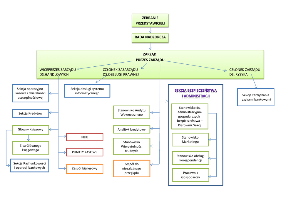 ZEBRANIE PRZEDSTAWICIELI RADA NADZORCZA ZARZĄD: PREZES ZARZĄDU WICEPREZES ZARZĄDU DS.HANDLOWYCH Sekcja operacyjnokasowa i działalności oszczędnościowej CZŁONEK ZAZARZĄDU DS.OBSŁUGI PRAWNEJ Sekcja obsługi systemu informatycznego Sekcja zarządzania ryzykami bankowymi Sekcja Kredytów Stanowisko Audytu Wewnętrznego Główny Księgowy Analityk kredytowy FILIE Z-ca Głównego księgowego Sekcja Rachunkowości i operacji bankowych CZŁONEK ZARZĄDU DS. RYZYKA PUNKTY KASOWE Stanowisko Wierzytelności trudnych Stanowisko ds. administracyjnogospodarczych i bezpieczeństwa – Kierownik Sekcji Stanowisko Marketingu Stanowisko obsługi korespondencji Zespół biznesowy Zespół do niezależnego przeglądu Pracownik Gospodarczy