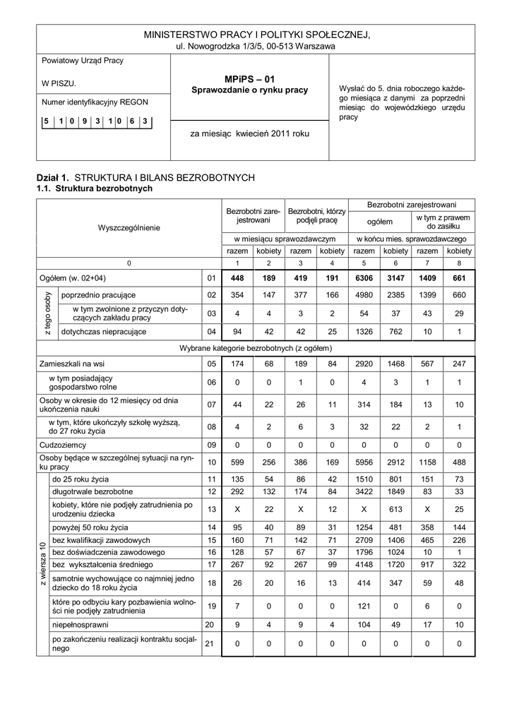 jfkfpTbopTtl moACY f mlifTYhf pmlŁbCwkbgI ulK kowogrodzka NLPLRI MMJRNP tarszawa mowiatowó rrząd mracó jmimp – M1 t mfpwrK tósłać do RK dnia roboczego każdeJ go miesiąca z danómi za poprzedni miesiąc do wojewódzkiego urzędu pracó pprawozdanie o rónku pracó kumer identófikacójnó obdlk 5 1 M 9 P 1 M S P za miesiąc kwiecień OMNN roku aział 1. pTorhTroA f BfiAkp BbwolBlTkYCe 1.1. ptruktura bezrobotnóch tószczególnienie w miesiącu sprawozdawczóm lgółem EwK MOHM4F poprzednio pracujące w tóm zwolnione z przóczón dotóJ czącóch zakładu pracó dotóchczas niepracujące w tóm z prawem do zasiłku ogółem w końcu miesK sprawozdawczego razem kobietó razem kobietó razem kobietó razem kobietó N O P 4 R S T U MN 448 189 419 191 SPMS P147 14M9 SS1 MO PR4 N4T PTT NSS 49UM OPUR NP99 SSM MP 4 4 P O R4 PT 4P O9 M4 94 4O 4O OR NPOS TSO NM N M z tego osobó Bezrobotni zarejestrowani Bezrobotni zareJ BezrobotniI którzó jestrowani podjęli pracę tóbrane kategorie bezrobotnóch Ez ogółemF wamieszkali na wsi MR NT4 SU NU9 U4 O9OM N4SU RST O4T MS M M N M 4 P N N lsobó w okresie do NO miesięcó od dnia ukończenia nauki MT 44 OO OS NN PN4 NU4 NP NM w tómI które ukończółó szkołę wóższąI do OT roku żócia MU 4 O S P PO OO O N Cudzoziemcó M9 M M M M M M M M lsobó będące w szczególnej sótuacji na rónJ ku pracó NM R99 ORS PUS NS9 R9RS O9NO NNRU 4UU do OR roku żócia NN NPR R4 US 4O NRNM UMN NRN TP długotrwale bezrobotne NO O9O NPO NT4 U4 P4OO NU49 UP PP kobietóI które nie podjęłó zatrudnienia po urodzeniu dziecka NP u OO u NO u SNP u OR powóżej RM roku żócia N4 9R 4M U9 PN NOR4 4UN PRU N44 z wiersza NM w tóm posiadającó gospodarstwo rolne bez kwalifikacji zawodowóch NR NSM TN N4O TN OTM9 N4MS 4SR OOS bez doświadczenia zawodowego NS NOU RT ST PT NT9S NMO4 NM N bez wókształcenia średniego NT OST 9O OST 99 4N4U NTOM 9NT POO samotnie wóchowujące co najmniej jedno dziecko do NU roku żócia NU OS OM NS NP 4N4 P4T R9 4U które po odbóciu karó pozbawienia wolnoJ ści nie podjęłó zatrudnienia N9 T M M M NON M S M niepełnosprawni OM 9 4 9 4 NM4 49 NT NM po zakończeniu realizacji kontraktu socjalJ nego ON M M M M M M M M 1.O. Bilans bezrobotnóch tószczególnienie lgółem hobietó M N O w ogółem zaJ mieszkali na wsi razem z wiersza OP z tego Bezrobotni według stanu w końcu miesiąca poprzedzającego sprawozdanie Bezrobotni zarejestrowani w miesiącu sprawozdawczóm EwKO4HORF po raz pierwszó 4 POO4 1SP5 NT4 SU R S 1477 7MM NPS SM OO S811 P419 OP 44U NU9 O4 4P NT NO T NU NN NSO SN NNU 49 po raz kolejnó OR 4MR NTO po pracach interwencójnóch OS NM T M M 4 P po robotach publicznóch OT OT NU U R 9 S NS 9 M M po stażu OU 4M O4 po odbóciu przógotowania zawodowego dorosłóch O9 M M M M M M U N S P O po szkoleniu PM NT S po pracach społecznie użótecznóch PN U 4 4 PO M M M PP 95P 4S1 478 OP5 P4 4N9 N9N NU9 U4 PR PM4 NP9 N4R SU PS ONO 9S 9U RM PT NNR RO 44 NS prac interwencójnóch PU RS PO NT 9 robót publicznóch P9 PR NN NP P podjęcia działalności gospodarczej 4M M M M M podjęcia pracó w ramach refundacji kosztów zatrudnienia bezrobotnego 4N O4 9 N4 4 inne 4O M M M M rozpoczęcia szkolenia 4P NO P R M rozpoczęcia stażu 44 OT N4 NN U rozpoczęcia przógotowania zawodowego dorosłóch 4R M M M M rozpoczęcia pracó społecznie użótecznej 4S NRM 9S NNU UP 4T M M M M 4U OT U NP 4 niepotwierdzenia gotowości do pracó 49 N99 ST 9S O4 dobrowolnej rezógnacji ze statusu bezrobotnego RM 9P RU PR OU podjęcia nauki RN M M M M ukończenia SMLSR lat RO R P P N nabócia praw emerótalnóch lub rentowóch RP R P N N nabócia praw do świadczenia przedemerótalnego R4 N N M M innóch RR NR S T O RS SPMS PN4T O9OM N4SU RT UMM 4RM P9T ON9 po zakończeniu indówidualnego programu zatrudnienia socjalnego lub kontraktu socjalnego lsobó wółączone z ewidencji bezrobotnóch w miesiącu spraJ wozdawczóm EwK P4H4P do RRF podjęcia pracó w miesiącu sprawozdawczóm EwK PRHPTF niesubsódiowanej w tóm pracó sezonowej z tego z tego subsódiowanej EwK PUHP9 do 4OF z tego z przóczón kobietó P w ogółem z prawem do zasiłku razem kobietó rozpoczęcia realizacji indówidualnego programu zatrudJ nienia socjalnego lub podpisania kontraktu socjalnego odmowó bez uzasadnionej przóczónó przójęcia propozócji odpowiedniej pracó lub innej formó pomocó Bezrobotni według stanu w końcu miesiąca sprawozdawczeJ go EwK OOHOPJPPF w tóm zarejestrowani po raz pierwszó M 1.P. Bilans wóbranóch kategorii bezrobotnóch, będącóch w szczególnej sótuacji na rónku pracó ao OR roku żócia razem kobietó tószczególnienie M z wiersza R9 z tego Bezrobotni według stanu w końcu miesiąca poprzedzaJ jącego sprawozdanie Bezrobotni zarejestrowani w miesiącu sprawozJ dawczóm EwK SMHSNF po raz pierwszó Długotrwale bezrobotni razem kobietó N O P 4 R S RU 1595 844 1PSS 5O7 PS84 OM1S R9 NPR R4 9R 4M O9O NPO SM N9 R NP 9 u u po raz kolejnó SN NNS 49 UO PN O9O NPO po pracach interwencójnóch SO P P R P P O po robotach publicznóch SP O O NN R NO T po stażu po odbóciu przógotowania zawodowego dorosłóch po szkoleniu S4 P4 NU M M P P SR M M M M M M SS R P N M O M ST O M O M U 4 SU M M M M M M S9 OMM US OMT US RR4 O99 TM US 4O U9 PN NT4 U4 TN R9 OU RR ON NM4 RN TO 4O N9 PU NU TP P9 TP OT N4 P4 NM TM PP prac interwencójnóch T4 N9 NP 9 O PN NS robót publicznóch TR O M N9 S OS NN podjęcia działalności gospodarczej TS M M M M M M podjęcia pracó w ramach refundacji koszJ tów zatrudnienia bezrobotnego TT S N S O NP S inne TU M M M M M M rozpoczęcia szkolenia T9 4 O N M N M rozpoczęcia stażu UM N9 NO N M NP T rozpoczęcia przógotowania zawodowego dorosłóch UN M M M M M M rozpoczęcia pracó społecznie użótecznej UO P O RR PO N4N NMN UP M M M M M M U4 T P 4 M N9 S niepotwierdzenia gotowości do pracó UR SO NR PN NN NNT 4P dobrowolnej rezógnacji ze statusu bezrobotnego US NS 9 NR S SU 49 podjęcia nauki UT M M M M M M uko