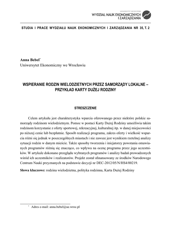 STUDIA I PRACE WYDZIAŁU NAUK EKONOMICZNYCH I ZARZĄDZANIA NR 35, T. 2 Anna Bebel* Uniwersytet Ekonomiczny we Wrocławiu WSPIERANIE RODZIN WIELODZIETNYCH PRZEZ SAMORZĄDY LOKALNE – PRZYKŁAD KARTY DUŻEJ RODZINY STRESZCZENIE Celem artykułu jest charakterystyka wparcia oferowanego przez niektóre polskie samorządy rodzinom wielodzietnym. Pomoc w postaci Karty Dużej Rodziny umożliwia takim rodzinom korzystanie z oferty sportowej, rekreacyjnej, kulturalnej itp. w danej miejscowości po niższej cenie lub bezpłatnie. Sposób realizacji programu, zakres oferty i wielkość wsparcia różni się jednak w poszczególnych miastach i nie zawsze jest wynikiem rzetelnej analizy sytuacji rodzin w danym mieście. Także sposoby tworzenia i inicjatorzy powstania omawianych programów różnią się znacząco, co wpływa na ocenę programu przez jego uczestników. W artykule dokonano przeglądu wybranych programów i analizy badań prowadzonych wśród ich uczestników i realizatorów. Projekt został sfinansowany ze środków Narodowego Centrum Nauki przyznanych na podstawie decyzji nr DEC-2012/05/N/HS4/00219. Słowa kluczowe: rodzina wielodzietna, polityka rodzinna, Karta Dużej Rodziny * Adres e-mail: [email protected] 280 PROBLEMY WSPÓŁCZESNEJ EKONOMII Wprowadzenie Celem pracy jest charakterystyka instrumentu polityki rodzinnej skierowanego do polskich rodzin wielodzietnych, zwanego Kartą Dużej Rodziny. W artykule zostanie podjęta próba oceny jego dopasowania do rzeczywistych potrzeb rodzin wielodzietnych. Analiza umożliwi wyciągnięcie wniosków na temat jego skuteczności, zalet i wad oraz wskaże potrzebę dalszych badań i stałego monitorowania realizacji programów przez ich realizatorów. Praca ma charakter przede wszystkim empiryczny, jest efektem prowadzonych przez autorkę badań o charakterze zarówno ilościowym, jak i jakościowym. Na początku zostanie scharakteryzowana rola rodzin wielodzietnych w gospodarce i ich sytuacja. Następnie zostanie określona funkcja państwa w zakresie wspierania rodzin z dziećmi ‒ w podziale na centralnie i lokalnie realizowaną politykę społeczną. W kolejnej części zostanie scharakteryzowany instrument wsparcia rodzin wielodzietnych, jakim jest Karta Dużej Rodziny (KDR) i przedstawione wyniki badań prowadzonych przez autorkę. Na zakończenie zostaną przedstawione wnioski i zalecenia dla samorządów i innych podmiotów realizujących lub planujących uruchomienie tego typu programów. W opracowaniu zastosowano przede wszystkim metodę analizy porównawczej. Źródło danych stanowią głównie wyniki ankiety przeprowadzonej wśród beneficjentów programów KDR, wywiady z realizatorami programów, dokumenty programowe i strony internetowe programów oraz wywiady przeprowadzone z przedstawicielami organizacji pozarządowych współpracujących przy realizacji programów i opracowane przez nie publikacje. Wśród źródeł wtórnych wykorzystano przede wszystkim dane opracowane przez Główny Urząd Statystyczny. 1. Rola i sytuacja rodzin wielodzietnych Znaczenie rodzin wielodzietnych w społeczeństwie jest ogromne. Rodzina stanowi podstawowe środowisko rozwoju i kształtowania nowego pokolenia. W rodzinach wielodzietnych (zwłaszcza z dużą liczbą dzieci) socjalizacja przebiega inaczej niż w rodzinach z jednym lub dwojgiem dzieci. Są one naturalnym środowiskiem, w którym dzieci uczą się współpracy, odpowiedzialności, wyrozumiałości i troski ANNA BEBEL WSPIERANIE RODZIN WIELODZIETNYCH PRZEZ SAMORZĄDY LOKALNE – PRZYKŁAD KARTY DUŻEJ RODZINY o drugiego człowieka oraz dokonywania wyborów i ograniczania swoich potrzeb1. Dzieci z rodzin wielodzietnych dysponują znacznie lepiej rozwiniętymi umiejętnościami społecznymi i interpersonalnymi2. Zmiana modelu rodziny na mającą mniejszą liczbę dzieci może wpływać na osłabienie, a nawet całkowity zanik wspomnianych wyżej funkcji rodziny3. Z kolei sposób kształtowania się więzi rodzinnych może skutkować jakością kapitału społecznego w danej gospodarce i determinować, czy będzie ją tworzyć grupa indywidualności – zainteresowanych wyłącznie zaspokajaniem swoich potrzeb – czy jednostki otwarte na potrzeby innych i gotowe nieść pomoc potrzebującym. Rodzina wielodzietna jest także trwalsza niż rodziny z mniejszą liczbą dzieci (zwłaszcza z jednym dzieckiem lub bezdzietne). Wśród rodzin mających co najmniej troje dzieci odsetek samotnych rodziców wynosi zaledwie 14%, podczas gdy w rodzinach wychowujących jedno dziecko ponad dwukrotnie więcej ‒ 30%4. Dzieci wychowujące się w rodzinach wielodzietnych mają zatem większą gwarancję obecności obojga rodziców i wynoszą z domu rodzinnego wiele dobrych wzorców związanych z posiadaniem rodziny, obserwują bowiem na co dzień sposoby rozwiązywania konfliktów wśród małżonków, odpowiedzialność za rodzinę oraz trud związany z posiadaniem i wychowywaniem dzieci. Najważniejszym zadaniem rodzin wielodzietnych jest jednak łagodzenie kryzysu demograficznego kraju, ponieważ „depopulacja kraju, jak i starzenie się biologiczne społeczeństwa przybiorą w najbliższej przyszłości skalę bezprecedensową w dziejach Polski”5. Eksperci zajmujący się problematyką demografii i kryzysu demograficznego 1 J.T. Mróz, Więzi rodzinne – istota, uwarunkowania, znaczenie, przeobrażenia, w: M. Szyszka (red.), Społeczeństwo. Przestrzeń. Rodzina. Księga jubileuszowa dedykowana Profesorowi Piotrowi Kryczce, Wydawnictwo Katolickiego Uniwersytetu Lubelskiego, Lublin 2009, s. 343–355. 2 D.B. Downey, D.J. Condron, Playing well with others in kindergarten: The benefit of siblings at home, „Journal of Marriage and Family” 2014, 66(2), s. 333–350, DOI: 10.1111/j.17413737.2004.00024.x. 3 B. Balcerzak-Paradowska, Przemiany rodziny a więzi społeczne, w: S. Golinowska i in. (red.), Więzi społeczne i przemiany gospodarcze. Polska i inne kraje europejskie. Zbiór esejów prz