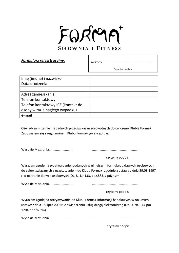 Formularz rejesrtracyjny. Nr karty …………………………………………………………… (wypełnia opiekun) Imię (imona) i nazwisko Data urodzenia Adres zamieszkania Telefon kontaktowy Telefon kontaktowy ICE (kontakt do osoby w razie nagłego wypadku) e-mail Oświadczam, że nie ma żadnych przeciwskazań zdrowotnych do ćwiczeńw Klubie Forma+. Zapoznałem się z regulaminem Klubu Forma+i go akceptuje. Wysokie Maz. dnia........................... .................................................. czytelny podpis Wyrażam zgodę na przetwarzanie, podanych w niniejszym formularzu,dasnych osobowych do celów związanych z uczęszczaniem do Klubu Forma+, zgodnie z ustawą z dnia 29.08.1997 r. o ochronie danych osobowych (Dz. U. Nr 133, poz.883, z późn.zm Wysokie Maz. dnia........................... .................................................. czytelny podpis Wyrażam zgodę na otrzymywanie od Klubu Forma+ informacji handlowych w rozumieniu ustawy z dnia 18 lipca 2002r. o świadczeniu usług drogą elektroniczną (Dz. U. Nr. 144 poz. 1204 z późn. zm) Wysokie Maz. dnia........................... .................................................. czytelny podpis