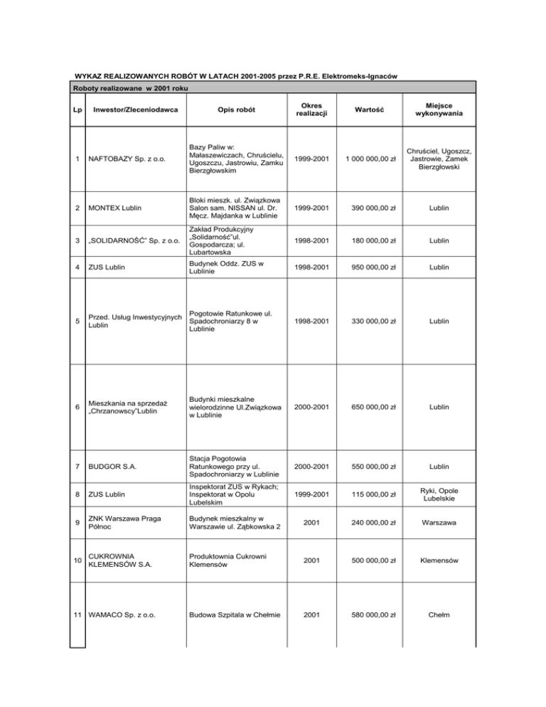 WYKAZ REALIZOWANYCH ROBÓT W LATACH 2001-2005 przez P.R.E. Elektromeks-Ignaców Roboty realizowane w 2001 roku Lp Inwestor/Zleceniodawca Opis robót Okres realizacji Wartość Miejsce wykonywania 1999-2001 1 000 000,00 zł Chruściel, Ugoszcz, Jastrowie, Zamek Bierzgłowski 1 NAFTOBAZY Sp. z o.o. Bazy Paliw w: Małaszewiczach, Chruścielu, Ugoszczu, Jastrowiu, Zamku Bierzgłowskim 2 MONTEX Lublin Bloki mieszk. ul. Związkowa Salon sam. NISSAN ul. Dr. Męcz. Majdanka w Lublinie 1999-2001 390 000,00 zł Lublin 3 „SOLIDARNOŚĆ” Sp. z o.o. Zakład Produkcyjny „Solidarność”ul. Gospodarcza; ul. Lubartowska 1998-2001 180 000,00 zł Lublin 4 ZUS Lublin Budynek Oddz. ZUS w Lublinie 1998-2001 950 000,00 zł Lublin 5 Pogotowie Ratunkowe ul. Przed. Usług Inwestycyjnych Spadochroniarzy 8 w Lublin Lublinie 1998-2001 330 000,00 zł Lublin 6 Mieszkania na sprzedaŜ „Chrzanowscy”Lublin Budynki mieszkalne wielorodzinne Ul.Związkowa w Lublinie 2000-2001 650 000,00 zł Lublin 7 BUDGOR S.A. Stacja Pogotowia Ratunkowego przy ul. Spadochroniarzy w Lublinie 2000-2001 550 000,00 zł Lublin 8 ZUS Lublin Inspektorat ZUS w Rykach; Inspektorat w Opolu Lubelskim 1999-2001 115 000,00 zł Ryki, Opole Lubelskie 9 ZNK Warszawa Praga Północ Budynek mieszkalny w Warszawie ul. Ząbkowska 2 2001 240 000,00 zł Warszawa 10 CUKROWNIA KLEMENSÓW S.A. Produktownia Cukrowni Klemensów 2001 500 000,00 zł Klemensów Budowa Szpitala w Chełmie 2001 580 000,00 zł Chełm 11 WAMACO Sp. z o.o. Roboty realizowane w 2002 roku 12 MONTEX S.A. Budynek mieszkalny wielorodzinny w Warszawie ul. Stawki/Niska 13 NOVABERRY Sp. z o.o. 2001-2002 600 000,00 zł Warszawa Modernizacja zasilania elektroenergetycznego zakładu 2002 220 000,00 zł BełŜyce 14 MONTEX S.A. Budynek mieszkalny z garaŜami podziemnymi przy ul. Letniej w Warszawie 2002 60 000,00 zł Warszawa 15 MONTEX S.A. Budynki mieszkalne przy ul. Lęborskiej, Letniej, Stolarskiej 2002 120 000,00 zł Warszawa Zakład Robót Budowlanych 16 Jacek i Ryszard Litwińscy s.c. Budynek mieszkalny ul. Willowa w Lublinie 2002 580 000,00 zł Lublin 17 MONTEX S.A. Budynek mieszkalny w Warszawie przy ul.Niskiej, Dubois, Stawki 2001-2002 220 000,00 zł Warszawa 18 CUKROWNIA KLEMENSÓW S.A. Transport pneumatyczny cukru z magazynu do pakowni 2002 50 000,00 zł Klemensów 19 Zakład RemontowoBudowlany "HEN-BUD" Modernizacja i remont budynku Obwodowego Urzędu Poczty przy ul.Lubelskiej 3 w Puławach 2002 450 000,00 zł Puławy PPH EMAN - Zakład budowlany we Włocławku Modernizacja instalacji elektrycznych i teletechnicznych dla potrzeb pomieszczeń Ośrodka Endoskopii Klinicznej w budynku CSK WAM Warszawa ul. Szaserów 128 2002 140 000,00 zł Warszawa Remont i modernizacja Kliniki Ortopedii - blok E-2 Vp. 2002 320 000,00 zł Warszawa 20 21 CSK WAM w Warszawie 22 MONTEX S.A. Instalacja elektryczna w budynku mieszkalnym w Warszawie przy ul. Wrzeciono 33. 2002 580 000,00 zł Warszawa 23 Naftobazy Sp. z o.o. Remont instalacji elektrycznej w centralnej pompowni paliw, Baza Paliw nr 15 w Narewce 2002 50 000,00 zł Narewka 24 Exbud Skanska S.A. Rozbudowa i przebudowa Hali Makro w Lublinie przy ul. Chemicznej 5 2002 720 000,00 zł Lublin 25 Naftobazy Sp. z o.o. Remont pomieszczeń i rozdzielni głównej na terenie bazy nr 10 w Kawicach 2002 330 000,00 zł Kawice 26 ZUS Lublin Remont siedziby Oddziału ZUS ul. T. Zana 38C 2002 110 000,00 zł Lublin 27 BUDGOR S.A. Modernizacja Stacji Wodociągowej "Sławinek" w Lublinie ul. Wodna 2 2002 270 000,00 zł Lublin 28 MONTBUD Sp. z o.o. Instalacje elektryczne, komputerowe, teletechniczne i sygnalizacji poŜaru na Oddziale Ratunkowym w Okręgowym Szpitalu Kolejowy S.P. Z.O.Z. w Lublinie 2002 600 000,00 zł Lublin 29 ROTO FRANK Sp. z o.o. Instalacje elektryczne w obiektach firmy ROTO FRANK 2002 180 000,00 zł Lubartów 2002-2003 700 000,00 zł Opole Śląskie Roboty realizowane w 2003 roku 30 Budoster Sp. z o.o. Media-Markt w Opolu 31 WAMACO Sp. z o.o. Modernizacja sanatorium w Nałęczowie 2003 110 000,00 zł Nałęczów Hala Produkcyjna przy ul.Gospodarcza 25 w Lublinie 2003 300 000,00 zł Lublin 32 Firma Cukiernicza "Solidarność" Sp. z o.o. 33 Montel Serwis Sp. z o.o. REAL Warszawa Al. Krakowska 2003 2 500 000,00 zł 34 Optronik Sp. z o.o. Okablowanie strukturalne na obiektach Agencji Restrukturyzacji i Modernizacji Rolnictwa w Lublinie, Opolu i Częstochowie 2003 85 000,00 zł Lublin, Opole , Częstochowa 35 Wójt Gminy Wojciechów Wykonanie oświetlenia ulicznego we wsi Szczuczki 2003 50 000,00 zł Wojciechów Przedsiębiorstwo Budowlano "Zespół Domów 36 Inwestycyjne Litwińscy Sp. z Jednorodzinnych" przy ul. o.o. w Lublinie Choiny w Lublinie 2003 40 000,00 zł Lublin 37 WAMACO Sp. z o.o. Oczyszczalnia Ścieków Hajdów – roboty kablowe 2003 215 000,00 zł Lublin Skanska S.A. w Warszawie 38 Oddział Exbud Budownictwo w Kielcach "Przebudowa grilla Tesco Mory w Warszawie" 2003 115 000,00 zł Warszawa 39 Naftobazy Sp. z o.o Remont instalacji elektrycznej w pompowni ppoŜ. , Baza Paliw nr 10 w Kawicach k/Wrocławia 2003 90 000,00 zł Kawice 40 Dalimex Sp. z o.o. Budynek biurowo-handlowousługowy przy ul. Lubartowskiej 74A w Lublinie 2003 210 000,00 zł Lublin 41 LPBP "Przemysłówka" S.A. Regionalne Centrum Targowo-Wystawiennicze w Lublinie 2003 1 250 000,00 zł Lublin 42 ELEKTROMEKS Sp. zoo Media-Markt w Kielcach 2004 540 000,00 zł Kielce WARBUD S.A. Warszawa 43 MOSiR „Bystrzyca” Lublin Wielofunkcyjna Hala Sportowo-Widowiskowa przy ul. Kazimierza Wielkiego w Lublinie 2003-2004 874 863,00 zł Lublin Siedziba placówki PKO BP S.A. w BełŜycach 2003-2004 76 000,00 zł BełŜyce 45 WAMACO Sp. z o.o. Instalacje elektryczne – adaptacja pomieszczeń dla potrzeb Szpitalnego Oddziału Ratownictwa w Krasnymstawie 2004 114 000,00 zł Krasnystaw 46 Elektromeks Sp. z o.o. Makro w Rzeszowie 2004 4 200 000,00 zł Warszawa Roboty realizowane w 2004 roku 44 LPBP „Przemysłówka” S.A. Bank PKO S.A. Rzeszów 47 LPBP „Przemysłówka” Akademia Medycz