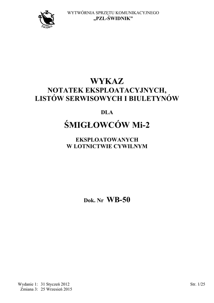 WYTWÓRNIA SPRZĘTU KOMUNIKACYJNEGO „PZL-ŚWIDNIK” WYKAZ NOTATEK EKSPLOATACYJNYCH, LISTÓW SERWISOWYCH I BIULETYNÓW DLA ŚMIGŁOWCÓW Mi-2 EKSPLOATOWANYCH W LOTNICTWIE CYWILNYM Dok. Nr Wydanie 1: 31 Styczeń 2012 Zmiana 3: 25 Wrzesień 2015 WB-50 Str. 1/25 „PZL-ŚWIDNIK” SPIS TREŚCI 1. WYKAZ NOTATEK EKSPLOATACYJNYCH ............................................. 3 2. WYKAZ LISTÓW SERWISOWYCH.............................................................. 6 3. WYKAZ BIULETYNÓW .................................................................................. 7 25 Wrzesień 2015 WB-50 Str. 2/25 „PZL-ŚWIDNIK” Lp. Nr notatki 1. E-1/LS 2. E-2/LS 3. E-3/LS 4. E-4/LC 5. E-5/LC 6. 6/LC 7. E-7/LS 8. 7/LC 9. 8/LC 10. E-9/LC 11. E-10/LC 12. E-11/LC 13. E-12/LC 14. E-13/LC 25 Wrzesień 2015 Dotyczy Obowiązuje Jednorazowego przeglądu Śmigłowce Mi-2 i ewentualnego dopracowania Nr fabr. instalacji elektrycznej ogrzewa50.27.22 nia silników GTD-350. i 50.27.23 Jednorazowej zmiany zabezpieŚmigłowce Mi-2 czenia fotela pasażera obok pilo- WXA,WXB,WXC ta. WXD,WXE,WXF WXG, WXH,PSC, PSF, PSG, SEA Wymiany filtra w instalacji poŚ-ce Mi-2 wietrznej śmigłowca. 50.40.44, 50.40.45 Przeglądu łożysk 704 702K waŚmigłowce Mi-2 łów głównych. WXW, WXU. Przeglądu łożysk 704 702K waŚmigłowce Mi-2 łów głównych. SDH, SDI. Zabudowy instalacji radiotelefo50.42.07 i 08 nu 3001-40. 50.43.0406 Wymiany rur statecznika Nr rys. Ś-ce Mi-2 Nr fabr. 50.13.520.00.00. 50.22.29,50.24.48, 50.24.49,50.27.22 i 50.27.23. Wymiany stron w Opisie technicz- Śmigłowiec Mi-2 nym, instrukcji eksploatacji obsłu53.39.05 gi i użytkowania w locie wyposażenia wersji fotogrametrycznej i termowizyjnej. Wymiany zawieszenia kamery Śmigłowiec Mi-2 AGA-680 na ś-cu. 53.39.05 Jednorazowego przeglądu moŚmigłowce Mi-2 cowania dźwigni od 50.00.01 50.52.213.00.00 na wałku do 50.54.01 50.52.212.00.00 Wymiany sprężyny Śmigłowce Mi-2 50.28.000.11.00 hamulca wirnika 50.54.4350.54.45 nośnego. 50.54.47,50.54.50, 50.55.1650.55.23 i 50.56.12. Przedłużenia okresu ważności Wszystkie śmibiuletynu 2/Mi-2/78. głowce Mi-2 Wymiany nakrętek 3303A-8 śrub Śmigłowce Mi-2 mocujących belkę ogonową z 51.39.06, 51.42.07 kadłubem śmigłowca, 54.45.16,54.45.19 52.52.25, 52.52.27 52.54.45, 53.63.49 Wymiany nakrętek 3327A-14 śrub Śmigłowiec mocujących przekładnię główną Mi-2 do płyty podreduktorowej. 51.70.02 Data wydania Numer zmiany i data Wersje językowe WYKAZ NOTATEK EKSPLOATACYJNYCH 30.04.1973 P 22.02.1974 P 03.07.1975 P 04.08.1975 P 07.08.1975 P 01.12.1975 P 19.04.1973 P 30.03.1976 P 15.04.1976 P 17.01.1978 P 04.05.1978 P 10.07.1979 P, R 17.02.1981 P 03.07.1981 P WB-50 Str. 3/25 „PZL-ŚWIDNIK” Lp. Nr notatki 15. E-14/LC 16. E-15/LC 17. E-16/LC 18. E-17/LC 19. E-19/LC 20. E-20/LC 21. E-21/LC 22. E-22/LC 25 Wrzesień 2015 Dotyczy Obowiązuje Wymiany nakrętek Śmigłowce Mi-2 50.39.000.04.03 zamontowanych 52.69.01 06, na trzonie przekładni tylnej. 51.70.02,51.38.30, 51.39.06 i 25, 51.42.07, 54.43.04 05, 51.43.06 07, 51.44.08, 54.45.16 i 19, 54.45.33,53.45.37. 54.45.38,51.45.39, 51.47.16,52.51.49, 52.52.25 i 27, 51.54.40, 52.54.43 i 45, 52.55.17 i 20 52.56.44. Tymczasowego stosowania oleju Śmigłowce Mi-2 hipoidalnego TS GIP OST-380 eksploatowane 1260-82 jako zamiennika oleju w lotnictwie hipoidalnego GOST 4003-53. CSRS Eksploatacji pyłofiltrów wlotów Śmigłowce Mi-2 z silników Nr rys. 52.30.160.00.00 fabrycznie zamonna śmigłowcach Mi-2. towanymi pyłofiltrami. Eksploatacji śmigłowca z zabu- Śmigłowce Mi-2 z dowaną radiostacją RS-6105 i fabrycznie zatermowentylatorem Nr rys. budowaną radio51.72.130.00.00 oraz bez zabustacją i termowentylatorem dowanego radiokompasu ARK-9. Eksploatacji śmigłowca z dopra- Śmigłowce Mi-2 cowaną instalacją paliwową oraz Nr fabr. bez radiostacji R-842M i instalacji 50.97.01 przeciwoblodzeniowej. i 50.97.02 Czasu lotu w warunkach oblodze- Śmigłowce Mi-2 z nia śmigłowca z zabudowanymi fabrycznie zamonpyłofiltrami. towanymi pyłofiltrami. Dopuszczenia do eksploatacji ś-ca Śmigłowiec Mi-2 Nr fabr. 52.96.35, Nr rejestr Mi-2 SP-SCX, ze zwiększonym biciem Nr fabr. odcinka wału tylnego 52.96.35 50.25.500.00.00. Eksploatacji śmigłowców Mi-2 Śmigłowce Mi-2 użytkowanych w lotnictwie cyindywidualnie wilnym w zakresie 1000 1200 dopuszczone przez Producenta i Orgodz. lotu. gan Nadzoru Data wydania Numer zmiany i data Wersje językowe WYKAZ NOTATEK EKSPLOATACYJNYCH 16.07.1981 P, R 03.06.1985 P, R 10.02.1986 P 10.02.1986 P 10.02.1986 P 03.03.1986 P 27.03.1986 P 15.06.1987 P WB-50 Str. 4/25 Lp. Nr notatki 23. E-23/LC 24. E-24/LC 25. E-25/LC 26. UE-17/D 27. UE-18/D 28. UE-19/D 29. UE-21/H 30. UE-25/D 31. UE-26/D 32. UE-27/D 33. UE-28/D 34. UE-29/D Dotyczy Obowiązuje Jednorazowego sprawdzenia mon- Śmigło ogonowe tażu zawleczki w osi dźwigni Nr fabr. 94007 50.39.120.03.03 łączącej popyzamontowane na chacz z dźwignią obrotu łopaty ś-cu 51.54.41. śmigła ogonowego ś-ca Mi-2. Eksploatacji ś-ców z zabudowaŚmigłowce Mi-2 nym radiokompasem ARK-UD. 50.104.32 41 Nadzorowanej eksploatacji instaŚ-ce Mi-2 lacji olejowej przekładni głównej Nr fabr. WR-2. 50.104.32 41 Dopracowania instalacji elekŚmigłowce Mi-2 z trycznej gaszenia łuku elektrycz- instalacją gaszenia nego na przekaźniku TKJe 52PK. łuku nie dopracowaną w naprawie głównej. Zwiększenia żywotności kalenda- Śmigła ogonowe rzowej dla śmigieł ogonowych. eksploatowane u Użytkownika niemieckiego. Dopracowanie instalacji przeciwŚ-ce Mi-2 pożarowej. 56.28.17, 56.29.45 54.30.48, 56.34.04 Jednorazowego sprawdzenia stanu Łopaty wirnika nośnego Nr fabr. technicznego łopat wirnika no50.389.014, śnego. 50.389.047, 50.389.058 Śmigłowce Mi-2 z Usunięcia korozji pokrycia kadłureflektorami RO ba pod wspornikami reflektora eksploatowane RO wg rys. 50.16.880.00.00. przez użytkownika niemieckiego Wymiany odcinków wału tylnego Śmigłowce Mi-2 50.25.000.00.02 śmigłowca M