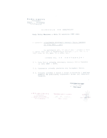 Urzqd Gminy Maszewo 66-614 Maszewo woj. Lubuskie STRATEGIA ROZWOJU GMINY MASZEWO W L A T A C H 2001-2015 Maszewo kwiecień 2001 rok Wprowadzenie Uchwała Uchwała I. Informacje ogólne l. l Gmina Maszewo l .2 Ludność i zatrudnienie l .3 Sieć osadnicza l .4 Zasoby mieszkaniowe II. Stan infrastruktury technicznej 2.1 Zaopatrzenie w wodę 2.2 Gospodarka ściekowa 2.3 Gospodarka odpadami 2.4 Telefonizacja 2.5 Drogi. Gaz. Energia elektryczna III. Infrastruktura społeczna IV. Pozarolnicze funkcje gminy V. Rolnicza przestrzeń gospodarcza VI. Turystyka i agroturystyka VII. Ochrona środowiska VIII. Polityka regionalna - Analiza SWOT – Strategiczne cele rozwoju Karty działań strategicznych – Mapy- Wprowadzenie Strategia rozwoju gminy jest programowaniem jej przyszłego działania, wskazującym kierunki rozwoju gminy. Potrzeba opracowania kierunków przyszłego rozwoju gminy oraz określenia dróg i środków do realizacji celów wynika z konieczności koordynacji i kojarzenia bieŜącej działalności z wieloletnimi poczynaniami inwestycyjnymi samorządu i innych podmiotów gospodarczych na terenie gminy. RównieŜ konieczność oddziaływania na lokalny rynek pracy wymaga nie tylko działań doraźnych (roboty publiczne), ale równieŜ długofalowych ( wspieranie przedsiębiorczości i tworzenie nowych miejsc pracy). Opracowanie strategii rozwoju gminy stanowi równieŜ kluczowe ogniwo prowadzące do oŜywienia działalności lokalnych instytucji, przedsiębiorców i liderów. Strategiczny program rozwoju gminy wytycza cele i kierunki rozwoju, stwarza podstawy do wielokierunkowego i zrównowaŜonego rozwoju w oparciu o lepsze wykorzystanie własnych zasobów i mocnych stron. Równocześnie zapewnia lepsze wykorzystanie środków z budŜetu gminy i ich kojarzenie ze środkami z innych źródeł oraz daje większe moŜliwości ich uzyskania spoza gminy. Określenie moŜliwości i kierunków zmian, w postaci strategicznego planu gospodarczego i społecznego rozwoju gminy, wpływa na oŜywienie przedsiębiorczości, na promocję gminy oraz na przyciąganie inwestorów spoza gminy. Wójt Gminy Maszewo UCHWAŁ A NR 99/01 Zarządu Gminy w Maszewie z dnia 7 lutego 2001 roku w sprawie, powołania zespołu do opracowania Strategii Rozwoju Gminy Maszewo na lata 2001 - 2015 Na podstawie art. 30 ust. l z dnia 8 marca 1990 roku o Samorządzie Gminnym / j. t. Dz. U. z 1996 roku Nr 13, póz. 74 z późn. zm., uchwala się, co następuje: &1. Powołuje się zespół do pracowania Strategii Rozwoju Gminy Maszewo obejmującej okres 2001-2015 rok w składzie: 1 Jan Hołyński - Przewodniczący 2 Jan Hańćka - Zastępca Przewodniczącego 3 Jan Wiśniewski - członek 4.Kazimierz Tucholski - członek 5.Ryszard Rękawek -członek 6.Paweł Galon - członek & 2. Zakres działania obejmuje w szczególności: - ustalenie kierunków i zasad pracy nad strategią, - powołanie zespołów roboczych do sporządzenia inwentaryzacji stanu istniejącego i opracowania kierunków rozwoju gminy z analizą SWOT oraz wyznaczenia koordynatorów opracowań cząstkowych, - wykonywanie funkcji zespołu redakcyjnego w stosunku do przedłoŜonych i opracowanych materiałów branŜowych, & 3. Ustala się termin dla sporządzenia opracowania do dnia 20 marca 2001 roku. & 4. Opracowaną w ramach obowiązków słuŜbowych strategię naleŜy przedłoŜyć Radzie Gminy do uchwalenia w terminie do dnia 25 marca 2001 roku. & 5. Wykonanie uchwały powierza się Przewodniczącemu Zarządu. & 6. Uchwała wchodzi w Ŝycie z dniem podjęcia i podlega podaniu do publicznej wiadomości przez jej rozplakatowanie. Przewodniczący Jan Wołyński Załącznik Nr l do Uchwały Zarządu Nr 99\01 z dnia 7 lutego 2001 roku SKŁAD ZESPOŁU OPRACOWUJĄCEGO POSZCZEGÓLNE ELEMENTY STRATEGII: Opracowanie redakcyjne całości dokumentów: 1. Jan Hołyński 2. Paweł Galon 3. Ryszard Rękawek 4. Jan Hańćka Opracowanie map i wykresów stanowiących załączniki: 1. Jan Wiśniewski 2. Roman Rękawek Opracowanie strategii infrastruktury technicznej i gospodarczej: 1. Jan Hołyński 2. Jan Hańćka 3. Paweł Galon Opracowanie rozwoju rolnictwa i leśnictwa: 1. Roman Rękawek 2. Ryszard Rękawek 3. Stanisław Skowroński Polityka socjalna, edukacja, kultura, zdrowie, sport i bezpieczeństwo: 1. Krystyna Stempel 2. Stanisław Butkiewicz 3. Ryszard Rękawek 4. Ewa Strakszyc Zagospodarowanie przestrzenne, środowisko naturalne, warunki kulturowe, promocja i informacja: 1. Jan Wiśniewski 2. Jan Hańćka Analiza SWOT, cele główne i operacyjne: 1. Jan Hańćka 2. Paweł Galon 3. Kazimierz Tucholski Badania ankietowe, konsultacje z mieszkańcami, spotkania: 1. Jan Wiśniewski 2. Jan Łysoń 3. Adam Szymański Diagnoza gminy – ludność i obszar: 1. Jan Wiśniewski 2. Urszula Aleksiun Koordynator: Pani Alicja Śledź UCHWAŁA NR RADY GMINY MASZEWO Z DNIA 24 kwietnia 2001 w sprawie: Opracowania strategii rozwoju Gminy Maszewo na lata 2001-2015 Na podstawie art. 30 ust. l ustawy z dnia 8 marca 1990 roku o samorządzie gminnym j.t. Dz. U. z 1990 roku Nr. 13 póz. 74 z póz. zm. uchwala się, co następuje: & l. Rada Gminy uchwala „Strategię rozwoju Gminy Maszewo na lata 2001-2015" & 2. Wykonanie uchwały powierza się Zarządowi Gminy. & 3. Uchwała wchodzi w Ŝycie po upływie 14 dni od dnia ogłoszenia i podlega podaniu do publicznej wiadomości przez jej rozplakatowanie. I. Informacje ogólne. 1.1 Gmina Maszewo. Gmina Maszewo połoŜona jest w środkowo-zachodniej części województwa lubuskiego i zalicza się do grupy gmin duŜych powierzchniowo (214 km2 ), co przy ludności j ą zamieszkującej ( 3.097 1999 rok) posiada najniŜsze zaludnienie. Cecha, która wyróŜnia gminę w skali województwa jest jej bardzo duŜe zalesienie, wynoszące 66,3% powierzchni, przy czym województwo 48,9%. Administracyjnie gmina połoŜona jest w powiecie krośnieńskim. Graniczy z następującymi gminami: - od zachodu z gminą Cybinka; - od północy z gminą Torzym; - od wscho