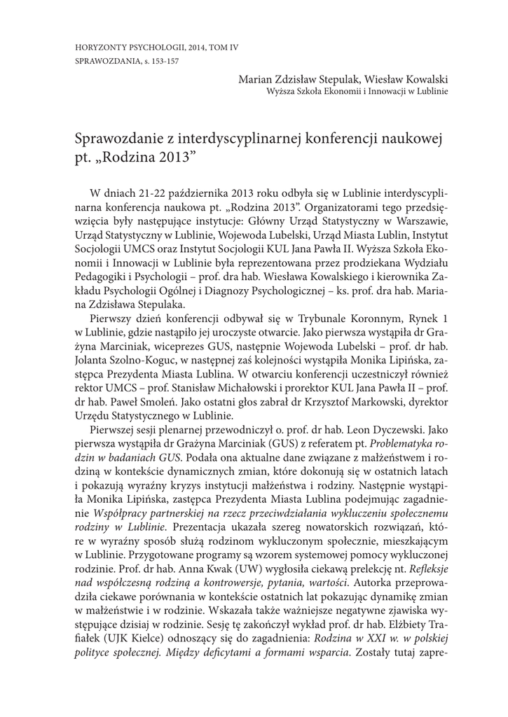 HORYZONTY PSYCHOLOGII, 2014, TOM IV SPRAWOZDANIA, s. 153-157 Marian Zdzisław Stepulak, Wiesław Kowalski Wyższa Szkoła Ekonomii i Innowacji w Lublinie Sprawozdanie z interdyscyplinarnej konferencji naukowej pt. „Rodzina 2013” W dniach 21-22 października 2013 roku odbyła się w Lublinie interdyscyplinarna konferencja naukowa pt. „Rodzina 2013”. Organizatorami tego przedsięwzięcia były następujące instytucje: Główny Urząd Statystyczny w Warszawie, Urząd Statystyczny w Lublinie, Wojewoda Lubelski, Urząd Miasta Lublin, Instytut Socjologii UMCS oraz Instytut Socjologii KUL Jana Pawła II. Wyższa Szkoła Ekonomii i Innowacji w Lublinie była reprezentowana przez prodziekana Wydziału Pedagogiki i Psychologii – prof. dra hab. Wiesława Kowalskiego i kierownika Zakładu Psychologii Ogólnej i Diagnozy Psychologicznej – ks. prof. dra hab. Mariana Zdzisława Stepulaka. Pierwszy dzień konferencji odbywał się w Trybunale Koronnym, Rynek 1 w Lublinie, gdzie nastąpiło jej uroczyste otwarcie. Jako pierwsza wystąpiła dr Grażyna Marciniak, wiceprezes GUS, następnie Wojewoda Lubelski – prof. dr hab. Jolanta Szolno-Koguc, w następnej zaś kolejności wystąpiła Monika Lipińska, zastępca Prezydenta Miasta Lublina. W otwarciu konferencji uczestniczył również rektor UMCS – prof. Stanisław Michałowski i prorektor KUL Jana Pawła II – prof. dr hab. Paweł Smoleń. Jako ostatni głos zabrał dr Krzysztof Markowski, dyrektor Urzędu Statystycznego w Lublinie. Pierwszej sesji plenarnej przewodniczył o. prof. dr hab. Leon Dyczewski. Jako pierwsza wystąpiła dr Grażyna Marciniak (GUS) z referatem pt. Problematyka rodzin w badaniach GUS. Podała ona aktualne dane związane z małżeństwem i rodziną w kontekście dynamicznych zmian, które dokonują się w ostatnich latach i pokazują wyraźny kryzys instytucji małżeństwa i rodziny. Następnie wystąpiła Monika Lipińska, zastępca Prezydenta Miasta Lublina podejmując zagadnienie Współpracy partnerskiej na rzecz przeciwdziałania wykluczeniu społecznemu rodziny w Lublinie. Prezentacja ukazała szereg nowatorskich rozwiązań, które w wyraźny sposób służą rodzinom wykluczonym społecznie, mieszkającym w Lublinie. Przygotowane programy są wzorem systemowej pomocy wykluczonej rodzinie. Prof. dr hab. Anna Kwak (UW) wygłosiła ciekawą prelekcję nt. Refleksje nad współczesną rodziną a kontrowersje, pytania, wartości. Autorka przeprowadziła ciekawe porównania w kontekście ostatnich lat pokazując dynamikę zmian w małżeństwie i w rodzinie. Wskazała także ważniejsze negatywne zjawiska występujące dzisiaj w rodzinie. Sesję tę zakończył wykład prof. dr hab. Elżbiety Trafiałek (UJK Kielce) odnoszący się do zagadnienia: Rodzina w XXI w. w polskiej polityce społecznej. Między deficytami a formami wsparcia. Zostały tutaj zapre- 154 M. Z. Stepulak, W. Kowalski, Sprawozdanie z interdyscyplinarnej konferencji naukowej pt. „Rodzina 2013” HORYZONTY PSYCHOLOGII, 2014, TOM IV – SPRAWOZDANIA zentowane szanse, ale również zagrożenia dotyczące realizacji polityki społecznej wobec polskiej rodziny. Drugiej sesji plenarnej przewodniczyła prof. dr hab. Biruta Skrętowicz (UMCS). Pierwszy referat został wygłoszony przez Lucynę Nowak (GUS) i dotyczył zagadnienia przemiany w formowaniu się polskich rodzin w latach 2002-2011 w świetle wyników spisów ludności. Zostały tutaj w bardzo czytelny sposób ukazane istotne zmiany w strukturze i funkcjonowaniu rodziny w przedziale ostatniego dziesięciolecia. Bardzo oryginalny wykład przedłożył ks. dr hab. Janusz Balicki, prof. UKSW. Wystapienie dotyczyło tematu: Rodziny w zderzeniu kultur. Autor przedstawił wyniki badań, które przeprowadził na jednej z uczelni angielskich. Badania ukształtowano jako porównawcze studium studentów islamskich z Wielkiej Brytanii i próby polskiej dotyczące małżeństwa i rodziny. Na tym tle można było zauważyć istotne różnice kulturowe i religijne. Ostatni referat w tej sesji dotyczył feminizacji emigracji, którego autorem była prof. dr hab. Zofia Kawczyńska-Butrym (UMCS). Autorka ukazała z socjologicznego punktu widzenia przyczyny i konsekwencje migracji zarobkowej kobiet. Drugi dzień konferencji odbywał się w Katolickim Uniwersytecie Lubelskim Jana Pawła II. Na początku sesji plenarnej gości powitał Krzysztof Hetman, Marszałek Województwa Lubelskiego, a jako pierwsza wystąpiła Switłana Zymowina, naczelnik GUS w Obwodzie Lwowskim z prelekcją na temat: Sytuacja demograficzna w obwodzie lwowskim. Zostały tutaj przedstawione aktualne trendy odnoszące się do życia rodzinnego w kontekście demograficznym. Następnie głos zabrał Georgij Chwałko, naczelnik GUS Obwodu Brzeskiego, który mówił o rodzinie w badaniach statystycznych Republiki Białoruś. Podobne w treści wystąpienie przedstawiła Lilia Baraniuk, pierwszy zastępca naczelnika GUS w Obwodzie Wołyńskim. Oba wystąpienia dotyczyły aktualnych danych statystycznych w odniesieniu do małżeństw i rodzin w obu Obwodach. Pierwsza sesja panelowa z panelem 1. odbyła się pod przewodnictwem dra hab. Wojciecha Misztala (UMCS). Organizatorzy opracowali streszczenie tej sesji, nadając jej tytuł: Mobilność rodziny. A oto treść tego streszczenia: Nasilająca się mobilność populacji wpływa na zmiany położenia społecznego i na funkcjonowanie rodziny oraz jej członków czynnie lub biernie uczestniczących w migracji. Zmiany te dostrzegane są w rodzinach żyjących w kraju przyjmującym, których członkowie zderzają się z obcymi sobie kodami kulturowymi i gdy, zwłaszcza kobiety, podejmują prace poniżej kompetencji i w warunkach poniżej społecznych i ekonomicznych standardów zatrudnienia. Zmiany te obserwowane są także w tych rodzinach, które pozostały w kraju i których tylko poszczególni członkowie wyjechali. Dotyczą one całej rodziny, gdyż wyjazd, szczególnie rodziców, powoduje