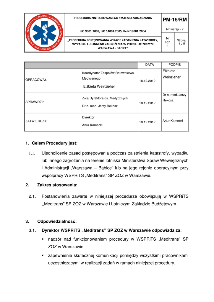 PROCEDURA ZINTEGROWANEGO SYSTEMU ZARZĄDZANIA ISO 9001:2008, ISO 14001:2005,PN-N 18001:2004 „PROCEDURA POSTĘPOWANIA W RAZIE ZAISTNIENIA KATASTROFY, WYPADKU LUB INNEGO ZAGROŻENIA W PORCIE LOTNICZYM WARSZAWA - BABICE” DATA Medycznego Nr wersji - 2 Nr egz. 1 Strona 1z5 PODPIS Elżbieta Koordynator Zespołów Ratownictwa OPRACOWAŁ PM-15/RM Weinzieher 18.12.2012 Elżbieta Weinzieher Dr n. med. Jerzy Z-ca Dyrektora ds. Medycznych SPRAWDZIŁ Dr n. med. Jerzy Rekosz 18.12.2012 Rekosz Dyrektor ZATWIERDZIŁ Artur Kamecki 18.12.2012 Artur Kamecki 1. Celem Procedury jest: 1.1. Ujednolicenie zasad postępowania podczas zaistnienia katastrofy, wypadku lub innego zagrożenia na terenie lotniska Ministerstwa Spraw Wewnętrznych i Administracji „Warszawa – Babice” lub na jego rejonie operacyjnym przy współpracy WSPRiTS „Meditrans” SP ZOZ w Warszawie. 2. 2.1. Zakres stosowania: Postanowienia zawarte w niniejszej procedurze obowiązują w WSPRiTS ,,Meditrans” SP ZOZ w Warszawie i Lotniczym Zakładzie Budżetowym. 3. 3.1. Odpowiedzialność: Dyrektor WSPRiTS „Meditrans” SP ZOZ w Warszawie odpowiada za: nadzór nad funkcjonowaniem procedury w WSPRiTS „Meditrans” SP ZOZ w Warszawie. zapewnienie skutecznej komunikacji pomiędzy wszystkimi pracownikami uczestniczącymi w realizacji zadań w ramach niniejszej procedury. PM-15/RM PROCEDURA ZINTEGROWANEGO SYSTEMU ZARZĄDZANIA „PROCEDURA POSTĘPOWANIA W RAZIE ZAISTNIENIA KATASTROFY, WYPADKU LUB INNEGO ZAGROŻENIA W PORCIE LOTNICZYM WARSZAWA - BABICE” 3.2. Wersja 2 Strona 2z5 Pracownicy WSPRiTS „Meditrans” SP ZOZ w Warszawie odpowiada za (ujęci w trybie postępowania): odpowiadają za realizację zadań określonych w trybie postępowania niniejszej Procedury adekwatnie do posiadanych zakresów obowiązków, uprawnień i odpowiedzialności. 4. Terminologia: 4.1. AFIS - Dyżurny informacji powietrznej, 4.2. CD – Centrum Dyspozytorskie, 4.3. DG - Dyspozytor Główny, 4.4. EPBC – Wg ICAO Wskaźnik Lotniska Warszawa-Babice, 4.5. LZB – Lotniczy Zakład Budżetowy, 4.6. OPRL – Operacyjny Plan Ratownictwa Lotniskowego, 4.7. SRL – Sekcja Ratownictwa Lotniskowego, 4.8. KMT – Koordynator Medyczny Tymczasowy, 4.9. KMM – Koordynator Medyczny Mianowany, 4.10. KDR – Koordynator Działań Ratowniczych, 4.11. WSPRiTS „Meditrans”- Wojewódzka Stacja Pogotowia Ratunkowego i Transportu Sanitarnego „Meditrans” Samodzielny Publiczny Zakład Opieki Zdrowotnej w Warszawie, 4.12. Wypadek masowy ratowniczych - zdarzenie przekraczających wymagające możliwości zaangażowania podmiotów sił ratowniczych w danym Rejonie Operacyjnym, 4.13. Katastrofa - nadzwyczajne zdarzenie wynikłe z przyczyn technicznych lub naturalnych wymagające wprowadzenia specjalnych zasad zarządzania oraz użycia sił i środków w ilościach znacznie przekraczających możliwości Rejonu Operacyjnego, 4.14. Zespół Ratownictwa Medycznego – wyróżniamy dwa rodzaje zespołów wyjazdowych: zespoły specjalistyczne „S”, w skład których wchodzą co najmniej trzy osoby uprawnione do wykonywania medycznych czynności ratunkowych, PROCEDURA ZINTEGROWANEGO SYSTEMU ZARZĄDZANIA „PROCEDURA POSTĘPOWANIA W RAZIE ZAISTNIENIA KATASTROFY, WYPADKU LUB INNEGO ZAGROŻENIA W PORCIE LOTNICZYM WARSZAWA - BABICE” PM-15/RM Wersja 2 Strona 3z5 w tym lekarz systemu oraz pielęgniarka systemu lub ratownik medyczny (Dz.U.06.191.1410 ), zespoły podstawowe „P”, w skład których wchodzą co najmniej dwie osoby uprawnione do wykonywania medycznych czynności ratunkowych, w tym pielęgniarka systemu lub ratownik medyczny (Dz.U.06.191.1410 ). 4.15. Wyznaczony pracownik – pielęgniarka, ratownik medyczny, sanitariusz ambulansu w Rejonach Operacyjnych, gdzie on stacjonuje, 5. Tryb postępowania: Procedura została opracowana zgodnie z porozumieniem zawartym pomiędzy Lotniczym Zakładem Budżetowym MSWiA „Lotnisko Warszawa – Babice” a Wojewódzką Stacją Pogotowia Ratunkowego i Transportu Sanitarnego SP ZOZ w Warszawie. W celu określenia i uściślenia zasad współpracy pomiędzy WSPRiTS „Meditrans” SP ZOZ w Warszawie a służbami dyżurnymi LZB w zakresie prawidłowej organizacji i prowadzenia działań ratowniczych podczas zdarzenia lotniczego lub innego zdarzenia powodującego zagrożenie dla zdrowia i życia ludzi na terenie i w rejonie operacyjnym lotniska ustala się co następuje: 5.1. Dyżurny informacji powietrznej AFIS nakazuje dyspozytorowi lotniczemu będącemu koordynatorem działań ratowniczych powiadomić o zdarzeniu: a. sekcję ratownictwa lotniskowego – Tel. w. 333, b. koordynatora ruchu naziemnego – Tel. w 115, c. państwową straż pożarną – Tel. 998, d. lotnicze pogotowie ratunkowe – Tel. 22 568 – 19 – 99, 22 568 – 19 – 98 (dyspozytor krajowy), e. pogotowie ratunkowe - Tel. 999, f. zaalarmować ośrodki koordynacji poszukiwań i ratownictwa lotniczego statku powietrznym będącego w stanie zagrożenia 6 – 828 911. PM-15/RM PROCEDURA ZINTEGROWANEGO SYSTEMU ZARZĄDZANIA „PROCEDURA POSTĘPOWANIA W RAZIE ZAISTNIENIA KATASTROFY, WYPADKU LUB INNEGO ZAGROŻENIA W PORCIE LOTNICZYM WARSZAWA - BABICE” Wersja 2 Strona 4z5 Koordynator działań ratowniczych musi upewnić się o przyjęciu zgłoszenia, a dyspozytor WSPRiTS „Meditrans” SP ZOZ w Warszawie potwierdzić przyjęcie zgłoszenia o zdarzeniu. Istnieje możliwość bezpośredniego powiadomienia stanowiska CD przy WSPRiTS „Meditrans” SP ZOZ w Warszawie. 5.2. Dyżurny informacji powietrznej AFIS określa w zgłoszeniu rodzaj zdarzenia, miejsce zdarzenia oraz ilość osób znajdujących się w zagrożeniu, 5.3. W razie zdarzenia lotniczego KMT do czasu przybycia Kierownika Zespołu Ratownictwa Medycznego jest strażak ze służby ratownictwa lotniczego, 5.4. Funkcję KMM na terenie lotniska Warszawa – Babice obejmuje uprawniony kierownik pierwszego przybyłego na miejsce zdarzenia zespołu specjalistycznego „S” ratownictwa medycznego WSPRiTS „Meditr