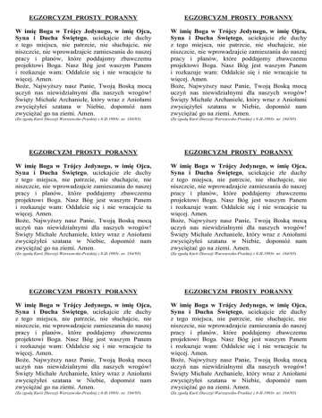 EGZORCYZM PROSTY PORANNY EGZORCYZM PROSTY PORANNY W imię Boga w Trójcy Jedynego, w imię Ojca, Syna i Ducha Świętego, uciekajcie złe duchy z tego miejsca, nie patrzcie, nie słuchajcie, nie niszczcie, nie wprowadzajcie zamieszania do naszej pracy i planów, które poddajemy zbawczemu projektowi Boga. Nasz Bóg jest waszym Panem i rozkazuje wam: Oddalcie się i nie wracajcie tu więcej. Amen. Boże, Najwyższy nasz Panie, Twoją Boską mocą uczyń nas niewidzialnymi dla naszych wrogów! Święty Michale Archaniele, który wraz z Aniołami zwyciężyłeś szatana w Niebie, dopomóż nam zwyciężać go na ziemi. Amen. W imię Boga w Trójcy Jedynego, w imię Ojca, Syna i Ducha Świętego, uciekajcie złe duchy z tego miejsca, nie patrzcie, nie słuchajcie, nie niszczcie, nie wprowadzajcie zamieszania do naszej pracy i planów, które poddajemy zbawczemu projektowi Boga. Nasz Bóg jest waszym Panem i rozkazuje wam: Oddalcie się i nie wracajcie tu więcej. Amen. Boże, Najwyższy nasz Panie, Twoją Boską mocą uczyń nas niewidzialnymi dla naszych wrogów! Święty Michale Archaniele, który wraz z Aniołami zwyciężyłeś szatana w Niebie, dopomóż nam zwyciężać go na ziemi. Amen. (Za zgodą Kurii Diecezji Warszawsko-Praskiej z 8-II-1993r. nr. 184/93) (Za zgodą Kurii Diecezji Warszawsko-Praskiej z 8-II-1993r. nr. 184/93) EGZORCYZM PROSTY PORANNY EGZORCYZM PROSTY PORANNY W imię Boga w Trójcy Jedynego, w imię Ojca, Syna i Ducha Świętego, uciekajcie złe duchy z tego miejsca, nie patrzcie, nie słuchajcie, nie niszczcie, nie wprowadzajcie zamieszania do naszej pracy i planów, które poddajemy zbawczemu projektowi Boga. Nasz Bóg jest waszym Panem i rozkazuje wam: Oddalcie się i nie wracajcie tu więcej. Amen. Boże, Najwyższy nasz Panie, Twoją Boską mocą uczyń nas niewidzialnymi dla naszych wrogów! Święty Michale Archaniele, który wraz z Aniołami zwyciężyłeś szatana w Niebie, dopomóż nam zwyciężać go na ziemi. Amen. W imię Boga w Trójcy Jedynego, w imię Ojca, Syna i Ducha Świętego, uciekajcie złe duchy z tego miejsca, nie patrzcie, nie słuchajcie, nie niszczcie, nie wprowadzajcie zamieszania do naszej pracy i planów, które poddajemy zbawczemu projektowi Boga. Nasz Bóg jest waszym Panem i rozkazuje wam: Oddalcie się i nie wracajcie tu więcej. Amen. Boże, Najwyższy nasz Panie, Twoją Boską mocą uczyń nas niewidzialnymi dla naszych wrogów! Święty Michale Archaniele, który wraz z Aniołami zwyciężyłeś szatana w Niebie, dopomóż nam zwyciężać go na ziemi. Amen. (Za zgodą Kurii Diecezji Warszawsko-Praskiej z 8-II-1993r. nr. 184/93) (Za zgodą Kurii Diecezji Warszawsko-Praskiej z 8-II-1993r. nr. 184/93) EGZORCYZM PROSTY PORANNY EGZORCYZM PROSTY PORANNY W imię Boga w Trójcy Jedynego, w imię Ojca, Syna i Ducha Świętego, uciekajcie złe duchy z tego miejsca, nie patrzcie, nie słuchajcie, nie niszczcie, nie wprowadzajcie zamieszania do naszej pracy i planów, które poddajemy zbawczemu projektowi Boga. Nasz Bóg jest waszym Panem i rozkazuje wam: Oddalcie się i nie wracajcie tu więcej. Amen. Boże, Najwyższy nasz Panie, Twoją Boską mocą uczyń nas niewidzialnymi dla naszych wrogów! Święty Michale Archaniele, który wraz z Aniołami zwyciężyłeś szatana w Niebie, dopomóż nam zwyciężać go na ziemi. Amen. W imię Boga w Trójcy Jedynego, w imię Ojca, Syna i Ducha Świętego, uciekajcie złe duchy z tego miejsca, nie patrzcie, nie słuchajcie, nie niszczcie, nie wprowadzajcie zamieszania do naszej pracy i planów, które poddajemy zbawczemu projektowi Boga. Nasz Bóg jest waszym Panem i rozkazuje wam: Oddalcie się i nie wracajcie tu więcej. Amen. Boże, Najwyższy nasz Panie, Twoją Boską mocą uczyń nas niewidzialnymi dla naszych wrogów! Święty Michale Archaniele, który wraz z Aniołami zwyciężyłeś szatana w Niebie, dopomóż nam zwyciężać go na ziemi. Amen. (Za zgodą Kurii Diecezji Warszawsko-Praskiej z 8-II-1993r. nr. 184/93) (Za zgodą Kurii Diecezji Warszawsko-Praskiej z 8-II-1993r. nr. 184/93)