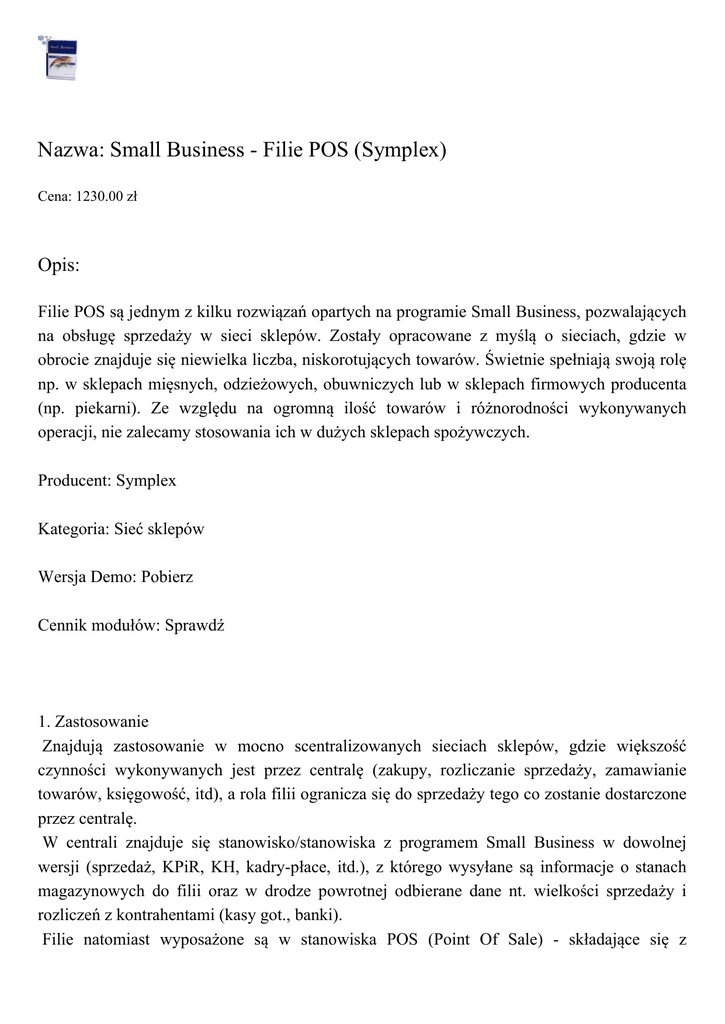 Nazwa: Small Business - Filie POS (Symplex) Cena: 1230.00 zł Opis: Filie POS są jednym z kilku rozwiązań opartych na programie Small Business, pozwalających na obsługę sprzedaży w sieci sklepów. Zostały opracowane z myślą o sieciach, gdzie w obrocie znajduje się niewielka liczba, niskorotujących towarów. Świetnie spełniają swoją rolę np. w sklepach mięsnych, odzieżowych, obuwniczych lub w sklepach firmowych producenta (np. piekarni). Ze względu na ogromną ilość towarów i różnorodności wykonywanych operacji, nie zalecamy stosowania ich w dużych sklepach spożywczych. Producent: Symplex Kategoria: Sieć sklepów Wersja Demo: Pobierz Cennik modułów: Sprawdź 1. Zastosowanie Znajdują zastosowanie w mocno scentralizowanych sieciach sklepów, gdzie większość czynności wykonywanych jest przez centralę (zakupy, rozliczanie sprzedaży, zamawianie towarów, księgowość, itd), a rola filii ogranicza się do sprzedaży tego co zostanie dostarczone przez centralę. W centrali znajduje się stanowisko/stanowiska z programem Small Business w dowolnej wersji (sprzedaż, KPiR, KH, kadry-płace, itd.), z którego wysyłane są informacje o stanach magazynowych do filii oraz w drodze powrotnej odbierane dane nt. wielkości sprzedaży i rozliczeń z kontrahentami (kasy got., banki). Filie natomiast wyposażone są w stanowiska POS (Point Of Sale) - składające się z komputera, drukarki fiskalnej i programu Small Business. 2. Działanie Poniższy schemat obrazuje tryb pracy w sieci sklepów posługującymi się filiami POS. Poszczególne etapy opisanie są poniżej. Zakupy centrali - centrala dokonuje zakupów towarów. Za pomocą faktury zakupu wprowadza je do magazyny głównego (Magazyn 0) lub magazynów filii (Magazyn 1, 2, ...). Dokumenty MM - towary z magazynu głównego dokumentami przesunięcia międzymagazynowego (MM) mogą być przesunięte do magazynów odpowiadających poszczególnym filiom. Eksport magazynu - po wprowadzeniu towarów do magazynów filii, należy je wyeksportować: Filie -> Eksport/Import magazynów. Można w tym momencie zadecydować czy wyeksportowane będą magazyny do wszystkich filii czy wybiórczo. Każdy z magazynów zostaje zapisany w postaci pliku o nazwie: Filiamag.XXX, gdzie XXX oznacza numer magazynu/filii. Import magazynu - w filii następuje wczytanie magazynu nadesłanego przez centralę: Filie -> Eksport/Import magazynów. Magazyn 0 zostaje w tym momencie zaktualizowany. Poprawność importu można sprawdzić w tabeli: Raport z importu magazynu (opis poniżej). Eksport sprzedaży - w ustalonym momencie (np. na koniec dnia), w filii wykonuje się wysyłkę informacji o dokonanej sprzedaży: Filie -> Eksport/Import sprzedaży. Paragony oraz faktury sprzedaży zostają wyeksportowane do centrali. Dane o sprzedaży zapisywane są w pliku: FilRRMM.XXX, gdzie RR oznacza rok, MM numer miesiąca, XXX numer filii. Import sprzedaży - centrala wczytuje nadesłane informacje z filii: Filie -> Eksport/Import sprzedaży. Paragony i faktury zostają odpisane z magazynu właściwego danej filii, dokumenty KP/KW, wpłaty i wypłaty na konto zostają odnotowane we właściwej kasie/koncie bankowym. Zakupy własne filii - filia posiada możliwość dokonywania zakupów do założonego przez siebie magazynu (innego niż Magazyn 0). Informacje o zakupach i sprzedaży dot. takiego magazynu eksportowane są do centrali, ale traktowane są jako wpisy ręczne. Ograniczone zakupy filii - filia posiada możliwość dokonywania zakupów i wprowadzania ich do magazynu 0 (głównego), przy czym nie mogą to być nowe towary lecz tylko istniejące (przysłane z centrali). Dokumenty RW/PW - podczas eksportu danych do centrali wysyłane są również dokumentu RW/PW wpływające na stan magazymu głównego w filii. Żądanie przecen - możliwość zażądania dokonania przeceny towarów przez filię. Do tworzenia i wysyłania żądań służy tabela w menu Filie pt.: Żądanie dokonania przeceny. Po stronie centrali ta sama tabela służy do odbierania żądań z filii i nanoszenia zmian cen w magazynie (opis poniżej). Inwentura - przesłanie protokołu różnic z programu pracującego w filii do programu w centrali (opis poniżej). 3. Raport z importu magazynu. Wszelkie zmiany naniesione w magazynie 0 zostaną odzwierciedlone w tabeli: Raport z importu magazynu z rozbiciem na poszczególne towary. Mówimy tu oczywiście o zmianach zasadniczych dla pracy filii, czyli o zmianach cen, stawek VAT i wprowadzeniu nowego towaru. Informacje na temat modyfikacji poszczególnych towarów odnotowane zostają w polu opis, które może przyjąć trzy wartości: Nowy, Cena i VAT. Dodatkowo w raporcie dostępna jest opcja drukowania etykiet co umożliwia szybkie wydrukowanie etykiet bądź przywieszek dla towarów nowych i zmienionych. Raport został wyposażony w opcję porównującą zmiany wprowadzone w towarze, ze stanem poprzednim. Informacje wyświetlają się w dodatkowym okienku wywoływanym klawiszem F4. 4. Żądanie przeceny. Możliwość zażądania dokonania przeceny towarów przez filię i wysłania go do centrali. Do tworzenia i wysyłania żądań służy tabela w menu Filie pt.: Żądanie dokonania przeceny. Po stronie centrali ta sama tabela służy do odbierania żądań z filii i nanoszenia zmian cen w magazynie (klawisze F6 Odpisz wybraną, F7 Odpisz wszystkie). Kolejność postępowania: Pracownik w filii wprowadza do tabeli (klawisz F5 Nowa przecena) towary z magazynu 0 wprowadzając sugerowaną cenę sprzedaży. Dodatkowo może wprowadzić datę od jakiej ma zacząć obowiązywać dana przecena. Przy pomocy klawisza F9 Wyślij, wysyłane są wszystkie pozycje z tabeli, z wyjątkiem tych, które mają założoną blokadę. Blokadę wysyłki można zastosować wobec towarów co do których ceny nie jesteśmy jeszcze pewni. W centrali po naciśnięciu klawisza F9 Odbierz wczytują się wszystkie nadesłane pozycje, które różnią się cenami od