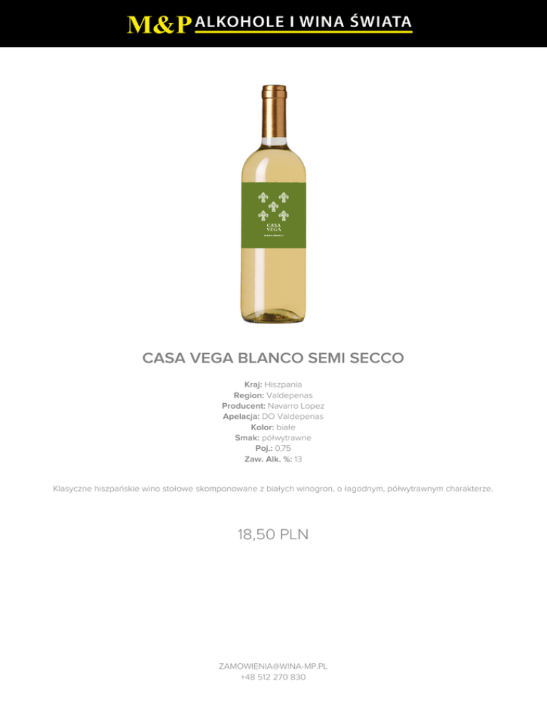CASA VEGA BLANCO SEMI SECCO Kraj: Hiszpania Region: Valdepenas Producent: Navarro Lopez Apelacja: DO Valdepenas Kolor: białe Smak: półwytrawne Poj.: 0,75 Zaw. Alk. %: 13 Klasyczne hiszpańskie wino stołowe skomponowane z białych winogron, o łagodnym, półwytrawnym charakterze. 18,50 PLN [email protected] +48 512 270 830