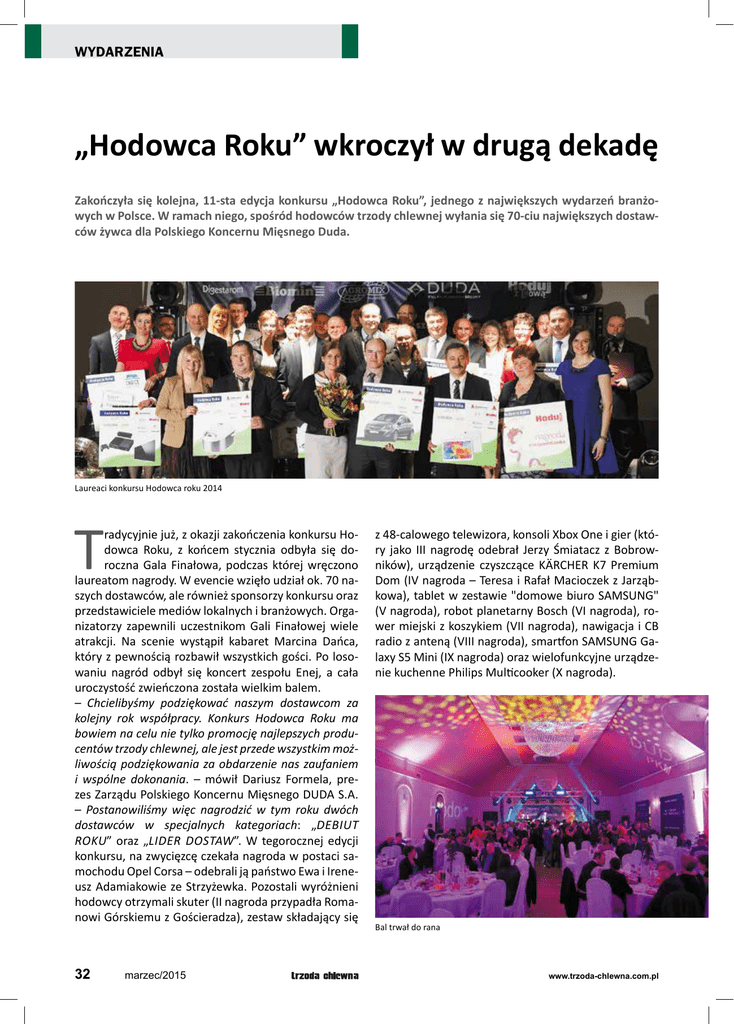 WYDARZENIA „Hodowca Roku” wkroczył w drugą dekadę Zakończyła się kolejna, 11-sta edycja konkursu „Hodowca Roku”, jednego z największych wydarzeń branżowych w Polsce. W ramach niego, spośród hodowców trzody chlewnej wyłania się 70-ciu największych dostawców żywca dla Polskiego Koncernu Mięsnego Duda. Laureaci konkursu Hodowca roku 2014 T radycyjnie już, z okazji zakończenia konkursu Hodowca Roku, z końcem stycznia odbyła się doroczna Gala Finałowa, podczas której wręczono laureatom nagrody. W evencie wzięło udział ok. 70 naszych dostawców, ale również sponsorzy konkursu oraz przedstawiciele mediów lokalnych i branżowych. Organizatorzy zapewnili uczestnikom Gali Finałowej wiele atrakcji. Na scenie wystąpił kabaret Marcina Dańca, który z pewnością rozbawił wszystkich gości. Po losowaniu nagród odbył się koncert zespołu Enej, a cała uroczystość zwieńczona została wielkim balem. – Chcielibyśmy podziękować naszym dostawcom za kolejny rok współpracy. Konkurs Hodowca Roku ma bowiem na celu nie tylko promocję najlepszych producentów trzody chlewnej, ale jest przede wszystkim możliwością podziękowania za obdarzenie nas zaufaniem i wspólne dokonania. – mówił Dariusz Formela, prezes Zarządu Polskiego Koncernu Mięsnego DUDA S.A. – Postanowiliśmy więc nagrodzić w tym roku dwóch dostawców w specjalnych kategoriach: „DEBIUT ROKU” oraz „LIDER DOSTAW”. W tegorocznej edycji konkursu, na zwycięzcę czekała nagroda w postaci samochodu Opel Corsa – odebrali ją państwo Ewa i Ireneusz Adamiakowie ze Strzyżewka. Pozostali wyróżnieni hodowcy otrzymali skuter (II nagroda przypadła Romanowi Górskiemu z Gościeradza), zestaw składający się 32 marzec/2015 z 48-calowego telewizora, konsoli Xbox One i gier (który jako III nagrodę odebrał Jerzy Śmiatacz z Bobrowników), urządzenie czyszczące KÄRCHER K7 Premium Dom (IV nagroda – Teresa i Rafał Macioczek z Jarząbkowa), tablet w zestawie "domowe biuro SAMSUNG" (V nagroda), robot planetarny Bosch (VI nagroda), rower miejski z koszykiem (VII nagroda), nawigacja i CB radio z anteną (VIII nagroda), smartfon SAMSUNG Galaxy S5 Mini (IX nagroda) oraz wielofunkcyjne urządzenie kuchenne Philips Multicooker (X nagroda). Bal trwał do rana www.trzoda-chlewna.com.pl Galę uatrakcyjnił występ mażoretek Wręczenie zwycięzcom tak znakomitych nagród nie byłoby możliwe bez wsparcia sponsorów i partnerów. W tegorocznej edycji sponsorem generalnym wydarzenia została spółka Cedrob. Sponsorem srebrnym został Choice Genetics (lider w genetyce trzody chlewnej Marcin Daniec Koncert zespołu Enej w Polsce) oraz BIOMIN (prozdrowotne dodatki paszowe). Partnerem finansowym został bank Credit Agricole, OPEL partnerem motoryzacyjnym, a partnerem Gali finałowej – Agromix Rojęczyn (maszyny rolnicze). Wsparcie medialne zapewniły Radio Elka oraz Agencja Promocji Rolnictwa i Agrobiznesu „APRA”. Organizatorem konkursu już 11-sty raz jest Polski Koncern Mięsny DUDA SA, jeden z największych polskich producentów wieprzowiny. Szczegółowe informacje o konkursie na www.hodowcaroku.pl. www.trzoda-chlewna.com.pl