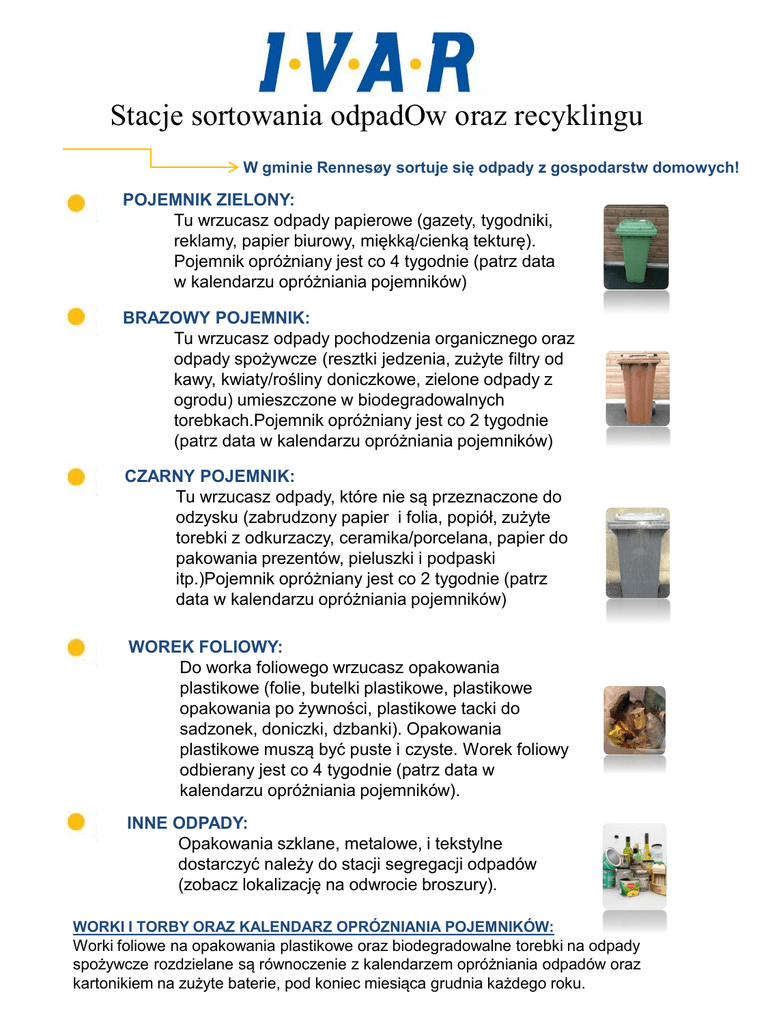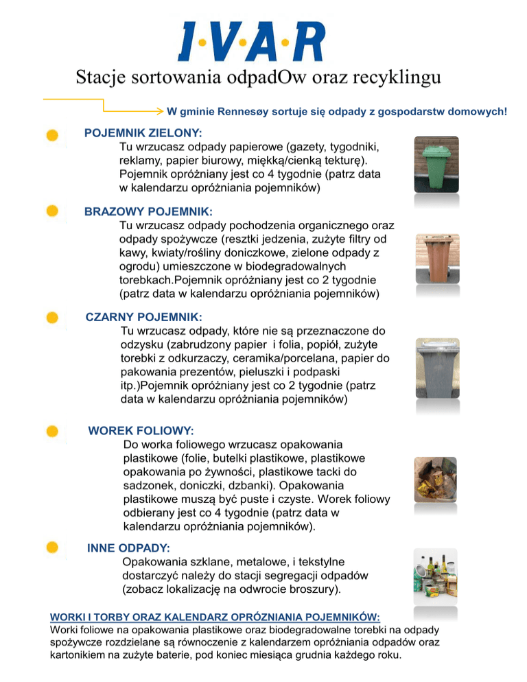 Stacje sortowania odpadÓw oraz recyklingu W gminie Rennesøy sortuje się odpady z gospodarstw domowych! POJEMNIK ZIELONY: Tu wrzucasz odpady papierowe (gazety, tygodniki, reklamy, papier biurowy, miękką/cienką tekturę). Pojemnik opróżniany jest co 4 tygodnie (patrz data w kalendarzu opróżniania pojemników) BRAZOWY POJEMNIK: Tu wrzucasz odpady pochodzenia organicznego oraz odpady spożywcze (resztki jedzenia, zużyte filtry od kawy, kwiaty/rośliny doniczkowe, zielone odpady z ogrodu) umieszczone w biodegradowalnych torebkach.Pojemnik opróżniany jest co 2 tygodnie (patrz data w kalendarzu opróżniania pojemników) CZARNY POJEMNIK: Tu wrzucasz odpady, które nie są przeznaczone do odzysku (zabrudzony papier i folia, popiół, zużyte torebki z odkurzaczy, ceramika/porcelana, papier do pakowania prezentów, pieluszki i podpaski itp.)Pojemnik opróżniany jest co 2 tygodnie (patrz data w kalendarzu opróżniania pojemników) WOREK FOLIOWY: Do worka foliowego wrzucasz opakowania plastikowe (folie, butelki plastikowe, plastikowe opakowania po żywności, plastikowe tacki do sadzonek, doniczki, dzbanki). Opakowania plastikowe muszą być puste i czyste. Worek foliowy odbierany jest co 4 tygodnie (patrz data w kalendarzu opróżniania pojemników). INNE ODPADY: Opakowania szklane, metalowe, i tekstylne dostarczyć należy do stacji segregacji odpadów (zobacz lokalizację na odwrocie broszury). WORKI I TORBY ORAZ KALENDARZ OPRÓZNIANIA POJEMNIKÓW: Worki foliowe na opakowania plastikowe oraz biodegradowalne torebki na odpady spożywcze rozdzielane są równoczenie z kalendarzem opróżniania odpadów oraz kartonikiem na zużyte baterie, pod koniec miesiąca grudnia każdego roku. Stacje sortowania odpadÓw oraz recyklingu STACJE SORTOWANIA ODPADÓW: Do stacji sortowania odpadów można dostarczać nastepujące odpady: - Opakowania szkalne i metalowe - Opakowania plastikowe - Tekstylia Stacje sortowania odpadów znajdują się w Vikevåg, Østhusvik, Sokn, a także w Finnesand. Stacja recyklingu Hausken: Tutaj możesz dostarczyć każdego rodzaju odpady elektryczne (AGD: lodówki, pralki, zmywarki oraz lampy, baterie, piece, przedłużacze, itp.). Godziny otwarcia: wtorki 13.30-17.30 Zeskanować kod QR , aby znaleźć kompletną mapę. Więcej informacji uzyskasz pod numerem telefonu: 51720242 albo pisząc na adres mailowy: [email protected]
