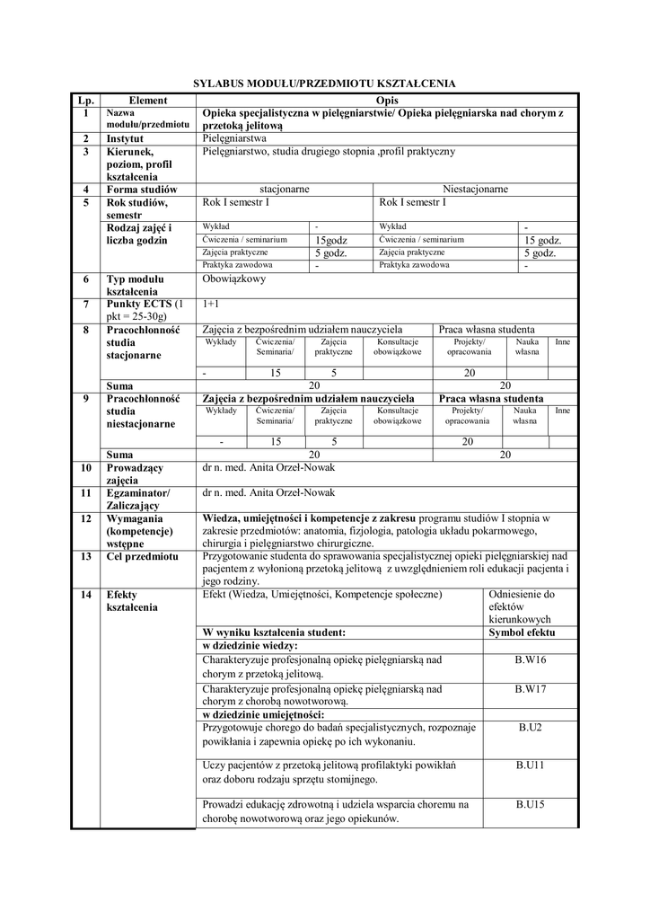 SYLABUS MODUŁU/PRZEDMIOTU KSZTAŁCENIA Lp. 1 2 3 4 5 Element Nazwa modułu/przedmiotu Instytut Kierunek, poziom, profil kształcenia Forma studiów Rok studiów, semestr Rodzaj zajęć i liczba godzin Opis Opieka specjalistyczna w pielęgniarstwie/ Opieka pielęgniarska nad chorym z przetoką jelitową Pielęgniarstwa Pielęgniarstwo, studia drugiego stopnia ,profil praktyczny stacjonarne Rok I semestr I Wykład Ćwiczenia / seminarium Zajęcia praktyczne Praktyka zawodowa 6 7 8 Typ modułu kształcenia Punkty ECTS (1 pkt = 25-30g) Pracochłonność studia stacjonarne 9 10 11 12 13 14 Suma Prowadzący zajęcia Egzaminator/ Zaliczający Wymagania (kompetencje) wstępne Cel przedmiotu Efekty kształcenia - 15godz 5 godz. - Wykład Ćwiczenia / seminarium 15 godz. 5 godz. - Zajęcia praktyczne Praktyka zawodowa Obowiązkowy 1+1 Zajęcia z bezpośrednim udziałem nauczyciela Wykłady Suma Pracochłonność studia niestacjonarne Niestacjonarne Rok I semestr I Ćwiczenia/ Seminaria/ Zajęcia praktyczne Konsultacje obowiązkowe 5 20 Zajęcia z bezpośrednim udziałem nauczyciela Praca własna studenta Projekty/ opracowania 15 Wykłady Ćwiczenia/ Seminaria/ - 15 Zajęcia praktyczne Konsultacje obowiązkowe Nauka własna Inne 20 20 Praca własna studenta Projekty/ opracowania 5 20 dr n. med. Anita Orzeł-Nowak Nauka własna Inne 20 20 dr n. med. Anita Orzeł-Nowak Wiedza, umiejętności i kompetencje z zakresu programu studiów I stopnia w zakresie przedmiotów: anatomia, fizjologia, patologia układu pokarmowego, chirurgia i pielęgniarstwo chirurgiczne. Przygotowanie studenta do sprawowania specjalistycznej opieki pielęgniarskiej nad pacjentem z wyłonioną przetoką jelitową z uwzględnieniem roli edukacji pacjenta i jego rodziny. Efekt (Wiedza, Umiejętności, Kompetencje społeczne) Odniesienie do efektów kierunkowych W wyniku kształcenia student: Symbol efektu w dziedzinie wiedzy: Charakteryzuje profesjonalną opiekę pielęgniarską nad B.W16 chorym z przetoką jelitową. Charakteryzuje profesjonalną opiekę pielęgniarską nad B.W17 chorym z chorobą nowotworową. w dziedzinie umiejętności: Przygotowuje chorego do badań specjalistycznych, rozpoznaje B.U2 powikłania i zapewnia opiekę po ich wykonaniu. Uczy pacjentów z przetoką jelitową profilaktyki powikłań oraz doboru rodzaju sprzętu stomijnego. B.U11 Prowadzi edukację zdrowotną i udziela wsparcia choremu na chorobę nowotworową oraz jego opiekunów. B.U15 Forma i warunki potwierdzenia efektu kształcenia wiedza 15 Nawiązuje współpracę i korzysta z pomocy osób znaczących dla pacjenta. w dziedzinie kompetencji społecznych: Ponosi odpowiedzialność za udział w podejmowaniu decyzji zawodowych. Krytycznie ocenia własne i cudze działania, przy zachowaniu szacunku dla różnic światopoglądowych i kulturowych. Rozwiązuje dylematy etyczne w organizacji pracy własnej i zespołu. Ponosi odpowiedzialność za bezpieczeństwo własne i osób znajdujących się pod jego opieką . Efekt kształcenia Sposób potwierdzenia (weryfikacji) osiągany przez moduł/przedmiot Symbol efektu B.W16 Sprawdzian ustny lub pisemny umiejętności Kompetencja społeczne 17 Stosowane metody dydaktyczne Forma i warunki zaliczenia modułu, zasady dopuszczenia do egzaminu oraz zaliczenia poszczególnych zajęć B.K1 B.K2 B.K3 B.K5 B.W17 B.U2 16 B.U22 B.U11 B.U15 Sprawdzian ustny ( odpowiedź na pytania, opisy przypadków klinicznych- ustalenie i prezentacja np. modelu specjalistycznej opieki pielęgniarskiej, analiza aktualnych publikacji) B.U22 B.K1 B.K2 B.K3 Dyskusja/obserwacja postawy studenta na zajęciach B.K5 Wykład konwersatoryjny, dyskusja dydaktyczna, burza mózgów, studium przypadku, ćwiczenia praktyczne, wykorzystanie form multimedialnych. Przedmiot kończy się egzaminem po I semestrze Egzamin: Zaawansowana opieka specjalistyczna w pielęgniarstwie-obejmuje: I semestr: -opieka pielęgniarska nad chorym z przetoką jelitową -opieka pielęgniarska nad chorym ze schorzeniami naczyń - opieka pielęgniarska nad pacjentami z chorobami krwi - opieka pielęgniarska nad pacjentami z ranami przewlekłymi - opieka pielęgniarska w chorobach przewlekłych układu oddechowego Zasady dopuszczenia do egzaminu uzyskanie zaliczenia z seminarium i zajęć praktycznych -wpis do Indywidualnej Karty Zaliczenia Przedmiotu oraz Dziennika Zaliczenia Efektów Kształcenia -obowiązkowa obecność 100% na zajęciach - referat projekty w ramach seminarium ćwiczeń W przypadku nieobecności usprawiedliwionej muszą być zrealizowane w innym terminie (ustalonym z koordynatorem przedmiotu). Forma egzaminu: Egzamin pisemny- test –pytania zamknięte oraz otwarte Warunki zaliczenia egzaminu –uzyskanie 60-70% pozytywnych odpowiedzi z egzamin pisemnego. Na ocenę końcową z egzaminu składa się: ocena z egzaminu pisemnego-80% oraz ocena z seminarium i zajęć praktycznych -20% (z Indywidualnej Karty Zaliczenia Przedmiotu) 18 Treści merytoryczne przedmiotu Tematyka ćwiczeń/seminarium 1. Rodzaje stomii, wskazania do wyłonienia przetoki jelitowej. 2. Powikłania wczesne i późne. Czynniki ryzyka, profilaktyka powikłań. 3. Rola i zadania pielęgniarki w opiece nad pacjentem z wyłonioną stomią jelitową. 4. Żywienie pacjentów z przetoką jelitową. 5. Znaczenie grup wsparcia dla chorych stomijnych POL-ILKO Tematyka zajęć praktycznych : 1. Rodzaje sprzętu stomijnego. Przygotowanie pacjenta i rodziny do samoopieki. 2. Umiejętność zaopatrywania stomii. 3. Znaczenie rehabilitacji- ćwiczenia zalecane i przeciwwskazane. 4. Problemy akceptacji zmiany wyglądu. Znaczenie wsparcia psychologicznego. 19 Wykaz literatury podstawowej 20 Wykaz literatury uzupełniającej (pomocniczej) Zadania do samodzielnej pracy studenta: 1. Krytyczna analiza opracowania z zakresu opieki nad pacjentem ze stomią. Prezentacja multimedialna opracowania. 2. Sprzęt stomijny- zgromadzenie materiałów , pokaz i omówienie. 1. Szmidt J,(red.): Podstawy chirurgii, wyd. 