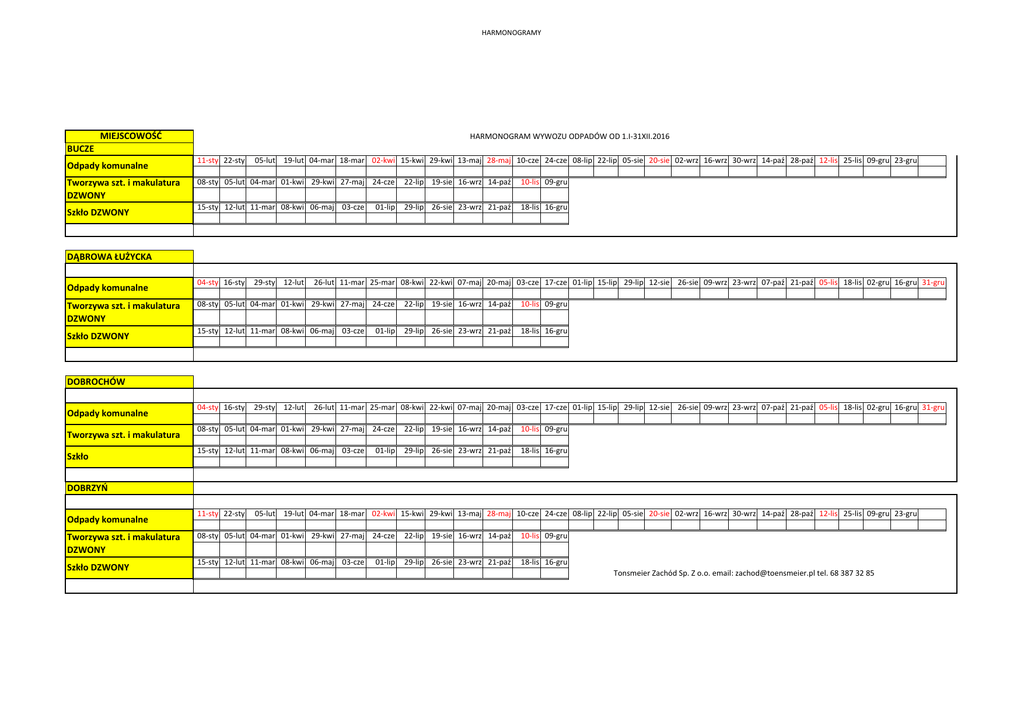 HARMONOGRAMY MIEJSCOWOŚĆ HARMONOGRAM WYWOZU ODPADÓW OD 1.I-31XII.2016 BUCZE Odpady komunalne Tworzywa szt. i makulatura DZWONY Szkło DZWONY 11-sty 22-sty 05-lut 19-lut 04-mar 18-mar 02-kwi 15-kwi 29-kwi 13-maj 28-maj 10-cze 24-cze 08-lip 22-lip 05-sie 20-sie 02-wrz 16-wrz 30-wrz 14-paź 28-paź 12-lis 25-lis 09-gru 23-gru 08-sty 05-lut 04-mar 01-kwi 29-kwi 27-maj 24-cze 22-lip 19-sie 16-wrz 14-paź 10-lis 09-gru 15-sty 12-lut 11-mar 08-kwi 06-maj 03-cze 29-lip 26-sie 23-wrz 21-paź 18-lis 16-gru 01-lip DĄBROWA ŁUŻYCKA Odpady komunalne Tworzywa szt. i makulatura DZWONY Szkło DZWONY 04-sty 16-sty 29-sty 12-lut 26-lut 11-mar 25-mar 08-kwi 22-kwi 07-maj 20-maj 03-cze 17-cze 01-lip 15-lip 29-lip 12-sie 26-sie 09-wrz 23-wrz 07-paź 21-paź 05-lis 18-lis 02-gru 16-gru 31-gru 08-sty 05-lut 04-mar 01-kwi 29-kwi 27-maj 24-cze 22-lip 19-sie 16-wrz 14-paź 10-lis 09-gru 15-sty 12-lut 11-mar 08-kwi 06-maj 03-cze 29-lip 26-sie 23-wrz 21-paź 18-lis 16-gru 01-lip DOBROCHÓW Odpady komunalne Tworzywa szt. i makulatura Szkło 04-sty 16-sty 29-sty 12-lut 26-lut 11-mar 25-mar 08-kwi 22-kwi 07-maj 20-maj 03-cze 17-cze 01-lip 15-lip 29-lip 12-sie 26-sie 09-wrz 23-wrz 07-paź 21-paź 05-lis 18-lis 02-gru 16-gru 31-gru 08-sty 05-lut 04-mar 01-kwi 29-kwi 27-maj 24-cze 22-lip 19-sie 16-wrz 14-paź 10-lis 09-gru 15-sty 12-lut 11-mar 08-kwi 06-maj 03-cze 29-lip 26-sie 23-wrz 21-paź 18-lis 16-gru 01-lip DOBRZYŃ Odpady komunalne Tworzywa szt. i makulatura DZWONY Szkło DZWONY 11-sty 22-sty 05-lut 19-lut 04-mar 18-mar 02-kwi 15-kwi 29-kwi 13-maj 28-maj 10-cze 24-cze 08-lip 22-lip 05-sie 20-sie 02-wrz 16-wrz 30-wrz 14-paź 28-paź 12-lis 25-lis 09-gru 23-gru 08-sty 05-lut 04-mar 01-kwi 29-kwi 27-maj 24-cze 22-lip 19-sie 16-wrz 14-paź 10-lis 09-gru 15-sty 12-lut 11-mar 08-kwi 06-maj 03-cze 29-lip 26-sie 23-wrz 21-paź 18-lis 16-gru 01-lip Tonsmeier Zachód Sp. Z o.o. email: [email protected] tel. 68 387 32 85 HARMONOGRAMY JAMNO Odpady komunalne Tworzywa szt. i makulatura DZWONY Szkło DZWONY HARMONOGRAM WYWOZU ODPADÓW OD 1.I-31XII.2016 11-sty 22-sty 05-lut 19-lut 04-mar 18-mar 02-kwi 15-kwi 29-kwi 13-maj 28-maj 10-cze 24-cze 08-lip 22-lip 05-sie 20-sie 02-wrz 16-wrz 30-wrz 14-paź 28-paź 12-lis 25-lis 09-gru 23-gru 08-sty 05-lut 04-mar 01-kwi 29-kwi 27-maj 24-cze 22-lip 19-sie 16-wrz 14-paź 10-lis 09-gru 15-sty 12-lut 11-mar 08-kwi 06-maj 03-cze 29-lip 26-sie 23-wrz 21-paź 18-lis 16-gru 01-lip LIPNA Odpady komunalne Tworzywa szt. i makulatura Szkło 11-sty 22-sty 05-lut 19-lut 04-mar 18-mar 02-kwi 15-kwi 29-kwi 13-maj 28-maj 10-cze 24-cze 08-lip 22-lip 05-sie 20-sie 02-wrz 16-wrz 30-wrz 14-paź 28-paź 12-lis 25-lis 09-gru 23-gru 08-sty 05-lut 04-mar 01-kwi 29-kwi 27-maj 24-cze 22-lip 19-sie 16-wrz 14-paź 10-lis 09-gru 15-sty 12-lut 11-mar 08-kwi 06-maj 03-cze 29-lip 26-sie 23-wrz 21-paź 18-lis 16-gru 01-lip MIELNO Odpady komunalne Tworzywa szt. i makulatura DZWONY Szkło DZWONY 04-sty 16-sty 29-sty 12-lut 26-lut 11-mar 25-mar 08-kwi 22-kwi 07-maj 20-maj 03-cze 17-cze 01-lip 15-lip 29-lip 12-sie 26-sie 09-wrz 23-wrz 07-paź 21-paź 05-lis 18-lis 02-gru 16-gru 31-gru 08-sty 05-lut 04-mar 01-kwi 29-kwi 27-maj 24-cze 22-lip 19-sie 16-wrz 14-paź 10-lis 09-gru 15-sty 12-lut 11-mar 08-kwi 06-maj 03-cze 29-lip 26-sie 23-wrz 21-paź 18-lis 16-gru 01-lip PIOTRÓW Odpady komunalne Tworzywa szt. i makulatura DZWONY Szkło DZWONY 04-sty 16-sty 29-sty 12-lut 26-lut 11-mar 25-mar 08-kwi 22-kwi 07-maj 20-maj 03-cze 17-cze 01-lip 15-lip 29-lip 12-sie 26-sie 09-wrz 23-wrz 07-paź 21-paź 05-lis 18-lis 02-gru 16-gru 31-gru 08-sty 05-lut 04-mar 01-kwi 29-kwi 27-maj 24-cze 22-lip 19-sie 16-wrz 14-paź 10-lis 09-gru 15-sty 12-lut 11-mar 08-kwi 06-maj 03-cze 29-lip 26-sie 23-wrz 21-paź 18-lis 16-gru 01-lip Tonsmeier Zachód Sp. Z o.o. email: [email protected] tel. 68 387 32 85 HARMONOGRAMY POTOK Odpady komunalne Tworzywa szt. i makulatura Szkło HARMONOGRAM WYWOZU ODPADÓW OD 1.I-31XII.2016 04-sty 16-sty 29-sty 12-lut 26-lut 11-mar 25-mar 08-kwi 22-kwi 07-maj 20-maj 03-cze 17-cze 01-lip 15-lip 29-lip 12-sie 26-sie 09-wrz 23-wrz 07-paź 21-paź 05-lis 18-lis 02-gru 16-gru 31-gru 08-sty 05-lut 04-mar 01-kwi 29-kwi 27-maj 24-cze 22-lip 19-sie 16-wrz 14-paź 10-lis 09-gru 15-sty 12-lut 11-mar 08-kwi 06-maj 03-cze 29-lip 26-sie 23-wrz 21-paź 18-lis 16-gru 01-lip PRZEWÓZ Odpady komunalne Tworzywa szt. i makulatura DZWONY Szkło DZWONY 11-sty 22-sty 05-lut 19-lut 04-mar 18-mar 02-kwi 15-kwi 29-kwi 13-maj 28-maj 10-cze 24-cze 08-lip 22-lip 05-sie 20-sie 02-wrz 16-wrz 30-wrz 14-paź 28-paź 12-lis 25-lis 09-gru 23-gru 08-sty 05-lut 04-mar 01-kwi 29-kwi 27-maj 24-cze 22-lip 19-sie 16-wrz 14-paź 10-lis 09-gru 15-sty 12-lut 11-mar 08-kwi 06-maj 03-cze 29-lip 26-sie 23-wrz 21-paź 18-lis 16-gru 01-lip SANICE Odpady komunalne Tworzywa szt. i makulatura DZWONY Szkło DZWONY 11-sty 22-sty 05-lut 19-lut 04-mar 18-mar 02-kwi 15-kwi 29-kwi 13-maj 28-maj 10-cze 24-cze 08-lip 22-lip 05-sie 20-sie 02-wrz 16-wrz 30-wrz 14-paź 28-paź 12-lis 25-lis 09-gru 23-gru 08-sty 05-lut 04-mar 01-kwi 29-kwi 27-maj 24-cze 22-lip 19-sie 16-wrz 14-paź 10-lis 09-gru 15-sty 12-lut 11-mar 08-kwi 06-maj 03-cze 29-lip 26-sie 23-wrz 21-paź 18-lis 16-gru 01-lip Tonsmeier Zachód Sp. Z o.o. email: [email protected] tel. 68 387 32 85 HARMONOGRAMY SOBOLICE Odpady komunalne Tworzywa szt. i makulatura Szkło HARMONOGRAM WYWOZU ODPADÓW OD 1.I-31XII.2016 11-sty 22-sty 05-lut 19-lut 04-mar 18-mar 02-kwi 15-kwi 29-kwi 13-maj 28-maj 10-cze 24-cze 08-lip 22-lip 05-sie 20-sie 02-wrz 16-wrz 30-wrz 14-paź 28-paź 12-lis 25-lis 09-gru 23-gru 08-sty 05-lut 04-mar 01-kwi 29-kwi 27-maj 24-cze 22-lip 19-sie 16-wrz 14-paź 10-lis 09-gru 15-sty 12-lut 11-mar 08-kwi 06-maj 03-cze 29-lip 26-sie 23-wrz 21-paź 18-lis 16-gru 01-lip STRASZÓW Odpady komunalne Tworzywa szt. i makulatura DZWONY Szkło DZWONY 04-sty 16-sty 29-sty 12-lut 26-lut 11-mar 25-mar 08-kwi 22-kwi 07-maj 20-maj 03-cze 17-cze 01-lip 15-lip 29-lip 12-sie 26-sie 09-wrz 23-wrz 07-paź 21-paź 05-lis 18-lis 02-gru 16-