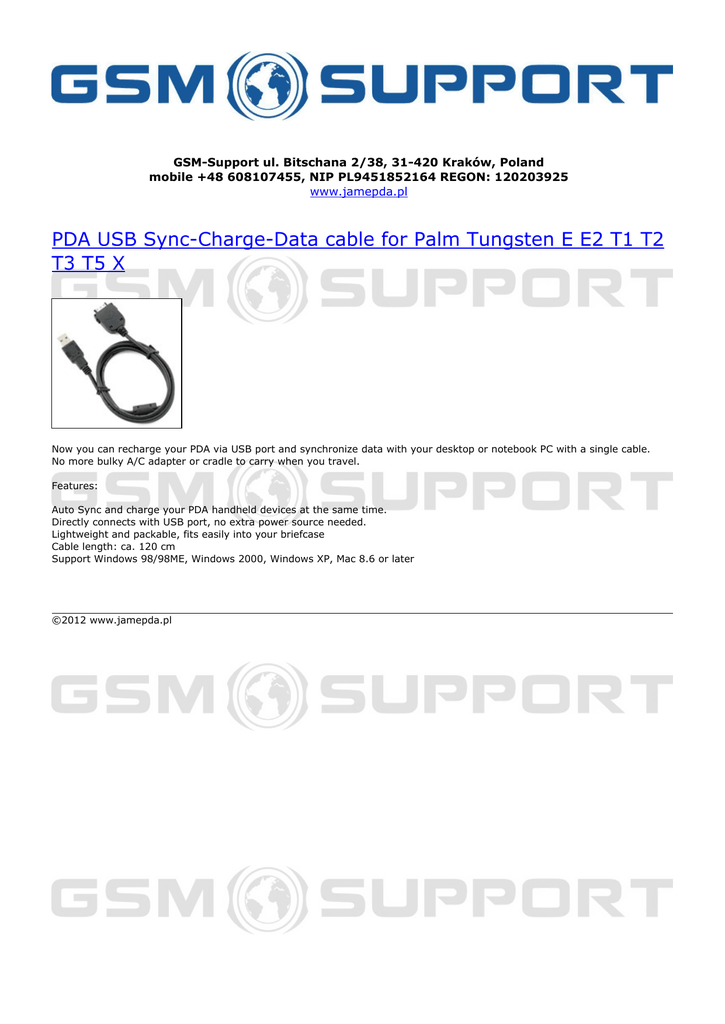 GSM-Support ul. Bitschana 2/38, 31-420 Kraków, Poland mobile +48 608107455, NIP PL9451852164 REGON: 120203925 www.jamepda.pl PDA USB Sync-Charge-Data cable for Palm Tungsten E E2 T1 T2 T3 T5 X Now you can recharge your PDA via USB port and synchronize data with your desktop or notebook PC with a single cable. No more bulky A/C adapter or cradle to carry when you travel. Features: Auto Sync and charge your PDA handheld devices at the same time. Directly connects with USB port, no extra power source needed. Lightweight and packable, fits easily into your briefcase Cable length: ca. 120 cm Support Windows 98/98ME, Windows 2000, Windows XP, Mac 8.6 or later ©2012 www.jamepda.pl Powered by TCPDF (www.tcpdf.org)