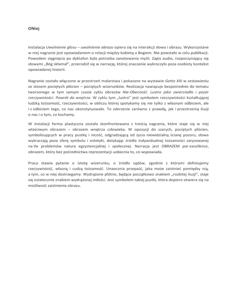 ONiej Instalacja Uwolnienie głosu – uwolnienie obrazu opiera się na interakcji słowa i obrazu. Wykorzystane w niej nagranie jest opowiadaniem o relacji między kobietą a Bogiem. Nie powstało w celu publikacji. Powodem sięgnięcia po dyktafon była potrzeba zanotowania myśli. Zapis audio, rozpoczynający się słowami „Bóg skłamał”, przerodził się w narrację, której znaczenie wykroczyło poza osobisty kontekst opowiadanej historii. Nagranie zostało włączone w przestrzeń malarstwa i pokazane na wystawie Getto XXI w zestawieniu ze stosem pociętych płócien – pociętych wizerunków. Realizacja nawiązuje bezpośrednio do tematu tworzonego w tym samym czasie cyklu obrazów Nie-Obecność. Lustro jako zwierciadło i pozór rzeczywistości. Powrót do wnętrza. W cyklu tym „lustro” jest symbolem rzeczywistości kształtującej ludzką tożsamość, rzeczywistości, w obliczu której spotykamy się nie tylko z własnym odbiciem, ale i z odbiciem tego, co nas ukonstytuowało. To zderzenie zarówno z prawdą, jak i przestrzenią iluzji o nas i o tym, co kochamy. W instalacji forma plastyczna została skonfrontowana z treścią nagrania, które staje się w niej właściwym obrazem – obrazem wnętrza człowieka. W opozycji do szarych, pociętych płócien, symbolizujących w pracy pustkę i nicość, odgradzającą od życia niewidzialną ścianę pozoru, słowa wykraczają poza sferę symbolu i estetyki, dotykając źródła indywidualnej tożsamości zarysowanej na tle problemów natury egzystencjalnej i społecznej. Narracja jest OBRAZEM par excellence, obrazem, który bez pośrednictwa reprezentacji uobecnia to, co wypowiada. Praca stawia pytanie o istotę wizerunku, o źródło sądów, zgodnie z którymi definiujemy rzeczywistość, własną i cudzą tożsamość. Unaocznia przepaść, jaka może zaistnieć pomiędzy nią, a tym, co w niej dostrzegamy. Wydrążone płótno, będące początkowo znakiem „rozbitej iluzji”, staje się ostatecznie znakiem wydrążonej miłości. Jest symbolem takiej pustki, która dopiero otwiera się na możliwość zaistnienia obrazu.