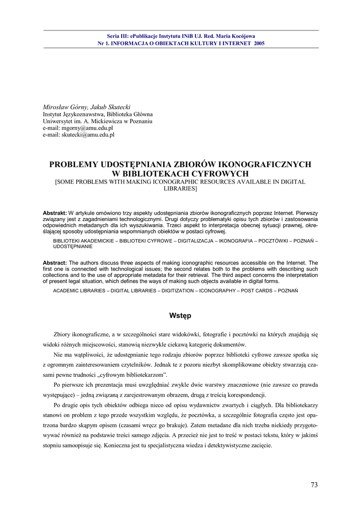 Seria III: ePublikacje Instytutu INiB UJ. Red. Maria Kocójowa Nr 1. INFORMACJA O OBIEKTACH KULTURY I INTERNET 2005 Mirosław Górny, Jakub Skutecki Instytut Językoznawstwa, Biblioteka Główna Uniwersytet im. A. Mickiewicza w Poznaniu e-mail: [email protected] e-mail: [email protected] PROBLEMY UDOSTĘPNIANIA ZBIORÓW IKONOGRAFICZNYCH W BIBLIOTEKACH CYFROWYCH [SOME PROBLEMS WITH MAKING ICONOGRAPHIC RESOURCES AVAILABLE IN DIGITAL LIBRARIES] Abstrakt: W artykule omówiono trzy aspekty udostępniania zbiorów ikonograficznych poprzez Internet. Pierwszy związany jest z zagadnieniami technologicznymi. Drugi dotyczy problematyki opisu tych zbiorów i zastosowania odpowiednich metadanych dla ich wyszukiwania. Trzeci aspekt to interpretacja obecnej sytuacji prawnej, określającej sposoby udostępniania wspomnianych obiektów w postaci cyfrowej. BIBLIOTEKI AKADEMICKIE – BIBLIOTEKI CYFROWE – DIGITALIZACJA – IKONOGRAFIA – POCZTÓWKI – POZNAŃ – UDOSTĘPNIANIE Abstract: The authors discuss three aspects of making iconographic resources accessible on the Internet. The first one is connected with technological issues; the second relates both to the problems with describing such collections and to the use of appropriate metadata for their retrieval. The third aspect concerns the interpretation of present legal situation, which defines the ways of making such objects available in digital forms. ACADEMIC LIBRARIES – DIGITAL LIBRARIES – DIGITIZATION – ICONOGRAPHY – POST CARDS – POZNAŃ Wstęp Zbiory ikonograficzne, a w szczególności stare widokówki, fotografie i pocztówki na których znajdują się widoki różnych miejscowości, stanowią niezwykle ciekawą kategorię dokumentów. Nie ma wątpliwości, że udostępnianie tego rodzaju zbiorów poprzez biblioteki cyfrowe zawsze spotka się z ogromnym zainteresowaniem czytelników. Jednak te z pozoru niezbyt skomplikowane obiekty stwarzają czasami pewne trudności „cyfrowym bibliotekarzom”. Po pierwsze ich prezentacja musi uwzględniać zwykle dwie warstwy znaczeniowe (nie zawsze co prawda występujące) – jedną związaną z zarejestrowanym obrazem, drugą z treścią korespondencji. Po drugie opis tych obiektów odbiega nieco od opisu wydawnictw zwartych i ciągłych. Dla bibliotekarzy stanowi on problem z tego przede wszystkim względu, że pocztówka, a szczególnie fotografia często jest opatrzona bardzo skąpym opisem (czasami wręcz go brakuje). Zatem metadane dla nich trzeba niekiedy przygotowywać również na podstawie treści samego zdjęcia. A przecież nie jest to treść w postaci tekstu, który w jakimś stopniu samoopisuje się. Konieczna jest tu specjalistyczna wiedza i detektywistyczne zacięcie. 73 Seria III: ePublikacje Instytutu INiB UJ. Red. Maria Kocójowa Nr 1. INFORMACJA O OBIEKTACH KULTURY I INTERNET 2005 Po trzecie wszelkie widokówki i pocztówki stanowią łakomy kąsek dla wydawców. Powstaje dylemat – udostępniać te zbiory bez ograniczeń i ułatwiać innym ciągnięcie zysków ze sprzedaży ich reprodukcji czy też wprowadzać różnego rodzaju ograniczenia kosztem jakości, wygody i łatwości korzystania przez masowego czytelnika. Pocztówki w zbiorach Biblioteki Uniwersyteckiej w Poznaniu Kolekcja starych widokówek poznańskich jest stosunkowo młoda, powstała w ciągu ostatnich 15 lat. Liczy kilka tysięcy jednostek w trzech zasadniczych grupach: 1. Najstarsze widokówki, wydane przed 1905 rokiem, charakteryzują się „długimi liniami adresowymi”, podczas gdy na awersie znajduje się miejsce zarówno na treść korespondencji jak i na ilustrację. 2. Widokówki wydane w latach 1905–1918, a więc od chwili podziału strony adresowej i przeniesienia na nią miejsca na korespondencje po koniec I wojny światowej, 3. Widokówki międzywojenne. W pierwszej grupie – liczącej około 1.100 obiektów – zeskanowanych zostało ponad 850 obiektów, w grupie drugiej – ponad 950 spośród 1.800 opracowanych obiektów. Drugą kolekcję – porównywalną co do wielkości – stanowią widokówki z terenu historycznej Wielkopolski wydane przed 1939 rokiem. Często jest to jedyny, zachowany w tak znaczącej ilości, materiał wizualny do studiów nad historią miast i miasteczek w ciągu ostatniego stulecia. Technologia digitalizacji W Bibliotece Uniwersyteckiej w Poznaniu pocztówki digitalizowane są w następujący sposób: • jednostronne skanowanie na skanerze stolikowym w rozdzielczości 600dpi, • obróbka w programie Adobe Photoshop – obracanie, przycinanie, korekcja barw – nasycenie, kontrast, jasność, sporadycznie retusz, • zapis na dysku w formacie TIFF (bez kompresji), • zapis na nośniku optycznym (płyta CD-R) w formacie j.w. – „płyta-matka”, • kopia w rozdzielczości 72 dpi zapisana w postaci skompresowanego pliku JEPG zapisana na dysku twardym komputera stanowi uzupełnienie katalogu Pracowni Ikonograficznej BU – bazy w ACCES. Zbiory przygotowywane do udostępniania w Wielkopolskiej Bibliotece Cyfrowej są przetwarzane podobnie: • skanowanie 300dpi, • obróbka w programie Adobe Photoshop obracanie, przycinanie, retusz ogólny (kontrast, jasność, nasycenie, korekcja barwna, usuwanie rastra), retusz szczegółowy (jeśli pojawią się jakieś przypadkowe zanieczyszczenia), • tak przetworzony obraz jest zapisywany, • jest wykonywana kopia, którą zmniejsza się do wielkości około 15MB, • kompresuje się to programem djvu solo i otrzymuje plik wielkości około 500kb (uznano, że dokumenty tej wielkości nie tracą zauważalnie na jakości w wyniku kompresji, jak również nie ściągają się zbyt długo (Przy pierwszym rysunku jest to 38 sekund, przy łączu 128kb/s, kolejny obraz wczytuje się w trakcie oglądania bieżącego)) 74 Seria III: ePublikacje Instytutu INiB UJ. Red. Maria Kocójowa Nr 1. INFORMACJA O OBIEKTACH KULTURY I INTERNET 2005 • obrazy oryginalne pomniejszone oraz pliki TIFF archiwizuje się. W przypadku duży