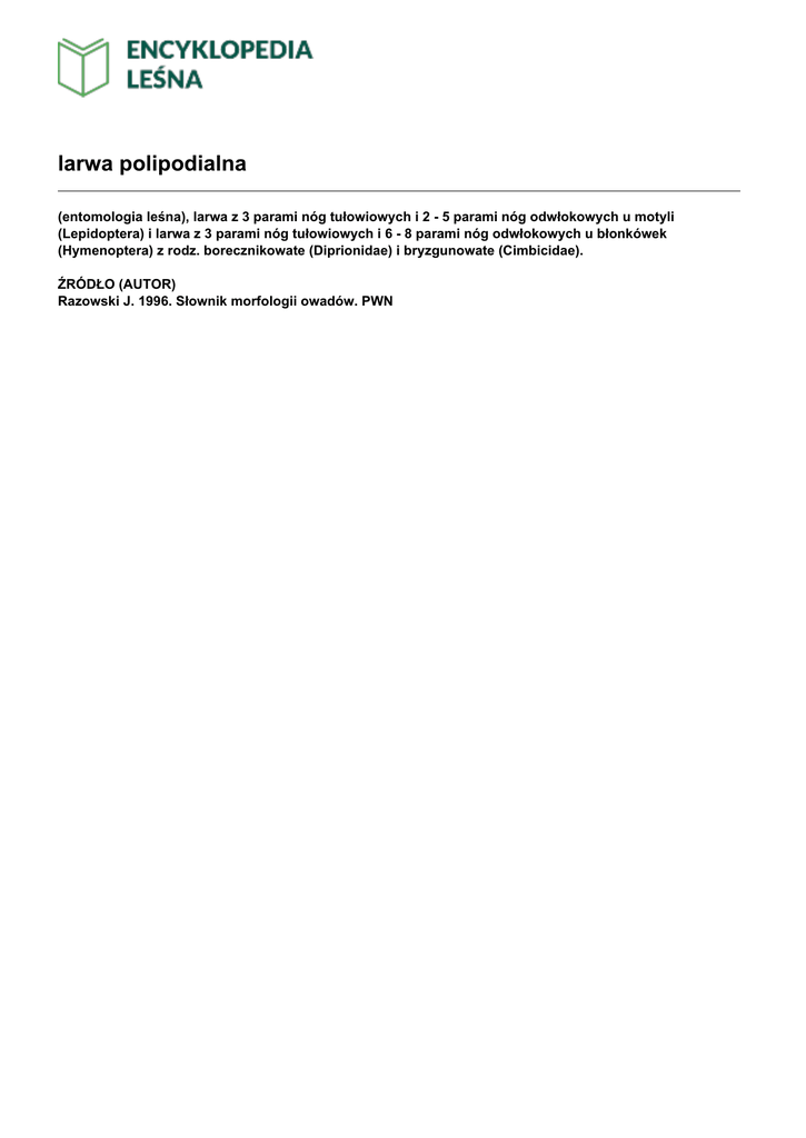larwa polipodialna (entomologia leśna), larwa z 3 parami nóg tułowiowych i 2 - 5 parami nóg odwłokowych u motyli (Lepidoptera) i larwa z 3 parami nóg tułowiowych i 6 - 8 parami nóg odwłokowych u błonkówek (Hymenoptera) z rodz. borecznikowate (Diprionidae) i bryzgunowate (Cimbicidae). ŹRÓDŁO (AUTOR) Razowski J. 1996. Słownik morfologii owadów. PWN