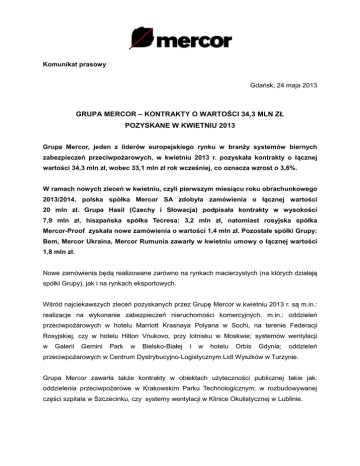 Komunikat prasowy Gdańsk, 24 maja 2013 GRUPA MERCOR – KONTRAKTY O WARTOŚCI 34,3 MLN ZŁ POZYSKANE W KWIETNIU 2013 Grupa Mercor, jeden z liderów europejskiego rynku w branży systemów biernych zabezpieczeń przeciwpożarowych, w kwietniu 2013 r. pozyskała kontrakty o łącznej wartości 34,3 mln zł, wobec 33,1 mln zł rok wcześniej, co oznacza wzrost o 3,6%. W ramach nowych zleceń w kwietniu, czyli pierwszym miesiącu roku obrachunkowego 2013/2014, polska spółka Mercor SA zdobyła zamówienia o łącznej wartości 20 mln zł. Grupa Hasil (Czechy i Słowacja) podpisała kontrakty w wysokości 7,9 mln zł, hiszpańska spółka Tecresa: 3,2 mln zł, natomiast rosyjska spółka Mercor-Proof zyskała nowe zamówienia o wartości 1,4 mln zł. Pozostałe spółki Grupy: Bem, Mercor Ukraina, Mercor Rumunia zawarły w kwietniu umowy o łącznej wartości 1,8 mln zł. Nowe zamówienia będą realizowane zarówno na rynkach macierzystych (na których działają spółki Grupy), jak i na rynkach eksportowych. Wśród najciekawszych zleceń pozyskanych przez Grupę Mercor w kwietniu 2013 r. są m.in.: realizacje na wykonanie zabezpieczeń nieruchomości komercyjnych, m.in.: oddzieleń przeciwpożarowych w hotelu Marriott Krasnaya Polyana w Sochi, na terenie Federacji Rosyjskiej, czy w hotelu Hilton Vnukovo, przy lotnisku w Moskwie; systemów wentylacji w Galerii Gemini Park w Bielsko-Białej i w hotelu Orbis Gdynia; oddzieleń przeciwpożarowych w Centrum Dystrybucyjno-Logistycznym Lidl Wyszków w Turzynie. Grupa Mercor zawarła także kontrakty w obiektach użyteczności publicznej takie jak: oddzielenia przeciwpożarowe w Krakowskim Parku Technologicznym; w rozbudowywanej części szpitala w Szczecinku, czy systemy wentylacji w Klinice Okulistycznej w Lublinie. W sektorze przemysłowym i produkcyjnym Grupa – zgodnie z nowymi kontraktami – wykona m.in. systemy oddymiania na terenie firmy Pet Star Holding S.R.L. – wiodącego producenta opakowań z tworzyw sztucznych w Rumunii; oddzielenia przeciwpożarowe dla firmy farmaceutycznej HBM Pharma na Słowacji; zabezpieczenia ogniochronne w fabryce produkującej windy należącej do międzynarodowego koncernu ThyssenKrupp Elevator w Mostoles, w Hiszpanii; systemy oddymiania w centrum dystrybucyjnym Magnit największej sieci sklepów detalicznych w Rosji. W Polsce w sektorze przemysłowym i produkcyjnym Grupa wykona m.in. zabezpieczenia ogniochronne konstrukcji stalowej lądowiska dla helikopterów nad polikliniką w Olsztynie (platforma nad budynkiem Szpitalnego Oddziału Ratunkowego); zabezpieczenie ogniochronne konstrukcji stalowej pierwszego w Polsce tunelu aerodynamicznego Freefly Center oraz systemy oddymiania grawitacyjnego w zakładzie produkcyjnym Schumacher Packaging w Polednie (woj. kujawsko-pomorskie) – wiodącego, niemieckiego producenta opakowań z tektury. Rozpoczęlismy nowy rok obrotowy 2013/2014 bardzo dobrym poziomem nowo pozyskanych zamówień. Ich wartość przekroczyła ubiegłroczny poziom o 1,2 mln zł. To wynik konsekwentnie realizowanej strategii Grupy, dywersyfikacji produktowej i geograficznej. Istotną część kwietniowych zamówień stanowią prestiżowe realizacje na terenie nieruchomości komercyjnych, w sektorze produkcyjnym i przemysłowym zarówno w Polsce jak i na rynkach zagranicznych – mówi Krzysztof Krempeć, Prezes Zarządu Mercor SA. Dodatkowych informacji udzielają: Beata Cioczek, M+G Aleksandra Gierjatowicz, Mercor SA Tel. (22) 416 01 02, 508 385 432 Tel. (58) 341 42 45 w.140, 609 462 186 e-mail: [email protected] e-mail: [email protected] Grupa Mercor jest jednym z liderów europejskiego rynku w branży systemów biernych zabezpieczeń przeciwpożarowych i największym podmiotem branży w Polsce. Spółka oferuje produkty i usługi we wszystkich segmentach rynku biernych zabezpieczeń przeciwpożarowych, którymi są: oddzielenia przeciwpożarowe, systemy oddymiania i odprowadzania ciepła, systemy wentylacji pożarowej i zabezpieczenia ogniochronne konstrukcji budowlanych. Grupę kapitałową Mercor tworzą: Mercor SA (Polska, podmiot dominujący), Mercor Ukraina sp. z o.o. (Ukraina), Mercor Fire Protection Systems S.R.L. (Rumunia), Hasil a.s. (Czechy) i Hasil s.r.o. (Słowacja), Tecresa Protecction Pasiva (Hiszpania), BEM sp. z o.o. (Polska) oraz Mercor Proof (Rosja). Grupa posiada 8 zakładów produkcyjnych w 7 krajach w Europie, zatrudnia ok. 1000 pracowników. Imponującą listę realizacji Grupy Mercor tworzą m.in. obiekty takie jak Giełda Papierów Wartościowych w Warszawie, Stadion Narodowy, Stadion PGE Arena, Hotel Westin, Hotel Hilton, Narodowy Bank Polski, Biblioteka 2 Narodowa, Poznańskie Centrum Finansowe, Galeria Kazimierz w Krakowie, Złote Tarasy, Zakłady Chemiczne Puławy, Zakłady Chemiczne Dwory, Zakłady Azotowe Puławy, Rondo 1, Domoteka, PKN Orlen Płock, Canal Plus Cyfrowa. Na rynku czeskim Grupa może pochwalić się takimi realizacjami jak: Narodowy Bank Czeski, hotele Four Seasons, Hilton, Le Palais, Marriott, SAS Radisson, sieci sklepów Hypernova, Kaufland, Tesco, a na rynku hiszpańskim do klientów Tecresa Catalunya zaliczają sie m.in. Ikea, Peugeot, Coca-Cola, Whirpool, Flex, Sanitas, Opel i wiele, wiele innych. Od lipca 2007 roku akcje Mercor SA notowane są na GPW. Dodatkowe informacje dostępne także na www.mercor.com.pl 3