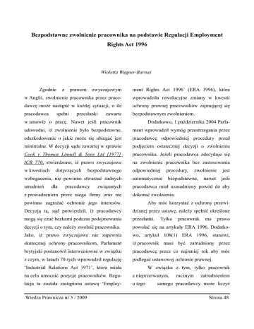 Bezpodstawne zwolnienie pracownika na podstawie Regulacji Employment Rights Act 1996 Wioletta Wagner-Barnaś Zgodnie z prawem zwyczajowym ment Rights Act 1996’ (ERA 1996), która w Anglii, zwolnienie pracownika przez praco- wprowadziła rewolucyjne zmiany w kwestii dawcę może nastąpić w każdej sytuacji, o ile ochrony prawnej pracowników zajmującej się pracodawca bezpodstawnym zwolnieniem. spełni przesłanki zawarte w umowie o pracę. Nawet jeśli pracownik Dodatkowo, 1 października 2004 Parla- udowodni, iż zwolnienie było bezpodstawne, ment wprowadził wymóg przestrzegania przez odszkodowanie o jakie może się ubiegać jest pracodawcę odpowiedniej procedury przed minimalne. W decyzji sądu zawartej w sprawie podjęciem ostatecznej decyzji o zwolnieniu Cook v Thomas Linnell & Sons Ltd [1977] pracownika. Jeżeli pracodawca zdecyduje się ICR 770, stwierdzono, iż prawo zwyczajowe na zwolnienie pracownika bez zastosowania w kwestiach odpowiedniej procedury, wzbogacenia, nie powinno stwarzać żadnych automatycznie bezpodstawne, utrudnień pracodawca miał uzasadniony powód do aby dotyczących dla bezpodstawnego pracodawcy związanych z prowadzeniem przez niego firmy oraz nie zwolnienie nawet jest jeśli dokonać zwolnienia. powinno zagrażać ochronie jego interesów. Aby móc korzystać z ochrony przewi- Decyzją tą, sąd potwierdził, iż pracodawcy dzianej przez ustawę, należy spełnić określone mogą się czuć bezkarni podczas podejmowania przesłanki. decyzji o tym, czy należy zwolnić pracownika. powołać się na artykuły ERA 1996. Dodatko- Jako, iż prawo zwyczajowe nie zapewnia wo, artykuł 108(1) ERA 1996, stanowi, skutecznej ochrony pracownikom, Parlament iż pracownik musi być zatrudniony przez brytyjski postanowił interweniować w związku pracodawcę przez co najmniej rok aby móc z czym, w latach 70-tych wprowadził regulację podlegać ustawowej ochronie prawnej. ‘Industrial Relations Act 1971’, która miała Tylko ma prawo W związku z tym, tylko pracownik na celu umocnić pozycje pracowników. Regu- z nieprzerwanym, lacja ta została zastąpiona ustawą ‘Employ- u tego Wiedza Prawnicza nr 3 / 2009 pracownik rocznym zatrudnieniem samego pracodawcy może liczyć Strona 48 na ustawową ochronę prawną w odróżnieniu od momentu kiedy nastąpiło zwolnienie. Jeżeli od pracownika pracującego na umowę zlecenia w tym czasie nie rozpocznie postępowania lub samozatrudniającego się. Aby ustalić, czy sądowego, jego sprawa ulegnie przedawnieniu. osoba jest pracownikiem, należy spełnić Niewątpliwie artykuł 111 jest bardzo nieko- wymogi zawarte w artykule 230 ERA 1996, rzystny dla pracowników. Jest to okres bardzo czyli mieć zawartą umowę o pracę. Sąd Pracy krótki. Wydaje się, iż Parlament nie wziął pod musi rozważyć wiele czynników w trakcie uwagę faktu, iż pracownikami są często osoby, ustalania statusu osoby zatrudnionej. Pierwszy które nie znają procedury sądowej oraz limi- wymóg został zatwierdzony w decyzji Sądu tów czasowych i kiedy w końcu udadzą się Najwyższego w sprawie Ready Mixed Concre- po pomoc prawną do kancelarii prawniczej, te South East v Minister of Pension [1968] 2 często jest już za późno aby rozpocząć Q.B 497, gdzie ustalono, iż pracownik musi postępowanie wykonywać swoja pracę osobiście i znajdować okolicznościach sąd może zezwolić na wszczę- sie pod kontrolą pracodawcy. Sąd Najwyższy cie procedury do 6 miesięcy od zwolnienia, wprowadził test, który musi być wzięty pod jednakże praktyka pokazała, iż sądy są bardzo uwagę, przy ustalaniu, czy osoba jest faktycz- niechętne nie zatrudniona. Zalicza się do tego między czasowego stosować na dużą skalę, co zostało innymi potwierdzone przez Sąd Apelacyjny w sprawie to, czy pracownik posługuje się sądowe. aby takie wyjątkowych przesunięcie własnymi narzędziami pracy, czy sam rozlicza Palmer się z podatku, czy znajduje się pod stałą Council[1984] IRLR 119. kontrolą pracodawcy. v W Southern on Sea limitu Borough Aby ustalić, czy zwolnienie pracownika Na ustawę można tylko wówczas było zgodne z prawem, Trybunał Pracy musi powołać się jeżeli osoba została zwolniona. przeprowadzić dwu-stopniowe postępowanie, Aby ustalić, czy przesłanka ta została spełnio- co zostało potwierdzone w artykule 98 ERA na, należy zastosować artykuł 95 oraz 136 1996. Artykuł ten stanowi, iż pracodawca ustawy ERA 1996, które definiują bezpodstaw- może zwolnić pracownika jeżeli ma ku temu ne zwolnienie. uzasadniony Kolejnym bardzo ważnym wymogiem powód oraz jeżeli działał on zgodnie z procedurą. jest zastosowanie artykułu 111 ERA 1996. Oznacza to, iż zwolnienie będzie Pracownik musi pamiętać aby swoją sprawę dozwolone, jeżeli pracownik podlega jednej wnieść do Sądu w określonym limicie czaso- z sześciu przesłanek. Pierwsze pięć znalazło wym. Zgodnie z ustawą, pracownik ma się w ustawie ERA 1996 i do nich zaliczają się: 3 miesiące na wszczęcie procedury sądowej niezdolność Wiedza Prawnicza nr 3 / 2009 do wykonywania zawodu, Strona 49 nieodpowiednie zachowanie pracownika, również zwolniliby pracownika, jest więcej niż redukcja etatów, złamanie prawa oraz „inne pewne, aby pracodawca poniósł odpowiedzial- uzasadnione wymogi”. ność za bezpodstawne zwolnienie. Zostało Szósty, uzasadniony powód do zwolnie- to potwierdzone decyzją Sądu Najwyższego nia pracownika jest zawarty w Ustawie z 2006 w sprawie London Ambulance Services NHS Employment Equality Regulation i stanowi on, Trust v Small [2009] EWCACiv 220. Dopusz- iż pracodawca może zwolnić pracownika, czenie takiej możliwości wydaje się bardzo który osiągnął wiek emerytalny. niesprawiedliwe dla pracownika, tym bardziej, Zgodnie z ustawą oraz decyzjami iż w decyzji Sądu Apelacyjnego w sprawie sądów to pracodawca musi udowodnić, iż Kent County Council v Gilham [1985] IRLR jeden z uzasadn