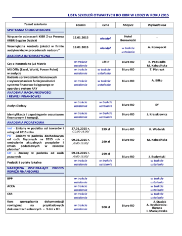 LISTA SZKOLEŃ OTWARTYCH RO KIBR W ŁODZI W ROKU 2015 Temat szkolenia Termin Cena Miejsce Wykładowca Wręczenie odznaczeń KIBR Z-ca Prezesa KRBR Bogdan Dębicki 12.01.2015 nieodpł. Hotel Borowiecki - Wewnętrzna kontrola jakości w firmie audytorskiej w procedurach nadzoru” 19.01.2015 nieodpł. w trakcie ustalania A. Konopacki w trakcie ustalania w trakcie ustalania 185 zł Biuro RO w trakcie ustalania Biuro RO K. Podsiadło M. Kabacińska T. Pietrzak w trakcie ustalania w trakcie ustalania Biuro RO A. Biłko SPOTKANIA ŚRODOWISKOWE AKADEMIA INFORMATYCZNA Czy e-Kontrola to już Matrix MS Offis (Excel, World, Power Point) w audycie Badanie sprawozdania finansowych z wykorzystaniem funkcjonalności systemu finanowo-księgowego w oparciu o system RAY AKADEMIA RACHUNKOWOŚCI I REWIZJI FINANSOWEJ Audyt śledczy w trakcie ustalania w trakcie ustalania Biuro RO EY Identyfikacja i zapobieganie oszustwom finansowym i korupcji. w trakcie ustalania w trakcie ustalania Biuro RO J. Kraszkiewicz 27.01.2015 r. 299 zł Biuro RO K. Woźniak Biuro RO M. Kabacińska Biuro RO J. Budzyński w trakcie ustalania AKADEMIA PODATKOWA VAT - Zmiany w podatku od towarów i usług od 2015 roku PIT - Zmiany w podatku dochodowym od osób fizycznych na 2015 rok omówienie aktualnych przepisów i zmain podatkowych w zakresie płatnika" CIT – Zmiany w podatku od osób prawnych 09.02.2015 r. /9.00-16.00/ 09.03.2015 r. /9.00-16.00/ w trakcie ustalania Podatki i opłaty lokalne NARZĘDZIA WSPIERAJĄCE REWIZJI FINANSOWEJ /10.00-16.00/ 299 zł 299 zł w trakcie ustalania PROCES BPP ACCA CSR Kurs sporządzania dokumentacji rewizyjnej na przykładowych dokumentach roboczych – 3 dni x 8 h w trakcie ustalania w trakcie ustalania w trakcie ustalania w trakcie ustalania 900 zł Biuro RO w trakcie ustalania w trakcie ustalania w trakcie ustalania A.Stasiak A. KryśkiewiczBurnos I. Maciejewska Temat szkolenia Termin Obowiązek kas fiskalnych kancelariach biegłych rewidentów w w trakcie ustalania Cena w trakcie ustalania Miejsce Wykładowca Biuro RO w trakcie ustalania SPOTKANIA 1-PONIEDZIAŁKOWE Zmiany w UoR oraz KSR – stan obecny 12.01.2015 r. /17.00 – 20.00/ 2.02.2015 r. Zmiany w podatku dochodowym obowiązującym od 01.01.2015 /17.00 – 20.00/ Rachunkowość mieszkaniowych /17:00 – 20:00/ spółdzielni 2.03.2015 r. 13.04.2015 r. Podatki bezpośrednie, PCC, spadki i darowizny /17.00 – 20.00/ Pomoc publiczna /17.00 – 20.00/ 4.05.2015r. 1.06.2015 r. Podatek akcyzowy /17.00 – 20.00/ 7.09.2015 r. w trakcie ustalania /17.00 – 20.00/ Podziały, połączenia, aporty, kapitałowe w PDOP, PDOF, VAT zyski 2.11.2015 r. Ceny transferowe Zamknięcie roku 2014 bilansowym SZKOLENIA MIĘKKIE Negocjacje cen Praca zespołowa 5.10.2015 r. /17.00 – 20.00/ /17.00 – 20.00/ w ujęciu 7.12.2015 r. /17.00 – 20.00/ w trakcie ustalania w trakcie ustalania nieodpł. nieodpł. nieodpł. nieodpł. nieodpł. nieodpł. Biuro RO Biuro RO Biuro RO Biuro RO Biuro RO Biuro RO B. Wilk A. Szeląg H. Daleszczyk M. Kabacińska mec. I. KołaczyńskaWyszogrodzka J. Budzyński nieodpł. Biuro RO w trakcie ustalania nieodpł. Biuro RO K. Burnos nieodpł Biuro RO mec. I. KołaczyńskaWyszogrodzka nieodpł Biuro RO (wykładowca KIDP) nieodpł. Biuro RO I. Batory nieodpł. Biuro RO I. Batory KRAJOWA IZBA BIEGŁYCH REWIDENTÓW REGIONALNY ODDZIAŁ W ŁODZI ul. Nowa 6/12 • 90-031 Łódź tel. (42) 639-99-23 fax (42) 674-35-01 • [email protected] • www.lodz.kibr.org.pl