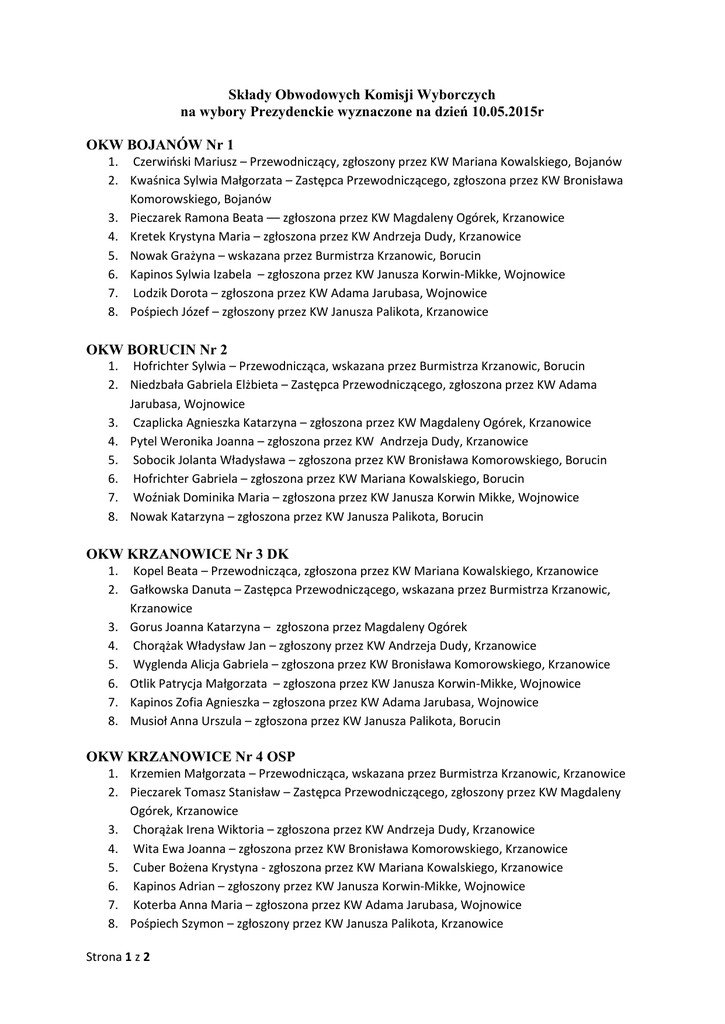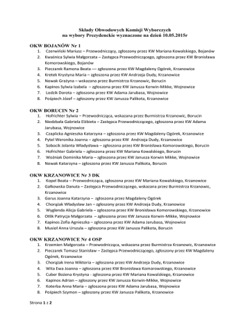 Składy Obwodowych Komisji Wyborczych na wybory Prezydenckie wyznaczone na dzień 10.05.2015r OKW BOJANÓW Nr 1 1. Czerwiński Mariusz – Przewodniczący, zgłoszony przez KW Mariana Kowalskiego, Bojanów 2. Kwaśnica Sylwia Małgorzata – Zastępca Przewodniczącego, zgłoszona przez KW Bronisława Komorowskiego, Bojanów 3. Pieczarek Ramona Beata –– zgłoszona przez KW Magdaleny Ogórek, Krzanowice 4. Kretek Krystyna Maria – zgłoszona przez KW Andrzeja Dudy, Krzanowice 5. Nowak Grażyna – wskazana przez Burmistrza Krzanowic, Borucin 6. Kapinos Sylwia Izabela – zgłoszona przez KW Janusza Korwin-Mikke, Wojnowice 7. Lodzik Dorota – zgłoszona przez KW Adama Jarubasa, Wojnowice 8. Pośpiech Józef – zgłoszony przez KW Janusza Palikota, Krzanowice OKW BORUCIN Nr 2 1. Hofrichter Sylwia – Przewodnicząca, wskazana przez Burmistrza Krzanowic, Borucin 2. Niedzbała Gabriela Elżbieta – Zastępca Przewodniczącego, zgłoszona przez KW Adama Jarubasa, Wojnowice 3. Czaplicka Agnieszka Katarzyna – zgłoszona przez KW Magdaleny Ogórek, Krzanowice 4. Pytel Weronika Joanna – zgłoszona przez KW Andrzeja Dudy, Krzanowice 5. Sobocik Jolanta Władysława – zgłoszona przez KW Bronisława Komorowskiego, Borucin 6. Hofrichter Gabriela – zgłoszona przez KW Mariana Kowalskiego, Borucin 7. Woźniak Dominika Maria – zgłoszona przez KW Janusza Korwin Mikke, Wojnowice 8. Nowak Katarzyna – zgłoszona przez KW Janusza Palikota, Borucin OKW KRZANOWICE Nr 3 DK 1. Kopel Beata – Przewodnicząca, zgłoszona przez KW Mariana Kowalskiego, Krzanowice 2. Gałkowska Danuta – Zastępca Przewodniczącego, wskazana przez Burmistrza Krzanowic, Krzanowice 3. Gorus Joanna Katarzyna – zgłoszona przez Magdaleny Ogórek 4. Chorążak Władysław Jan – zgłoszony przez KW Andrzeja Dudy, Krzanowice 5. Wyglenda Alicja Gabriela – zgłoszona przez KW Bronisława Komorowskiego, Krzanowice 6. Otlik Patrycja Małgorzata – zgłoszona przez KW Janusza Korwin-Mikke, Wojnowice 7. Kapinos Zofia Agnieszka – zgłoszona przez KW Adama Jarubasa, Wojnowice 8. Musioł Anna Urszula – zgłoszona przez KW Janusza Palikota, Borucin OKW KRZANOWICE Nr 4 OSP 1. Krzemien Małgorzata – Przewodnicząca, wskazana przez Burmistrza Krzanowic, Krzanowice 2. Pieczarek Tomasz Stanisław – Zastępca Przewodniczącego, zgłoszony przez KW Magdaleny Ogórek, Krzanowice 3. Chorążak Irena Wiktoria – zgłoszona przez KW Andrzeja Dudy, Krzanowice 4. Wita Ewa Joanna – zgłoszona przez KW Bronisława Komorowskiego, Krzanowice 5. Cuber Bożena Krystyna - zgłoszona przez KW Mariana Kowalskiego, Krzanowice 6. Kapinos Adrian – zgłoszony przez KW Janusza Korwin-Mikke, Wojnowice 7. Koterba Anna Maria – zgłoszona przez KW Adama Jarubasa, Wojnowice 8. Pośpiech Szymon – zgłoszony przez KW Janusza Palikota, Krzanowice Strona 1 z 2 OKW PIETRASZYN Nr 5 1. Kopel Jan – Przewodniczący, zgłoszony przez KW Mariana Kowalskiego, Krzanowice 2. Augustyn Gabriela Maria – Zastępca Przewodniczącego, zgłoszona przez KW Andrzeja Dudy, Krzanowice 3. Duda Irena – wskazana przez Burmistrza Krzanowice, Pietraszyn 4. Franica Aniela Agnieszka – zgłoszona przez KW Magdaleny Ogórek 5. Cwik Tomasz – zgłoszony przez KW Bronisława Komorowskiego, Krzanowice 6. Kulig Ilona Angelika – zgłoszona przez KW Janusza Korwin-Mikke, Wojnowice 7. Gawlica Monika Anna – zgłoszona przez KW Adama Jarubasa, Borucin 8. Ciupka Agata Jadwiga – zgłoszona przez KW Janusza Palikota, Krzanowice OKW WOJNOWICE Nr 6 1. Pytel Elżbieta Barbara – Przewodnicząca, zgłoszona przez KW Andrzeja Dudy, Krzanowice 2. Pośpiech Sabina – Zastępca Przewodniczącego, zgłoszona przez KW Mariana Kowalskiego, Krzanowice 3. Reisky Sylwia – wskazana przez Burmistrza Krzanowic, Borucin 4. Szynol-Gołębiowska Barbara – zgłoszony przez KW Magdaleny Ogórek, Wojnowice 5. Adamczyk Mateusz Krzysztof – zgłoszony przez KW Bronisława Komorowskiego, Wojnowice 6. Siegmund Rafael Stefan – zgłoszony przez KW Janusza Korwin-Mikke, Wojnowice 7. Kramarczyk Mateusz Martin – zgłoszony przez KW Adama Jarubasa, Wojnowice Strona 2 z 2