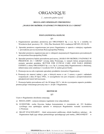 REGULAMIN SPRZEDAŻY PREMIOWEJ „MASŁO DO SKÓREK I PAZNOKCI W PREZENCIE ZA 1 GROSZ” POSTANOWIENIA OGÓLNE §1 1. Organizatorem sprzedaży premiowej jest ORGANIQUE Sp. z o.o. Sp. k. z siedzibą we Wrocławiu (kod pocztowy: 50 – 224), Plac Strzelecki 20/2 o nadanym NIP 895-193-94-59. 2. Sprzedaż premiowa organizowana jest przez Organizatora w oparciu o niniejszy regulamin i prowadzona jest na terytorium Rzeczypospolitej Polskiej. 3. Sprzedaż premiowa organizowana jest w sklepach stacjonarnych Organizatora prowadzonych na terytorium Rzeczpospolitej Polski. 4. Sprzedaż premiowa będzie prowadzona pod nazwą „MASŁO DO SKÓREK I PAZNOKCI W PREZENCIE ZA 1 GROSZ” (zwaną dalej Promocją), w ramach której przeprowadzona zostanie sprzedaż produktu: BUTTER FOR CUTICLE CARE AND NAILS (DERMO EXPERT) z oferty ORGANIQUE Sp. z o.o. Sp. k. (zwanej dalej Organizatorem) o obniżonej, rabatowanej cenie ustalonej w wysokości 0,01 zł. (jeden grosz) brutto. 5. Promocja ma na celu wspieranie sprzedaży produktów (towarów) Organizatora. 6. Promocja nie stanowi żadnej z gier, o których mowa w art. 2 ustawy o grach i zakładach wzajemnych z dnia 29 lipca 1992r., w szczególności nie jest związana z przeprowadzaniem jakiejkolwiek loterii lub losowania. 7. Promocja będzie prowadzona od 2 do 28 lutego 2017 r. lub do wyczerpania zapasów produktu promocyjnego wskazanego powyżej oraz w §4 pkt 1 Regulaminu. DEFINICJE §2 Użyte w Regulaminie określenia oznaczają: a) REGULAMIN - oznacza niniejszy regulamin wraz załącznikami. b) UCZESTNIK- osoba fizyczna, będąca konsumentem w rozumieniu art. 221 Kodeksu cywilnego oraz spełniająca opisane w niniejszym Regulaminie warunki uczestnictwa w Promocji. c) SKLEP STACJONARNY – lokal użyteczności publicznej, obiekt handlowy należący do Organizatora bądź jego sklepu partnerskiego sprzedającego pod marką „ORGANIQUE” w ramach łączących Strony umów franczyzowych, przeznaczony do detalicznej sprzedaży towarów. WARUNKI UCZESTNICTWA §3 1. Promocja skierowana jest do klientów indywidualnych oznaczających osoby fizyczne, będące konsumentami w rozumieniu art. 221 Kodeksu cywilnego, które w okresie promocyjnym wskazanym w § 1 pkt. 7 nabędą produkty objęte promocją wymienione w § 4 Regulaminu. W promocji nie mogą uczestniczyć: a) Pracownicy Organizatora, b) Inne osoby związane z przygotowaniem i przeprowadzeniem promocji, c) Małżonkowie, zstępni, rodzice, rodzeństwo osób wymienionych w punktach od a) do b). 2. Wzięcie udziału w Promocji oznacza: (1) zgodę Uczestnika na wszystkie warunki promocji określone niniejszym regulaminem (2) potwierdzenie spełnienia warunków uprawniających do wzięcia udziału w promocji. ZASADY AKCJI PROMOCYJNEJ §4 1. Organizator określa, iż przedmiotem promocji jest produkt kosmetyczny: MASŁO DO SKÓREK I PAZNOKCI (ang. nazwa: BUTTER FOR CUTICLE CARE AND NAILS, poj. 15 ml). 2. Organizator postanawia, iż w przypadku nabycia w ramach jednorazowych zakupów (zwanych dalej koszykiem zakupów) w okresie trwania promocji przez Uczestnika Promocji produktów o łącznej wartości koszyka zakupów przewyższającej lub równej kwocie 100 zł brutto Uczestnik Promocji będzie uprawniony do nabycia MASŁA DO SKÓREK I PAZNOKCI - sztuk 1 w cenie 0,01 zł. (jeden grosz) brutto. 3. Promocja nie łączy się z innymi promocjami i rabatami Organizatora. 4. Produkt objęty promocją, zakupiony w ramach uczestnictwa w Promocji nie podlega zwrotowi. POSTANOWIENIA KOŃCOWE §5 1. Regulamin promocji dostępny będzie w siedzibie Organizatora, w sklepach stacjonarnych Organizatora oraz na stronie internetowej http://www.organique.pl/promocje/. 2. Prawa i obowiązki związane z promocją nie mogą być przenoszone na inne podmioty. 3. Organizator zastrzega sobie prawo do ostatecznego rozstrzygania kwestii spornych związanych z Promocją. 4. W sprawach nieuregulowanych Regulaminem mają zastosowanie przepisy powszechnie obowiązującego prawa. Wszelkie materiały promocyjno – reklamowe mają charakter wyłącznie informacyjny. Wrocław, dnia: 26.01.2017 r.