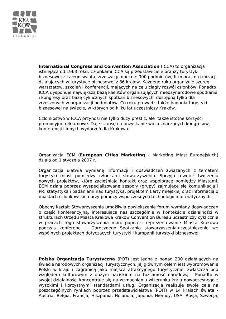 International Congress and Convention Association (ICCA) to organizacja istniejąca od 1963 roku. Członkami ICCA są przedstawiciele branży turystyki biznesowej z całego świata, zrzeszając obecnie 900 podmiotów, firm oraz organizacji działających w turystyce biznesowej z 86 krajów. Każdego roku organizuje szereg warsztatów, szkoleń i konferencji, mających na celu ciągły rozwój członków. Ponadto ICCA dysponuje największą bazą klientów organizujących międzynarodowe spotkania i kongresy oraz bazę cyklicznych spotkań biznesowych dostępną tylko dla zrzeszonych w organizacji podmiotów. Co roku prowadzi także badania turystyki biznesowej na świecie, w których od kilku lat uczestniczy Kraków. Członkostwo w ICCA przynosi nie tylko duży prestiż, ale także istotne korzyści promocyjno-reklamowe. Daje szansę na pozyskanie wielu znaczących kongresów, konferencji i innych wydarzeń dla Krakowa. Organizacja ECM (European Cities Marketing - Marketing Miast Europejskich) działa od 1 stycznia 2007 r. Organizacja ułatwia wymianę informacji i doświadczeń związanych z tematem turystyki miast pomiędzy członkami stowarzyszenia. Sprzyja również tworzeniu nowych projektów, które zacieśniają kontakt oraz współpracę pomiędzy Miastami. ECM działa poprzez wyspecjalizowane zespoły (grupy) zajmujące się komunikacją i PR, statystyką i badaniami nad turystyką, projektem karty miejskiej oraz informacją o miastach członkowskich przy pomocy współczesnych technologii informatycznych. Obecny kształt Stowarzyszenia umożliwia powiększenie forum wymiany doświadczeń o część konferencyjną, interesującą nas szczególnie w kontekście działalności w strukturach Urzędu Miasta Krakowa Krakow Convention Bureau uczestniczy cyklicznie w pracach tego stowarzyszenia m.in. poprzez: reprezentowanie Miasta Krakowa podczas konferencji i Dorocznego Spotkania stowarzyszenia,uczestniczenie we wspólnych projektach dotyczących turystyki i kampanii turystyki biznesowej. Polska Organizacja Turystyczna (POT) jest jedną z ponad 200 działających na świecie narodowych organizacji turystycznych. Jej głównym celem jest wypromowanie Polski w kraju i zagranicą jako miejsca atrakcyjnego turystycznie, zwłaszcza pod względem kulturowym z dużym naciskiem na tożsamość narodową. Ponadto w swojej działalności koncentruje się na wzmacnianiu wizerunku kraju nowoczesnego z wysokimi i korzystnymi standardami usług. Organizacja realizuje swoje cele na poszczególnych rynkach poprzez przedstawicielstwa (POIT) w 14 krajach świata Austria, Belgia, Francja, Hiszpania, Holandia, Japonia, Niemcy, USA, Rosja, Szwecja, Węgry, Wielka Brytania, Włochy, Ukraina. Od lipca 2015 roku Kraków jest Rekomendowanym Biurem Kongresów przez POT. Powered by TCPDF (www.tcpdf.org)