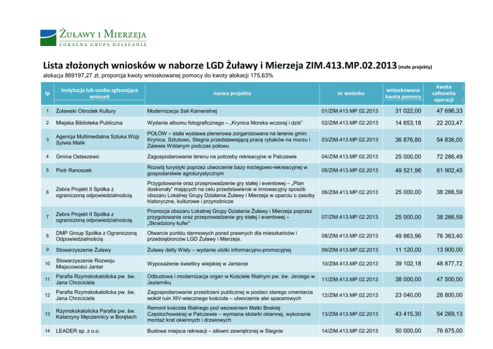 Lista złożonych wniosków w naborze LGD Żuławy i Mierzeja ZIM.413.MP.02.2013 (małe projekty) alokacja 869197,27 zł, proporcja kwoty wnioskowanej pomocy do kwoty alokacji 175,63% lp instytucja lub osoba zgłaszająca wniosek nazwa projektu nr wniosku wnioskowana kwota pomocy kwota całkowita operacji 1 Żuławski Ośrodek Kultury Modernizacja Sali Kameralnej 01/ZIM.413.MP.02.2013 31 022,00 47 696,33 2 Miejska Biblioteka Publiczna Wydanie albumu fotograficznego – „Krynica Morska wczoraj i dziś” 02/ZIM.413.MP.02.2013 14 653,18 22 203,47 3 Agencja Multimedialna Sztuka Wizji Sylwia Malik POŁÓW – stała wystawa plenerowa zorganizowana na terenie gmin: Krynica, Sztutowo, Stegna przedstawiającą pracę rybaków na morzu i Zalewie Wiślanym podczas połowu 03/ZIM.413.MP.02.2013 36 876,80 54 836,00 4 Gmina Ostaszewo Zagospodarowanie terenu na potrzeby rekreacyjne w Palczewie 04/ZIM.413.MP.02.2013 25 000,00 72 286,49 5 Piotr Ranoszek Rozwój turystyki poprzez utworzenie bazy noclegowo-rekreacyjnej w gospodarstwie agroturystycznym 05/ZIM.413.MP.02.2013 49 521,96 61 902,45 6 Zebra Projekt II Spółka z ograniczoną odpowiedzialnością Przygotowanie oraz przeprowadzenie gry stałej i eventowej – „Plan doskonały” mających na celu przedstawienie w innowacyjny sposób obszaru Lokalnej Grupy Działania Żuławy i Mierzeja w oparciu o zasoby historyczne, kulturowe i przyrodnicze 06/ZIM.413.MP.02.2013 25 000,00 38 266,59 7 Zebra Projekt II Spółka z ograniczoną odpowiedzialnością Promocja obszaru Lokalnej Grupy Działania Żuławy i Mierzeja poprzez przygotowanie oraz przeprowadzenie gry stałej i eventowej – „Skradziony kufer” 07/ZIM.413.MP.02.2013 25 000,00 38 266,59 8 DMP Group Spółka z Ograniczoną Odpowiedzialnością Otwarcie punktu darmowych porad prawnych dla mieszkańców i przedsiębiorców LGD Żuławy i Mierzeja. 08/ZIM.413.MP.02.2013 49 863,96 76 363,40 9 Stowarzyszenie Żuławy Żuławy delty Wisły – wydanie ulotki informacyjno-promocyjnej 09/ZIM.413.MP.02.2013 11 120,00 13 900,00 10 Stowarzyszenie Rozwoju Miejscowości Jantar Wyposażenie świetlicy wiejskiej w Jantarze 10/ZIM.413.MP.02.2013 39 102,18 48 877,72 11 Parafia Rzymskokatolicka pw. św. Jana Chrzciciela Odbudowa i modernizacja organ w Kościele filialnym pw. św. Jerzego w Jezierniku 11/ZIM.413.MP.02.2013 38 000,00 47 500,00 12 Parafia Rzymskokatolicka pw. św. Jana Chrzciciela Zagospodarowanie przestrzeni publicznej w postaci starego cmentarza wokół ruin XIV-wiecznego kościoła – utworzenie alei spacerowych 12/ZIM.413.MP.02.2013 23 040,00 28 800,00 13 Rzymskokatolicka Parafia pw. św. Katarzyny Męczennicy w Borętach Remont kościoła filialnego pod wezwaniem Matki Boskiej Częstochowskiej w Palczewie – wymiana stolarki okiennej, wykonanie montaż krat okiennych i drzwiowych 13/ZIM.413.MP.02.2013 43 415,30 54 269,13 14 LEADER sp. z o.o. Budowa miejsca rekreacji – siłowni zewnętrznej w Stegnie 14/ZIM.413.MP.02.2013 50 000,00 76 875,00 15 Lokalna Organizacja Turystyczna ”Jantarowe Wybrzeże” Promocja Mierzei Wiślanej i Żuław poprzez organizację Study Tour dla operatorów turystyki i dziennikarzy z Obwodu Kaliningradzkiego 15/ZIM.413.MP.02.2013 50 000,00 62 500,00 16 Stowarzyszenie ”Nowa Góra” Wyposażenie pomieszczenia w działającej świetlicy w Nowej Kościelnicy 42, celem przygotowania się Stowarzyszenia do współpracy z ECF w 16/ZIM.413.MP.02.2013 Brukseli 18 408,80 23 252,00 17 Stowarzyszenie ”Nowa Góra” Promowanie żuławskiego krajobrazu i zabytków przez turystykę rowerową na obszarze LGD 17/ZIM.413.MP.02.2013 15 500,00 19 481,20 18 Stowarzyszenie ”Nowa Góra” Wzbogacenie wyposażenia w Fitness Klubie działającym w istniejącej wiejskiej świetlicy w Nowej Kościelnicy 42 18/ZIM.413.MP.02.2013 15 670,00 20 007,20 19 Stowarzyszenie ”Nowa Góra” Nauka j. angielskiego w działającej świetlicy wiejskiej w Nowej Kościelnicy 42 19/ZIM.413.MP.02.2013 19 500,00 24 600,00 20 Stowarzyszenie ”Nowa Góra” Przygoda z historią, kulturą i sztuką 20/ZIM.413.MP.02.2013 10 230,00 12 870,00 21 Stowarzyszenie Rowerover Żuławy wkoło – ogólnopolski szosowy maraton rowerowy 21/ZIM.413.MP.02.2013 50 000,00 73 100,00 22 Stowarzyszenie ”Drewnica” Utworzenie ścieżki rekreacyjno-dydaktycznej w istniejącym parku we wsi 22/ZIM.413.MP.02.2013 Drewnica 30 061,76 37 577,20 23 Bondi Anna Dominiak Stworzenie Akademii Kulinarnej promującej tradycyjne receptury gastronomiczne i zasoby Mierzei Wiślanej i Żuław 23/ZIM.413.MP.02.2013 50 000,00 76 875,00 24 Jacek Opitz Przygotowanie i wydanie przewodnika Żuław delty Wisły 24/ZIM.413.MP.02.2013 46 000,00 57 500,00 25 Powiat Nowodworski Rozwój turystyki i rekreacji poprzez remont dachu lokomotywowni w Nowym Dworze Gdańskim 25/ZIM.413.MP.02.2013 50 000,00 86 892,47 26 Powiat Nowodworski Kultywowanie i promocja bożonarodzeniowych tradycji Żuław i Mierzei Wiślanej oraz organizacja Wigilii Żuław i Mierzei Wiślanej 26/ZIM.413.MP.02.2013 24 563,20 37 291,40 27 Agnieszka Maria Janus Album turystyczno-poznawczy terenu Żuław i Mierzei Wiślanej 27/ZIM.413.MP.02.2013 50 000,00 65 784,00 28 Tomasz Krzysztof Rusinowicz Wydanie albumu-przewodnika – „Wodami Żuław” 28/ZIM.413.MP.02.2013 50 000,00 65 784,00 29 Parafia Rzymskokatolicka pw. Niepokalanego Poczęcia Najświętszej Maryi Panny w Marzęcinie Ochrona i zachowanie dziedzictwa kulturowego kościoła parafialnego w Marzęcinie poprzez doposażenie kościoła parafialnego oraz jego odnowienie 29/ZIM.413.MP.02.2013 50 000,00 75 723,50 30 Gminny Dom Kultury i Sportu w Ostaszewie Zagospodarowanie terenu na boisko do tenisa ziemnego w parku w Ostaszewie 30/ZIM.413.MP.02.2013 10 092,80 15 517,68 31 Gminny Dom Kultury i Sportu w Ostaszewie Dni edukacji kulturalnej w Ostaszewie 31/ZIM.413.MP.02.2013 37 440,00 49 629,00 32 Gminny Dom Kultury i Sportu w Ostaszewie Zagospodarowanie terenu na rowerowy plac zabaw – pumptrack w Piaskowcu 32/ZIM.413.MP.02