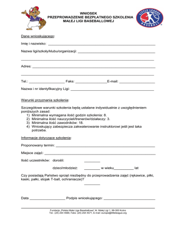 WNIOSEK O PRZEPROWADZENIE BEZPŁATNEGO SZKOLENIA MAŁEJ LIGI BASEBALLOWEJ Dane wnioskującego: Imię i nazwisko: ______________________________________________________ Nazwa ligi/szkoły/klubu/organizacji: _______________________________________ ___________________________________________________________________ Adres: ______________________________________________________________ ___________________________________________________________________ Tel.: __________________ Faks: ________________E-mail: __________________ Nazwa i nr identyfikacyjny Ligi: __________________________________________ Warunki przyznania szkolenia: Szczegółowe warunki szkolenia będą ustalane indywidualnie z uwzględnieniem poniższych zasad: 1) Minimalna wymagana ilość godzin szkolenia: 8. 2) Minimalna ilość nauczycieli/trenerów/działaczy: 3. 3) Minimalna ilość zawodników: 18. 4) Wnioskujący zabezpiecza zakwaterowanie instruktorowi jeśli jest taka potrzeba. Informacje dotyczące szkolenia: Proponowany termin: __________________________________________________ Miejsce zajęć: ________________________________________________________ Ilość uczestników: dorośli: dzieci/młodzież: ________ ________ w wieku__________ lat Czy posiadają Państwo sprzęt niezbędny do przeprowadzenia zajęć (rękawice, piłki, kaski, pałki, stojak T-ball, ochraniacze)? ________ Data __________________ Podpis wnioskującego: __________________________ Fundacja „Polska Mała Liga Baseballowa” Al. Małej Ligi 1, 99-300 Kutno Tel.: (24) 254 4569, Faks: (24) 254 4571, E-mail: [email protected]