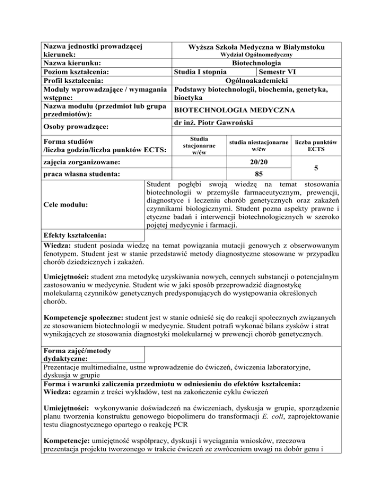 Nazwa jednostki prowadzącej kierunek: Nazwa kierunku: Poziom kształcenia: Profil kształcenia: Moduły wprowadzające / wymagania wstępne: Nazwa modułu (przedmiot lub grupa przedmiotów): Forma studiów /liczba godzin/liczba punktów ECTS: praca własna studenta: Cele modułu: Wydział Ogólnomedyczny Biotechnologia Studia I stopnia Semestr VI Ogólnoakademicki Podstawy biotechnologii, biochemia, genetyka, bioetyka BIOTECHNOLOGIA MEDYCZNA dr inż. Piotr Gawroński Osoby prowadzące: zajęcia zorganizowane: Wyższa Szkoła Medyczna w Białymstoku Studia stacjonarne w/ćw studia niestacjonarne w/ćw liczba punktów ECTS 20/20 5 85 Student pogłębi swoją wiedzę na temat stosowania biotechnologii w przemyśle farmaceutycznym, prewencji, diagnostyce i leczeniu chorób genetycznych oraz zakażeń czynnikami biologicznymi. Student pozna aspekty prawne i etyczne badań i interwencji biotechnologicznych w szeroko pojętej medycynie i farmacji. Efekty kształcenia: Wiedza: student posiada wiedzę na temat powiązania mutacji genowych z obserwowanym fenotypem. Student jest w stanie przedstawić metody diagnostyczne stosowane w przypadku chorób dziedzicznych i zakażeń. Umiejętności: student zna metodykę uzyskiwania nowych, cennych substancji o potencjalnym zastosowaniu w medycynie. Student wie w jaki sposób przeprowadzić diagnostykę molekularną czynników genetycznych predysponujących do występowania określonych chorób. Kompetencje społeczne: student jest w stanie odnieść się do reakcji społecznych związanych ze stosowaniem biotechnologii w medycynie. Student potrafi wykonać bilans zysków i strat wynikających ze stosowania diagnostyki molekularnej w prewencji chorób genetycznych. Forma zajęć/metody dydaktyczne: Prezentacje multimedialne, ustne wprowadzenie do ćwiczeń, ćwiczenia laboratoryjne, dyskusja w grupie Forma i warunki zaliczenia przedmiotu w odniesieniu do efektów kształcenia: Wiedza: egzamin z treści wykładów, test na zakończenie cyklu ćwiczeń Umiejętności: wykonywanie doświadczeń na ćwiczeniach, dyskusja w grupie, sporządzenie planu tworzenia konstruktu genowego biopolimeru do transformacji E. coli, zaprojektowanie testu diagnostycznego opartego o reakcję PCR Kompetencje: umiejętność współpracy, dyskusji i wyciągania wniosków, rzeczowa prezentacja projektu tworzonego w trakcie ćwiczeń ze zwróceniem uwagi na dobór genu i uzasadnienie proponowanych technik laboratoryjnych Treści programowe: Wykłady: studia niestacjonarne 1. 2. 3. 4. 5. Biotechnologia w przemyśle farmaceutycznym i medycynie – wprowadzenie. (2h) Wykrywanie mutacji genetycznych odpowiedzialnych za zmiany fenotypowe. (2h) Diagnostyka chorób dziedzicznych: badania populacji i grup ryzyka. (2h) Diagnostyka zaburzeń wynikających z mutacji somatycznych. (2h) Linie komórkowe wyprowadzone z materiału klinicznego jako model stosowany w badaniach naukowych. (2h) 6. Diagnostyka zakażeń wirusowych, bakteryjnych, grzybiczych i pasożytniczych. (2h) 7. Terapia substytucyjna na poziomie DNA i produktów genów. (2h) 8. Nanotechnologie w medycynie. (2h) 9. Nanotechnologie w w farmacji – nowe nośniki leków. (2h) 10. Aspekty prawne i etyczne stosowania biotechnologii w szeroko rozumianej medycynie i farmacji. (2h) Ćwiczenia: studia niestacjonarne 1. Biopolimery o potencjalnym zastosowaniu medycznym. Projektowanie konstruktu genowego. (3h) 2. Kolejne etapy tworzenia i walidacji konstruktu genowego. Transformacja bakterii E. coli. (3h) 3. Promieniowce glebowe jako źródło antybiotyków. (3h) 4. Projektowanie diagnostycznych testów genetycznych. (3h) 5. Izolacja DNA z komórek nabłonkowych. (3h) 6. Określanie predyspozycji do schorzeń za pomocą reakcji PCR. (3h) 7. Test teoretyczny. (2h) Literatura podstawowa: 1. Kayser O., Muller R.H.: Biotechnologia farmaceutyczna. Wyd. PZWL, Warszawa 2003 2. Scriver A.L. i inni. Metabolic and Molecular Basis of Inherited Diseases. Mc Graw Hill 1995 3. Markiewicz Z.: Bakterie w biologii , biotechnologii i medycynie. Wyd. PWN, Warszawa 2000 4. Bednarski W., Repsa A.: Biotechnologia żywności: praca zbiorowa. Wyd. N-T, Warszawa 2001; Literatura uzupełniająca: 1. Barbusiński K.: Leksykon biotechnologii środowiskowej. Wyd. PWN, Warszawa 1993; 2. Leśniak W.: Biotechnologia żywności: procesy fermentacji i biosyntezy. Wyd. Akademia Ekonomiczna im. O. Langego, Wrocław 2002