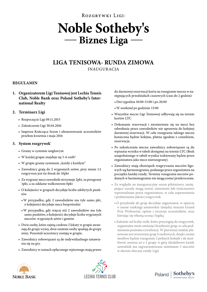 LIGA TENISOWA- RUNDA ZIMOWA INAUGURACJA REGULAMIN 1. Organizatorem Ligi Tenisowej jest Lechia Tennis Club, Noble Bank oraz Poland Sotheby’s International Realty 2. Terminarz Ligi • Rozpoczęcie Ligi 09.11.2015 • Zakończenie Ligi 30.04.2016 • Impreza Kończąca Sezon i uhonorowanie uczestników przełom kwietnia i maja 2016 3. System rozgrywek* • Gramy w systemie singlowym • W każdej grupie znajduje się 5-6 osób* • W grupie gramy systemem „każdy z każdym” • Zawodnicy grają do 2 wygranych setów, przy stanie 1:1 rozgrywan jest tie-break do 10pkt • Za wygrany mecz zawodnik otrzymuje 2pkt, za przegrany 1pkt, a za oddanie walkowerem 0pkt • O kolejności w grupach decyduje liczba zdobytych punktów •W przypadku, gdy 2 zawodników ma tyle samo pkt, o kolejności decyduje mecz bezpośredni •W przypadku, gdy więcej niż 2 zawodników ma tyle samo punktów, o kolejności decyduje liczba wygranych meczów, wygranych setów i gemów. • Dwie osoby, które zajmą czołowe 2 lokaty w grupie awansują do grupy wyżej, dwie ostatnie osoby spadają do grupy niżej. Pozostali uczestnicy zostają w grupie. • Zawodnicy zobowiązani są do indywidualnego umawiania się na gry. • Zawodnicy w ramach opłaconego wpisowego mają prawo do darmowej rezerwacji kortu na rozegranie meczu w następujących przedziałach czasowych (czas do 2 godzin): •Dni tygodnia 10:00-15:00 i po 20:00 •W weekend po godzinie 13:00 • Wszystkie mecze Ligi Tenisowej odbywają się na terenie kortów LTC • Dokonanie rezerwacji i niestawienie się na mecz bez odwołania przez zawodników nie uprawnia do kolejnej darmowej rezerwacji. W celu rozegrania takiego meczu konieczna będzie kolejna, płatna zgodnie z cennikiem, rezerwacja. • Po zakończeniu meczu zawodnicy zobowiązani są do wpisania wyniku w tabeli dostępnej na terenie LTC (Brak uzupełnionego w tabeli wyniku traktowany będzie przez organizatora jako mecz nierozegrany). • Zawodnicy mają obowiązek rozgrywania meczów ligowych wg harmonogramu, podanego przez organizatora na początku każdej rundy. Terminy rozegrania meczów podanych w harmonogramie nie mogą zostać przekroczone. • Ze względu na inauguracyjny sezon pilotażowy, następujące zasady mogą zostać zmienione lub tymczasowo wprowadzone przez organizatora, w celu usprawnienia i podniesienia jakości rozgrywek: •O przydziale do grup decyduje organizator, w oparciu o znane rankingi amatorskie (między innymi Grand Prix Wybrzeża), opinie i recenzje uczestników, oraz kierując się własną oceną i logiką •Zależnie od liczby osób, które przystąpią do rozgrywek, organizator może zmieniać liczebność grup, w celu podniesienia poziomu rywalizacji. W pierwszej rundzie planowane jest stworzenie grup 4 osobowych, dzięki czemu możliwe będzie rozegranie 2 pełnych kolejek i da możliwość awansu aż o 2 grupy w górę (dodatkowo każdy zawodnik ma zagwarantowane minimum 5 meczów w okresie obecnej rundy Ligi) 4. Zgłoszenia • Zgłoszenia do Ligi Tenisowej przyjmowane są osobiście lub telefonicznie w recepcji LTC lub u Koordynatora Ligi • Zgłaszający powinien podać swoje dane osobowe, numer kontaktowy oraz ocenić swój poziom gry w skali 1-10 (1 początkujący… 10 były zawodnik i częsty uczestnik turniejów) 5. Opłaty • Każdy zgłoszony zawodnik zobowiązuje się uiścić opłatę w wysokości 150zł przed rozpoczęciem swojego pierwszego meczu w ramach Ligii (dotyczy to każdej tury z osobna, w okresie zimowym planowane jest rozegranie czterech pełnych tur). • Dokonanie opłaty powoduje, że gracze nie płacą już dodatkowo • za korzystanie z kortów podczas rozgrywania swoich pojedynków. • Nie uiszczenie opłaty w terminie skutkować będzie nie dopuszczeniem do gry. • Nie uiszczenie opłaty i nie rozegranie żadnego meczu przez pierwsze 2 tygodnie Ligii również skutkować będzie usunięciem z rozgrywek. 6. Nagrody • Za zajęcie pierwszego miejsca (1. miejsce w najwyższej grupie) - Puchar, 100% zniżki na wpisowe w kolejnej edycji Ligi, Nagrody rzeczowe: Torba Tenisowa Head • Za zajęcie 2. miejsca - Puchar, 50% zniżki na wpisowe w kolejnej edycji Ligi, Nagrody rzeczowe: zestaw czterech naciągów firmy Head • Za zajęcie 3. miejsca - Puchar, 30% zniżki na wpisowe do kolejnej edycji Ligi, Nagrody rzeczowe: Piłki i owijki Firmy Head • Wręczenie Pucharów i Nagród odbędzie się na koniec sezonu w Klubie lub podczas planowanej imprezy cyklicznej „Zakończenie Sezonu” 7. Postanowienia końcowe • Wszelkie sprawy nieobjęte regulaminem oraz spory rozstrzyga Koordynator Ligi Michał Kolarczyk • Tabele wyników z bieżącym stanem gier będą dostępne w budynku klubowym Lechia Tennis Club oraz na stronie internetowej: www.lechiatennisclub.pl • Sędzia główny: Michał Kolarczyk, tel. 501-399-266 Zapraszamy do rywalizacji i świetnej zabawy