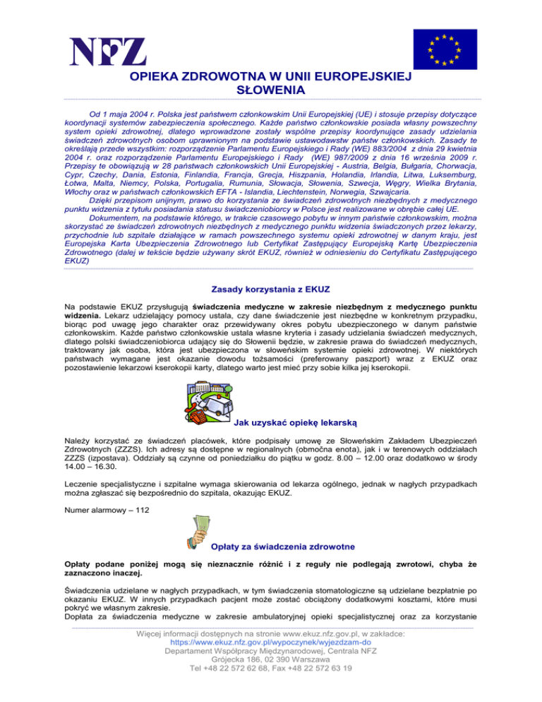 OPIEKA ZDROWOTNA W UNII EUROPEJSKIEJ SŁOWENIA Od 1 maja 2004 r. Polska jest państwem członkowskim Unii Europejskiej (UE) i stosuje przepisy dotyczące koordynacji systemów zabezpieczenia społecznego. Każde państwo członkowskie posiada własny powszechny system opieki zdrowotnej, dlatego wprowadzone zostały wspólne przepisy koordynujące zasady udzielania świadczeń zdrowotnych osobom uprawnionym na podstawie ustawodawstw państw członkowskich. Zasady te określają przede wszystkim: rozporządzenie Parlamentu Europejskiego i Rady (WE) 883/2004 z dnia 29 kwietnia 2004 r. oraz rozporządzenie Parlamentu Europejskiego i Rady (WE) 987/2009 z dnia 16 września 2009 r. Przepisy te obowiązują w 28 państwach członkowskich Unii Europejskiej - Austria, Belgia, Bułgaria, Chorwacja, Cypr, Czechy, Dania, Estonia, Finlandia, Francja, Grecja, Hiszpania, Holandia, Irlandia, Litwa, Luksemburg, Łotwa, Malta, Niemcy, Polska, Portugalia, Rumunia, Słowacja, Słowenia, Szwecja, Węgry, Wielka Brytania, Włochy oraz w państwach członkowskich EFTA - Islandia, Liechtenstein, Norwegia, Szwajcaria. Dzięki przepisom unijnym, prawo do korzystania ze świadczeń zdrowotnych niezbędnych z medycznego punktu widzenia z tytułu posiadania statusu świadczeniobiorcy w Polsce jest realizowane w obrębie całej UE. Dokumentem, na podstawie którego, w trakcie czasowego pobytu w innym państwie członkowskim, można skorzystać ze świadczeń zdrowotnych niezbędnych z medycznego punktu widzenia świadczonych przez lekarzy, przychodnie lub szpitale działające w ramach powszechnego systemu opieki zdrowotnej w danym kraju, jest Europejska Karta Ubezpieczenia Zdrowotnego lub Certyfikat Zastępujący Europejską Kartę Ubezpieczenia Zdrowotnego (dalej w tekście będzie używany skrót EKUZ, również w odniesieniu do Certyfikatu Zastępującego EKUZ) Zasady korzystania z EKUZ Na podstawie EKUZ przysługują świadczenia medyczne w zakresie niezbędnym z medycznego punktu widzenia. Lekarz udzielający pomocy ustala, czy dane świadczenie jest niezbędne w konkretnym przypadku, biorąc pod uwagę jego charakter oraz przewidywany okres pobytu ubezpieczonego w danym państwie członkowskim. Każde państwo członkowskie ustala własne kryteria i zasady udzielania świadczeń medycznych, dlatego polski świadczeniobiorca udający się do Słowenii będzie, w zakresie prawa do świadczeń medycznych, traktowany jak osoba, która jest ubezpieczona w słoweńskim systemie opieki zdrowotnej. W niektórych państwach wymagane jest okazanie dowodu tożsamości (preferowany paszport) wraz z EKUZ oraz pozostawienie lekarzowi kserokopii karty, dlatego warto jest mieć przy sobie kilka jej kserokopii. Jak uzyskać opiekę lekarską Należy korzystać ze świadczeń placówek, które podpisały umowę ze Słoweńskim Zakładem Ubezpieczeń Zdrowotnych (ZZZS). Ich adresy są dostępne w regionalnych (območna enota), jak i w terenowych oddziałach ZZZS (izpostava). Oddziały są czynne od poniedziałku do piątku w godz. 8.00 – 12.00 oraz dodatkowo w środy 14.00 – 16.30. Leczenie specjalistyczne i szpitalne wymaga skierowania od lekarza ogólnego, jednak w nagłych przypadkach można zgłaszać się bezpośrednio do szpitala, okazując EKUZ. Numer alarmowy – 112 Opłaty za świadczenia zdrowotne Opłaty podane poniżej mogą się nieznacznie różnić i z reguły nie podlegają zwrotowi, chyba że zaznaczono inaczej. Świadczenia udzielane w nagłych przypadkach, w tym świadczenia stomatologiczne są udzielane bezpłatnie po okazaniu EKUZ. W innych przypadkach pacjent może zostać obciążony dodatkowymi kosztami, które musi pokryć we własnym zakresie. Dopłata za świadczenia medyczne w zakresie ambulatoryjnej opieki specjalistycznej oraz za korzystanie Więcej informacji dostępnych na stronie www.ekuz.nfz.gov.pl, w zakładce: https://www.ekuz.nfz.gov.pl/wypoczynek/wyjezdzam-do Departament Współpracy Międzynarodowej, Centrala NFZ Grójecka 186, 02 390 Warszawa Tel +48 22 572 62 68, Fax +48 22 572 63 19 z leczenia szpitalnego, w zależności od rodzaju świadczeń wynosi 20% lub 30%, które jest liczone od całkowitego kosztu danego świadczenia. Dopłata za stomatologiczne leczenie protetyczne dorosłych wynosi 90%. Niektóre leki na receptę są bezpłatne, a za niektóre obowiązuje dopłata 30% , 90% lub 100% ceny. Dopłata za wyroby medyczne wynosi 30%, 90% lub 100% . W przypadku leczenia szpitalnego, produkty lecznicze są wydawane bezpłatnie jako nieodłączny element leczenia. Transport medyczny wymaga skierowania lekarza. Transport do szpitala na terytorium Słowenii w nagłych przypadkach jest bezpłatny. W innych przypadkach należy zapłacić 90% jego kosztów. Transport powrotny do Polski jest generalnie opłacany przez pacjenta. UWAGA! EKUZ nie zapewnia pokrycia kosztów transportu medycznego do Polski oraz obowiązujących na Słowenii opłat za świadczenia medyczne, dlatego aby uniknąć obciążenia tymi kosztami, wskazane jest wykupienie dodatkowego prywatnego ubezpieczenia. Recepty Lekarze, którzy zawarli umowy z ZZZS są uprawnieni do wystawiania recept na leki objęte refundacją. Leki można uzyskać w aptekach posiadających umowy z ZZZS, na podstawie recepty. Leczenie prywatne Koszty leczenia uzyskanego w placówce funkcjonującej poza publicznym systemem ochrony zdrowia na Słowenii pacjent pokrywa w całości we własnym zakresie. Dokumenty niezbędne do uzyskania zwrotu poniesionych kosztów W celu uzyskania zwrotu kosztów należy zwrócić się z wnioskiem do właściwego oddziału NFZ po powrocie do Polski. Do wniosku o zwrot kosztów należy załączyć: oryginały rachunków i dowodów zapłaty. Miejsce, gdzie w razie wątpliwości można uzyskać informacje Wszelkie informacje można uzyskać w regionalnych oddziałach Słoweńskiego Zakładu Ubezpieczeń Zdrowotnych (ZZZS), bądź w instytucji łącznikowej: Zavod za zdravstveno zavarovanje Slovenije (ZZZS) Miklošič