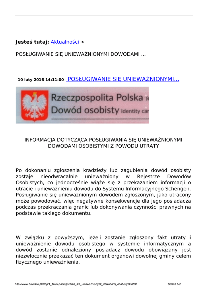 Jesteś tutaj: Aktualności > POSŁUGIWANIE SIĘ UNIEWAŻNIONYMI DOWODAMI ... 10 luty 2016 14:11:00 POSŁUGIWANIE SIĘ UNIEWAŻNIONYMI... INFORMACJA DOTYCZĄCA POSŁUGIWANIA SIĘ UNIEWAŻNIONYMI DOWODAMI OSOBISTYMI Z POWODU UTRATY Po dokonaniu zgłoszenia kradzieży lub zagubienia dowód osobisty zostaje nieodwracalnie unieważniony w Rejestrze Dowodów Osobistych, co jednocześnie wiąże się z przekazaniem informacji o utracie i unieważnieniu dowodu do Systemu Informacyjnego Schengen. Posługiwanie się unieważnionym dowodem zgłoszonym, jako utracony może powodować, więc negatywne konsekwencje dla jego posiadacza podczas przekraczania granic lub dokonywania czynności prawnych na podstawie takiego dokumentu. W związku z powyższym, jeżeli zostanie zgłoszony fakt utraty i unieważnienie dowodu osobistego w systemie informatycznym a dowód zostanie odnaleziony posiadacz dowodu obowiązany jest niezwłocznie przekazać ten dokument organowi dowolnej gminy celem fizycznego unieważnienia. http://www.osielsko.pl/blog/1_1626-poslugiwanie_sie_uniewaznionymi_dowodami_osobistymi.html Strona 1/2 drukuj Wróć http://www.osielsko.pl/blog/1_1626-poslugiwanie_sie_uniewaznionymi_dowodami_osobistymi.html Powered by TCPDF (www.tcpdf.org) Strona 2/2
