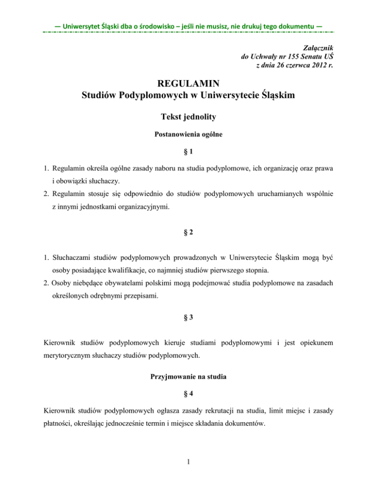 — Uniwersytet Śląski dba o środowisko – jeśli nie musisz, nie drukuj tego dokumentu — Załącznik do Uchwały nr 155 Senatu UŚ z dnia 26 czerwca 2012 r. REGULAMIN Studiów Podyplomowych w Uniwersytecie Śląskim Tekst jednolity Postanowienia ogólne §1 1. Regulamin określa ogólne zasady naboru na studia podyplomowe, ich organizację oraz prawa i obowiązki słuchaczy. 2. Regulamin stosuje się odpowiednio do studiów podyplomowych uruchamianych wspólnie z innymi jednostkami organizacyjnymi. §2 1. Słuchaczami studiów podyplomowych prowadzonych w Uniwersytecie Śląskim mogą być osoby posiadające kwalifikacje, co najmniej studiów pierwszego stopnia. 2. Osoby niebędące obywatelami polskimi mogą podejmować studia podyplomowe na zasadach określonych odrębnymi przepisami. §3 Kierownik studiów podyplomowych kieruje studiami podyplomowymi i jest opiekunem merytorycznym słuchaczy studiów podyplomowych. Przyjmowanie na studia §4 Kierownik studiów podyplomowych ogłasza zasady rekrutacji na studia, limit miejsc i zasady płatności, określając jednocześnie termin i miejsce składania dokumentów. 1 — Uniwersytet Śląski dba o środowisko – jeśli nie musisz, nie drukuj tego dokumentu — §5 1. Jeżeli rada jednostki prowadzącej studia nie podejmie innej uchwały, o przyjęciu na studia decyduje kolejność złożonych podań wraz z załącznikami określonymi w § 6. 2. Dopuszcza się uzależnienie przyjęcia na studia od wyniku przeprowadzonego egzaminu kwalifikacyjnego lub rozmowy kwalifikacyjnej. §6 1. Kandydaci ubiegający się o przyjęcie na studia podyplomowe składają następujące dokumenty: 1) podanie o przyjęcie na studia adresowane do Rektora, 2) odpis dyplomu ukończenia studiów wyższych lub kserokopię dyplomu poświadczoną przez pracownika jednostki przyjmującej dokumenty, 3) skierowanie w przypadku kierowania na studia podyplomowe przez instytucję zewnętrzną, z podaniem kwoty dofinansowania oraz adresem i NIP-em instytucji, 4) inne dokumenty wymagane na dane studia, określone w ogłoszeniu o naborze na studia podyplomowe, 5) zdjęcie. 2. W przypadku nieprzyjęcia na studia dokumenty zwraca się kandydatowi. §7 1. Decyzję o przyjęciu na studia podejmuje kierownik studiów podyplomowych. 2. Od decyzji, o której mowa w ust. 1 przysługuje odwołanie do kierownika jednostki prowadzącej studia podyplomowe w terminie 14 dni od dnia jej doręczenia. Odwołanie wnosi się za pośrednictwem kierownika studiów podyplomowych, który wydał decyzję. §8 W przypadku zgłoszenia się liczby kandydatów mniejszej od wymaganej kierownik jednostki prowadzącej studia może na wniosek kierownika studiów podyplomowych podjąć decyzję o ich nieuruchomieniu. 2 — Uniwersytet Śląski dba o środowisko – jeśli nie musisz, nie drukuj tego dokumentu — Odpłatność za studia §9 1. Studia podyplomowe są odpłatne. 2. Wysokość opłat ustala Rektor, na wniosek kierownika jednostki prowadzącej studia podyplomowe. 3. Studia albo ich słuchacze mogą być finansowani lub dofinansowani przez instytucje zewnętrzne, w tym ze środków pomocowych UE. W takim przypadku wysokość opłat za studia ustala się z uwzględnieniem zasad finansowania lub dofinansowania tych studiów albo ich słuchaczy 4. Zasadą jest, że opłaty za studia lub kursy wnoszone są semestralnie w trzech częściach, z zastrzeżeniem ust. 5. Dokonanie wpłaty w wysokości odpowiednio 33, 33 i 34% kwoty należności uznaje się za jej dokonanie w częściach równych. 5. Słuchacz może wnieść opłatę za studia lub kursy w całości. Opłata wnoszona w całości jest niższa od opłaty wnoszonej w częściach. W przypadku, jeśli opłata nie zostanie wniesiona w wyznaczonym terminie w całości uznaje się, że słuchacz wnosił będzie opłatę w częściach, zaś jeśli dokona wpłaty po wyznaczonym terminie, w sposób jednorazowy, zobowiązany będzie do uiszczenia opłaty w pełnej wysokości stanowiącej sumę opłat wnoszonych w częściach. 6. Warunki odpłatności za studia określa umowa zawarta, w formie pisemnej, między uczelnią a słuchaczem. § 10 1. Opłaty za studia słuchacze wpłacają na indywidualne numery rachunków bankowych generowanych z ich numerów PESEL. 2. Zaleganie przez słuchacza z opłatami związanymi z odbywaniem studiów lub kursu może stanowić podstawę do skreślenia go z listy słuchaczy. 3. Niewniesienie opłaty na rachunek Uniwersytetu Śląskiego jest podstawą do dochodzenia przez Uczelnię zapłaty ustawowych odsetek za zwłokę. 4. Opłatę uważa się za dokonaną z chwilą wpływu należności na rachunek Uczelni. 3 — Uniwersytet Śląski dba o środowisko – jeśli nie musisz, nie drukuj tego dokumentu — § 11 1. Opłata podlega zwrotowi w całości w przypadku, gdy: 1) słuchacz złoży na piśmie rezygnację ze studiów przed terminem rozpoczęcia zajęć dydaktycznych, 2) zajęcia dydaktyczne nie rozpoczęły się. 2. Opłata podlega zwrotowi w kwocie ustalonej proporcjonalnie do liczby miesięcy kalendarzowych pozostałych do końca okresu, za który wniesiono opłatę licząc od miesiąca następującego po miesiącu, w którym decyzja o skreśleniu z listy słuchaczy stała się ostateczna lub gdy słuchacz złożył pisemną rezygnację ze studiów lub kursu. 3. Decyzję w sprawach zwrotów, o których mowa w ust. 1 i 2 podejmuje kierownik jednostki Organizacja studiów § 12 1. Rozpoczęcie zajęć na studiach podyplomowych następuje w terminie wyznaczonym przez kierownika studiów. 2. Na pierwszym spotkaniu kierownik studiów podyplomowych przekazuje słuchaczom harmonogram zajęć oraz zapoznaje ich z: 1) programem i metodami prowadzenia zajęć, 2) stosowanymi pomocami dydaktycznymi, 3) sposobami sprawdzania wiedzy i umiejętności oraz zaliczania zajęć, 4) terminem składania prac końcowych, 5) warunkami uzyskania świadectwa ukończenia studiów podyplomowych. 4 — Uniwersytet Śląski dba o 