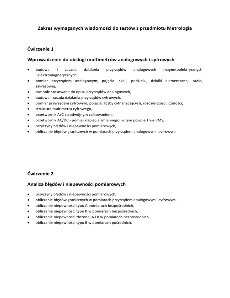 Zakres wymaganych wiadomości do testów z przedmiotu Metrologia Ćwiczenie 1 Wprowadzenie do obsługi multimetrów analogowych i cyfrowych • budowa i zasada działania przyrządów analogowych magnetoelektrycznych i elektromagnetycznych, pomiar przyrządem analogowym; pojęcia: skali, podziałki, działki elementarnej, stałej zakresowej, symbole stosowane do opisu przyrządów analogowych, budowa i zasada działania przyrządów cyfrowych, pomiar przyrządem cyfrowym; pojęcia: liczby cyfr znaczących, rozdzielczości, czułości, struktura multimetru cyfrowego, przetwornik A/C z podwójnym całkowaniem, przetwornik AC/DC ‐ pomiar napięcia zmiennego, w tym pojecie True RMS, przyczyny błędów i niepewności pomiarowych, obliczanie błędów granicznych w pomiarach przyrządem analogowym i cyfrowym • • • • • • • • • Ćwiczenie 2 Analiza błędów i niepewności pomiarowych • • • • • • przyczyny błędów i niepewności pomiarowych, obliczanie błędów granicznych w pomiarach przyrządem analogowym i cyfrowym, obliczanie niepewności typu A pomiarach bezpośrednich, obliczanie niepewności typu B w pomiarach bezpośrednich, obliczanie niepewności złożonej A i B w pomiarach bezpośrednich obliczanie niepewności typu B w pomiarach pośrednich. Ćwiczenie 3 Wprowadzenie do obsługi oscyloskopu 1. Budowa i zasada działania oscyloskopu cyfrowego, a w szczególności: A) Schemat blokowy oscyloskopu, B) Wzmacniacz wejściowy, przetwornik analogowo‐cyfrowy, blok akwizycji danych, układ wyzwalania 2. Zasady obsługi oscyloskopu cyfrowego: A) Układ odchylania pionowego ‐ sprzężenie kanałów wejściowych: AC, DC, GND, ‐ pojęcie czułości kanału (inaczej nazywane wzmocnieniem lub stałą napięciową kanału) ‐ współczynnik tłumienia sondy pomiarowej. B) Układ odchylania poziomego ‐ pojęcie współczynnika (stałej) podstawy czasu, ‐ tryby pracy podstawy czasu i ich zastosowanie (Y‐T, X‐Y, Roll) C) Układ wyzwalania ‐ pojęcie poziomu wyzwalania, ‐ tryby wyzwalania (edge, pulse, alternative), ‐ rodzaje wyzwalania (auto, normal, single), D) Układ próbkowania: ‐ Tryb akwizycji (normal, average, peak detect), ‐ Tryb próbkowania (w czasie rzeczywistym lub ekwiwalentnym), 3. Pomiary oscyloskopowe: A) Łączenie oscyloskopu ze źródłem sygnału (w tym budowa i kompensacja sondy oscyloskopowej), B) Pomiary podstawowych parametrów sygnałów w dziedzinie amplitudy metodami bezpośrednimi (amplituda, wartość międzyszczytowa, wartość maksymalna i minimalna, wartość średnia i skuteczna, itp) C) Pomiary podstawowych parametrów sygnałów w dziedzinie czasu metodami bezpośrednimi (pomiar czasu, okresu i częstotliwości, przesunięcia fazowego, współczynnika wypełnienia sygnału, itp) Ćwiczenie 4 Pomiary rezystancji metodami technicznymi • techniczna metoda pomiaru rezystancji (układy pomiarowe z poprawnie mierzonym prądem lub napięciem, kryterium wyboru układu pomiarowego, itp) wpływ rezystancji wewnętrznej przyrządów pomiarowych na dokładność pomiaru (błędy metody), techniczna metoda pomiaru rezystancji wewnętrznej akumulatora, pomiary rezystancji metodą porównawczą: ‐ porównanie napięć, ‐ porównanie prądów. • • • Ćwiczenie 5 Pomiary parametrów sygnałów napięciowych • definicje parametrów sygnałów okresowych (wartość średnia, średnia wyprostowana, skuteczna, maksymalna, współczynniki: kształtu, szczytu, wypełnienia, zawartości harmonicznych). budowa i zasada działania przyrządów analogowych magnetoelektrycznych i elektromagnetycznych, pomiar przyrządem analogowym; pojęcia: skali, podziałki, działki elementarnej, stałej zakresowej, symbole stosowane do opisu przyrządów analogowych, budowa i zasada działania przyrządów cyfrowych, struktura multimetru cyfrowego, przetwornik A/C z podwójnym całkowaniem, przetwornik AC/DC ‐ pomiar napięcia zmiennego, w tym pojecie True RMS, układy realizujące przetwarzanie sygnałów: prostownik liniowy, prostownik szczytowy. • • • • • • • • Ćwiczenie 6 Pomiary prądów i napięć stałych oraz zmiennych odkształconych • Zasada budowy i podstawowe właściwości (klasa oraz błąd podstawowy i ich związek z niepewnością pomiaru, zakres, rezystancja wewnętrzna) amperomierzy i woltomierzy magnetoelektrycznych, elektromagnetycznych oraz multimetrów cyfrowych, • Definicje wartości średniej, skutecznej, maksymalnej i międzyszczytowej oraz współczynnika szczytu sygnałów okresowych, • Zasady rozszerzania zakresów amperomierzy i woltomierzy (boczniki, posobniki, przekładniki), • Zasada działania przetwornika LEM z kompensacją strumienia, typu C/L (z zamkniętą pętlą sprzężenia zwrotnego – ang. Closed Loop), (por. Dodatek), • Układy regulacji prądu i napięcia w obwodach zasilanych prądem stałym i zmiennym, • Obserwacja oraz pomiar wartości maksymalnej napięcia i prądu za pomocą oscyloskopu Ćwiczenie 7 Pomiary mocy i energii dla jednofazowego prądu przemiennego • definicje mocy chwilowej, czynnej, biernej i pozornej dla obwodów prądu sinusoidalnego, • definicje wartości skutecznej, współczynnika mocy, jednostki energii i sposób ich przeliczania, • budowa i zasada działania analogowych watomierzy ferrodynamicznych, • struktura watomierza cyfrowego i sposób wyznaczania wyniku pomiaru, • techniczne metody pomiaru mocy czynnej z dokładnym pomiarem prądu lub napięcia, • źródła błędów i niepewności pomiarowych w cyfrowych i analogowych pomiarach mocy czynnej, • sposób obliczania błędów granicznych i niepewności w pomiarach mocy czynnej. Ćwiczenie 8 Pomiary z wykorzystaniem oscyloskopu • Budowa i zasada działania oscyloskopu cyfrowego (jak w ćwiczeniu nr 3) • Zasady obsługi oscyloskopu cyfrowego (jak w ćwiczeniu nr 3) oraz zastosowania oscyloskopu do pomiaru częstotliwości, czasu i fazy różnymi metodami (np. metoda