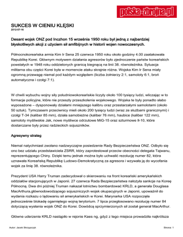 SUKCES W CIENIU KLĘSKI 2012-07-16 Desant wojsk ONZ pod Inczhon 15 września 1950 roku był jedną z najbardziej błyskotliwych akcji z użyciem sił amfibijnych w historii wojen nowoczesnych. Północnokoreańska armia Kim Ir Sena 25 czerwca 1950 roku około godziny 4.00 zaatakowała Republikę Korei. Głównym motywem działania agresorów było zjednoczenie państw koreańskich powstałych w 1948 roku oddzielonych granicą biegnącą na linii 38. równoleżnika. Sytuacja militarna obu części Korei była w momencie ataku skrajnie różna. Wojska Kim Ir Sena miały ogromną przewagę niemal pod każdym względem (liczba żołnierzy 2:1, samoloty 6:1, broń automatyczna i czołgi 7:1). W chwili wybuchu wojny siły południowokoreańskie liczyły około 100 tysięcy ludzi, wliczając w to formacje policyjne, które nie przeszły przeszkolenia wojskowego. Wojska te były ponadto słabo wyposażone – dysponowały działami mniejszego kalibru oraz przestarzałymi samolotami (około 50 sztuk). Tymczasem przeciwnicy mieli około 200 tysięcy ludzi (wraz ze służbami granicznymi) i czołgi T-34 (kaliber 85 mm), działa samobieżne (kaliber 76 mm), haubice (kaliber 122 mm), samoloty myśliwskie Jak, nowe myśliwce odrzutowe MiG-15 oraz szturmowe Ił-10, które dostarczane były przez radzieckich sojuszników. Agresywny strateg Niemal natychmiast zwołano nadzwyczajne posiedzenie Rady Bezpieczeństwa ONZ. Odbyło się ono bez udziału przedstawiciela ZSRR, który zaprotestował przeciw obecności delegata Tajwanu, reprezentującego Chiny. Dzięki temu jednak można było uchwalić rezolucję numer 82, która uznawała Koreańską Republikę Ludowo-Demokratyczną za agresora i wzywała ją do wycofania wojsk za linię 38. równoleżnika. Prezydent USA Harry Truman zadecydował o skierowaniu na front koreański amerykańskich oddziałów stacjonujących w Japonii. 27 czerwca Rada Bezpieczeństwa nałożyła sankcje na Koreę Północną. Dwa dni później Truman nakazał lotnictwu bombardować KRLD, a generała Douglasa MacArthura,głównodowodzącego sojuszniczych wojsk okupacyjnych w Japonii, upoważnił do wydania rozkazu o lądowaniu sił amerykańskich w Korei. Marynarka USA rozpoczęła jednocześnie blokadę ogarniętego wojną terytorium. 7 lipca przegłosowano rezolucję numer 84 dotyczącą wysłania wojsk ONZ do Korei. Dowódcą sprzymierzonych sił został generał MacArthur. Główne uderzenie KRLD nastąpiło w rejonie Kaes ng, gdyż z tego miejsca prowadziła najkrótsza Autor: Jacek Skrzypczyk Strona: 1 droga do Seulu, stolicy Republiki Korei. Miasto to zostało zajęte przez armię Kim Ir Sena 28 czerwca. Dzień później MacArthur wylądował zaledwie 30 kilometrów od linii frontu i dokonał inspekcji wojsk (w obecności zaproszonych korespondentów wojennych). Gdy wrócił do swojego sztabu w Tokio, nie miał już najmniejszych wątpliwości, że Republika Korei bez pomocy amerykańskich sił skazana jest na klęskę. W krótkim czasie ze 100 tysięcy żołnierzy około 35 tysięcy zginęło, zaginęło lub dostało się do niewoli. Ofensywa wojsk KRLD trwała przez cały lipiec. Sprzymierzone siły ONZ zostały zepchnięte na dalekie południe, gdzie z początkiem sierpnia, okopując się za rzeką Naktong, wyznaczyły dwustukilometrową linię obrony nazwaną perymetrem Pusan (od największego miasta portowego Korei Południowej). Administracja amerykańska miała twardy orzech do zgryzienia. Podstawowe pytanie brzmiało: jak uchronić wojska ONZ przed całkowitą zagładą? Kontrowersyjny plan Ciągłe nacieranie północnokoreańskiej armii na tak zwany worek pusański wiązało około 80 Autor: Jacek Skrzypczyk Strona: 2 procent sił Kim Ir Sena i znacznie osłabiało obronę już zdobytych terenów. W tym momencie MacArthur przedstawił plan, który doskonale obrazuje, jak wielkie znaczenie na polu walki ma niekonwencjonalne działanie. Wymyślona przez głównodowodzącego sił ONZ operacja „Chromite” miała rozpocząć się od desantu morskiego na port Inczhon, znajdujący się w odległości około 300 kilometrów na północny zachód od Pusan. Atak w tym miejscu pozwoliłby odciąć armie północnokoreańskie od linii zaopatrzenia oraz zaatakować je od północy. W tym czasie wojska zgromadzone w Pusan mogłyby przejść do kontrnatarcia i uderzyć od południa. Choć z założenia koncepcja odwrócenia losów wojny wydawała się doskonała, to samo miejsce desantu budziło skrajne emocje. Inczhon było obszarem wyjątkowo niewygodnym doprzeprowadzenia jakiejkolwiek akcji. Brak plaż, wysokie pływy morskie, sięgające nawet 10 metrów, nabrzeże pełne raf i skał. W takich warunkach jednostki nawodne szturmujące brzeg miały niewielkie szanse na wykonanie zadania, tym bardziej że desant trzeba było przeprowadzić w czasie przypływu, w nie więcej niż 2,5 godziny. Plan operacji był dokładnie omawiany zarówno w sztabie MacArthura w Tokio, jak i w Waszyngtonie. Generał, broniąc swojego pomysłu, powoływał się na fakty historyczne. W 1894 i 1904 roku Japończycy wysadzili desant w tym rejonie i odnieśli spektakularne zwycięstwa. To jednak nie przekonywało przeciwników operacji, wśród których był przewodniczący Połączonego Kolegium Szefów Sztabów generał Omar Bradley. Do kwatery MacArthura wysłano dwóch przedstawicieli Pentagonu generała Josepha L. Collinsa i admirała Forresta P. Shermana, którzy mieli za zadanie ocenić szanse powodzenia operacji. Podczas narady, która miała miejsce 23 sierpnia, głównodowodzący wojsk ONZ w Korei krzyczał: „Prawie słyszę tykanie przeznaczenia! Musimy działać teraz albo zginiemy! Inczhon zakończy się sukcesem. Uratujemy sto tysięcy istnień!”. Na ostateczną decyzję trzeba było jednak poczekać. Kilka dni później, po przeanalizowaniu wszystkich argumentów oraz opinii wysłanników, prezydent Harry Truman wydał zgodę na „wykonanie manewru sił amfibijnych” w Inczhon. 