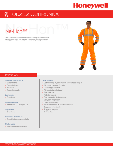 ODZIEŻ OCHRONNA Ne-Hon™ Ne-Hon™ Jednorazowa odzież odblaskowa chroniąca pracowników stykających się z poważnymi i śmiertelnymi zagrożeniami PRZEGLĄD Zalecane zastosowanie »» Budownictwo »» Sektor Naftowy »» Transport »» Sektor komunalny Zagrożenie »» Chemiczne Rozporządzenia »» 89/686/EEC - Dyrektywa UE Zagrożenie »» Chemiczne Informacje dodatkowe »» Odzież jednorazowego użytku Opakowania »» 20 kombinezonów / karton www.honeywellsafety.com Główne cechy »» Certyfikowany Wysoki Poziom Widoczności klasy 3 »» Wodoodporne wykończenie »» Oddychający materiał »» Wzmocnienia na kolanach »» Pętle na kciuki »» Podwójny suwak »» Pętla na zamku błyskawicznym »» Elastyczny na plecach »» Raglanowe rękawy »» Wstawka krokowa w kształcie diamentu »» Ściągacze w kostkach »» Ściągacze na pasie »» Brak lateksu ODZIEŻ OCHRONNA SPECYFIKACJA TECHNICZNA Kolor »» Pomarańczowy HV / EN20471 Luminacja »» <0,40 / EN20471 Test kabinowy Typu 6 »» Zaliczony / EN13034 Klasa 3 / EN20471 Literatura i dokumentacja Ne-Hon6_UserGuide http://www.honeywellsafety.com/Supplementary/Documents_and_Downloads/4294993091/1033.aspx W celu uzyskania dodatkowych informacji, prosimy o kontakt z HONEYWELL PROTECTIVE CLOTHING ZA de Berret – 30 200 Bagnols sur Ceze – Francja – (+33 (0)4.66.89.18.36) EN -INSTRUKCJE UŻYTKOWANIA. Użytkownicy muszą zapoznać się z następującymi instrukcjami przed użyciem www.honeywellsafety.com