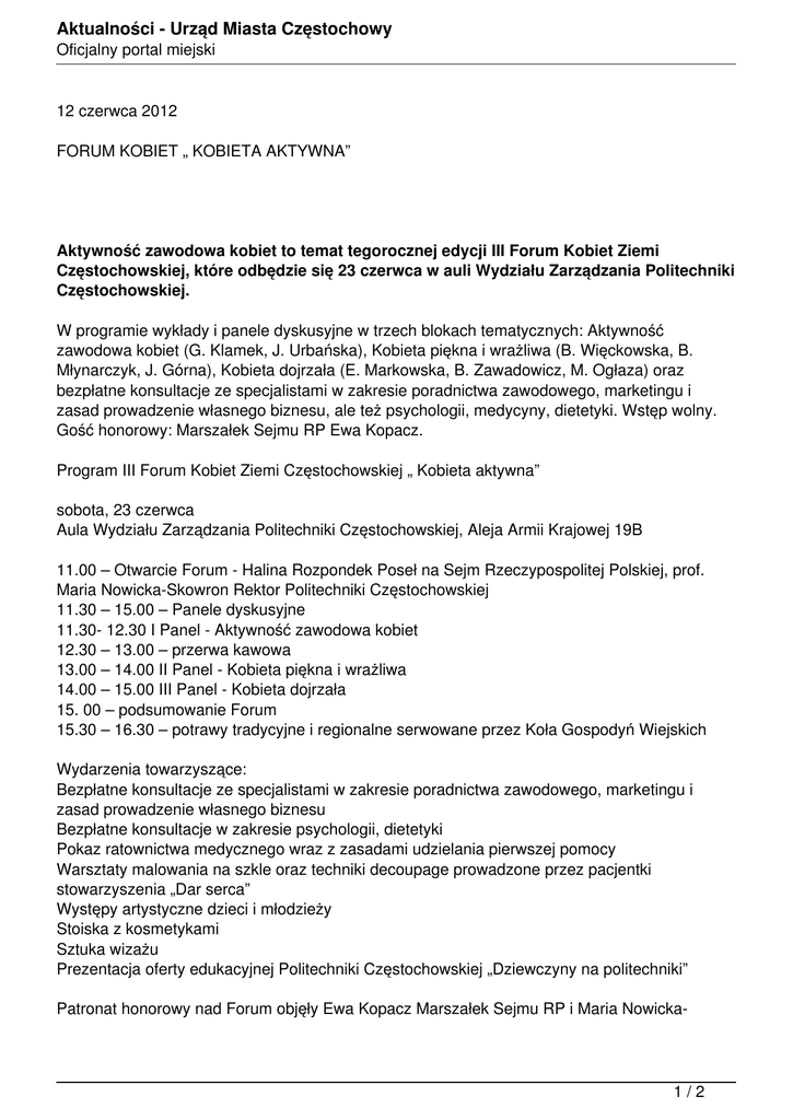 Aktualności - Urząd Miasta Częstochowy Oficjalny portal miejski 12 czerwca 2012 FORUM KOBIET „ KOBIETA AKTYWNA” Aktywność zawodowa kobiet to temat tegorocznej edycji III Forum Kobiet Ziemi Częstochowskiej, które odbędzie się 23 czerwca w auli Wydziału Zarządzania Politechniki Częstochowskiej. W programie wykłady i panele dyskusyjne w trzech blokach tematycznych: Aktywność zawodowa kobiet (G. Klamek, J. Urbańska), Kobieta piękna i wrażliwa (B. Więckowska, B. Młynarczyk, J. Górna), Kobieta dojrzała (E. Markowska, B. Zawadowicz, M. Ogłaza) oraz bezpłatne konsultacje ze specjalistami w zakresie poradnictwa zawodowego, marketingu i zasad prowadzenie własnego biznesu, ale też psychologii, medycyny, dietetyki. Wstęp wolny. Gość honorowy: Marszałek Sejmu RP Ewa Kopacz. Program III Forum Kobiet Ziemi Częstochowskiej „ Kobieta aktywna” sobota, 23 czerwca Aula Wydziału Zarządzania Politechniki Częstochowskiej, Aleja Armii Krajowej 19B 11.00 – Otwarcie Forum - Halina Rozpondek Poseł na Sejm Rzeczypospolitej Polskiej, prof. Maria Nowicka-Skowron Rektor Politechniki Częstochowskiej 11.30 – 15.00 – Panele dyskusyjne 11.30- 12.30 I Panel - Aktywność zawodowa kobiet 12.30 – 13.00 – przerwa kawowa 13.00 – 14.00 II Panel - Kobieta piękna i wrażliwa 14.00 – 15.00 III Panel - Kobieta dojrzała 15. 00 – podsumowanie Forum 15.30 – 16.30 – potrawy tradycyjne i regionalne serwowane przez Koła Gospodyń Wiejskich Wydarzenia towarzyszące: Bezpłatne konsultacje ze specjalistami w zakresie poradnictwa zawodowego, marketingu i zasad prowadzenie własnego biznesu Bezpłatne konsultacje w zakresie psychologii, dietetyki Pokaz ratownictwa medycznego wraz z zasadami udzielania pierwszej pomocy Warsztaty malowania na szkle oraz techniki decoupage prowadzone przez pacjentki stowarzyszenia „Dar serca” Występy artystyczne dzieci i młodzieży Stoiska z kosmetykami Sztuka wizażu Prezentacja oferty edukacyjnej Politechniki Częstochowskiej „Dziewczyny na politechniki” Patronat honorowy nad Forum objęły Ewa Kopacz Marszałek Sejmu RP i Maria Nowicka- 1/2 Aktualności - Urząd Miasta Częstochowy Oficjalny portal miejski Skowron Rektor Politechniki Częstochowskiej Więcej: http://www.kobiety.czest.pl Pozostałe aktualności 2/2 Powered by TCPDF (www.tcpdf.org)