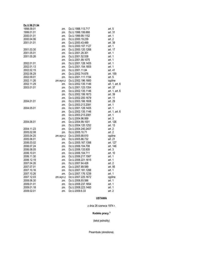 Dz.U.98.21.94 1998.09.01 1999.01.01 2000.01.01 2000.04.06 2001.01.01 2001.03.30 2001.05.01 2001.05.26 2002.01.01 2002.01.13 2002.02.15 2002.06.29 2002.09.01 2002.11.26 2002.11.29 2003.01.01 2004.01.01 2004.05.01 2004.06.01 2004.11.23 2005.02.08 2005.04.25 2005.06.01 2006.03.02 2006.07.24 2006.08.05 2006.10.01 2006.11.30 2006.12.19 2007.04.26 2007.07.01 2007.10.16 2007.10.26 2007.12.03 2008.06.30 2009.01.01 2009.01.18 2009.02.01 zm. zm. zm. zm. zm. zm. zm. zm. zm. zm. zm. zm. zm. zm. zm. zm.wyn.z zm. zm. zm. zm. zm. zm. zm. zm. zm. zm. zm. zm. zm. zm. zm. zm.wyn.z zm. zm. zm. zm. zm. zm. zm. zm. zm. zm. zm. zm.wyn.z zm. zm. zm. zm. Dz.U.1998.113.717 Dz.U.1998.106.668 Dz.U.1999.99.1152 Dz.U.2000.19.239 Dz.U.2000.43.489 Dz.U.2000.107.1127 Dz.U.2000.120.1268 Dz.U.2001.28.301 Dz.U.2001.52.538 Dz.U.2001.99.1075 Dz.U.2001.128.1405 Dz.U.2001.154.1805 Dz.U.2001.11.84 Dz.U.2002.74.676 Dz.U.2001.111.1194 Dz.U.2002.196.1660 Dz.U.2002.135.1146 Dz.U.2001.123.1354 Dz.U.2002.135.1146 Dz.U.2002.199.1673 Dz.U.2002.200.1679 Dz.U.2003.166.1608 Dz.U.2003.213.2081 Dz.U.2001.128.1405 Dz.U.2002.135.1146 Dz.U.2003.213.2081 Dz.U.2004.96.959 Dz.U.2004.99.1001 Dz.U.2004.120.1252 Dz.U.2004.240.2407 Dz.U.2005.10.71 Dz.U.2005.68.610 Dz.U.2005.86.732 Dz.U.2005.167.1398 Dz.U.2006.104.708 Dz.U.2006.133.935 Dz.U.2006.104.711 Dz.U.2006.217.1587 Dz.U.2006.221.1615 Dz.U.2007.64.426 Dz.U.2007.89.589 Dz.U.2007.181.1288 Dz.U.2007.176.1239 Dz.U.2007.225.1672 Dz.U.2008.93.586 Dz.U.2008.237.1654 Dz.U.2008.223.1460 Dz.U.2009.6.33 art. 5 art. 31 art. 1 art. 2 art. 39 art. 1 art. 17 art. 1 art. 1 art. 1 art. 1 art. 1 art. 41 art. 159 art. 5 ogólne art. 1, art. 6 art. 37 art. 1, art. 6 art. 39 art. 11 art. 29 art. 1 art. 1 art. 1, art. 6 art. 1 art. 3 art. 126 art. 13 art. 2 art. 2 ogólne art. 21 art. 127 art. 146 art. 3 art. 10 art. 1 art. 1 art. 2 art. 95 art. 1 art. 1 ogólne art. 1 art. 1 art. 1 art. 2 USTAWA z dnia 26 czerwca 1974 r. Kodeks pracy.1) (tekst jednolity) Preambuła (skreślona). DZIAŁ PIERWSZY PRZEPISY OGÓLNE Rozdział I Przepisy wstępne Art. 1. Kodeks pracy określa prawa i obowiązki pracowników i pracodawców. Art. 2. Pracownikiem jest osoba zatrudniona na podstawie umowy o pracę, powołania, wyboru, mianowania lub spółdzielczej umowy o pracę. Art. 3. Pracodawcą jest jednostka organizacyjna, choćby nie posiadała osobowości prawnej, a także osoba fizyczna, jeżeli zatrudniają one pracowników. Art. 31. § 1. Za pracodawcę będącego jednostką organizacyjną czynności w sprawach z zakresu prawa pracy dokonuje osoba lub organ zarządzający tą jednostką albo inna wyznaczona do tego osoba. § 2. Przepis § 1 stosuje się odpowiednio do pracodawcy będącego osobą fizyczną, jeżeli nie dokonuje on osobiście czynności, o których mowa w tym przepisie. Art. 4. (skreślony). Art. 5. Jeżeli stosunek pracy określonej kategorii pracowników regulują przepisy szczególne, przepisy kodeksu stosuje się w zakresie nie uregulowanym tymi przepisami. Art. 6. § 1. Stosunek pracy między obywatelem polskim a polskim przedstawicielstwem, misją lub inną placówką za granicą podlega przepisom kodeksu. § 2. Stosunek pracy między obywatelem polskim a przedstawicielstwem, misją albo inną placówką państwa obcego lub instytucji międzynarodowej, działającymi na obszarze Rzeczypospolitej Polskiej, podlega przepisom kodeksu, jeżeli umowy, układy lub porozumienia międzynarodowe nie stanowią inaczej. Art. 7. (skreślony). Art. 8. Nie można czynić ze swego prawa użytku, który byłby sprzeczny ze społeczno-gospodarczym przeznaczeniem tego prawa lub zasadami współżycia społecznego. Takie działanie lub zaniechanie uprawnionego nie jest uważane za wykonywanie prawa i nie korzysta z ochrony. Art. 9. § 1. Ilekroć w Kodeksie pracy jest mowa o prawie pracy, rozumie się przez to przepisy Kodeksu pracy oraz przepisy innych ustaw i aktów wykonawczych, określające prawa i obowiązki pracowników i pracodawców, a także postanowienia układów zbiorowych pracy i innych opartych na ustawie porozumień zbiorowych, regulaminów i statutów określających prawa i obowiązki stron stosunku pracy. § 2. Postanowienia układów zbiorowych pracy i porozumień zbiorowych oraz regulaminów i statutów nie mogą być mniej korzystne dla pracowników niż przepisy Kodeksu pracy oraz innych ustaw i aktów wykonawczych. § 3. Postanowienia regulaminów i statutów nie mogą być mniej korzystne dla pracowników niż postanowienia układów zbiorowych pracy i porozumień zbiorowych. § 4. Postanowienia układów zbiorowych pracy i innych opartych na ustawie porozumień zbiorowych, regulaminów oraz statutów określających prawa i obowiązki stron stosunku pracy, naruszające zasadę równego traktowania w zatrudnieniu, nie obowiązują. Art. 91. § 1. Jeżeli jest to uzasadnione sytuacją finansową pracodawcy, może być zawarte porozumienie o zawieszeniu stosowania w całości lub w części przepisów prawa pracy, określających prawa i obowiązki stron stosunku pracy; nie dotyczy to przepisów Kodeksu pracy oraz przepisów innych ustaw i aktów wykonawczych. § 2. Porozumienie, o którym mowa w § 1, zawiera pracodawca i reprezentująca pracowników organizacja związkowa, a jeżeli pracodawca nie jest objęty działaniem takiej organizacji, porozumienie zawiera pracodawca i przedstawicielstwo pracowników wyłonione w trybie przyjętym u tego pracodawcy. § 3. Zawieszenie stosowania przepisów prawa pracy nie może trwać dłużej niż przez okres 3 lat. Przepis art. 24127 § 3 stosuje się odpowiednio. § 4. Pracodawca przekazuje porozumienie właściwemu okręgowemu inspektorowi pracy. § 5. Przepisy § 1-4 nie naruszają przepisów art. 24127. Rozdział II Podstawowe zasady prawa pracy Art. 10. § 1. Każdy ma prawo do swobodnie wybranej pracy. Nikomu, z wyjątkiem przypadków określonych w ustawie, nie można zabronić wykonywania zawodu. § 2. Państwo określa minimalną wysokość wynagrodzeni