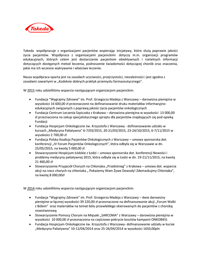 Takeda współpracuje z organizacjami pacjentów wspierając inicjatywy, które służą poprawie jakości życia pacjentów. Współpraca z organizacjami pacjenckimi dotyczy m.in. organizacji programów edukacyjnych, których celem jest dostarczenie pacjentom obiektywnych i rzetelnych informacji dotyczących dostępnych metod leczenia, podnoszenie świadomości dotyczącej chorób oraz znaczenia, jakie ma ich wczesne wykrywanie i właściwe leczenie. Nasza współpraca oparta jest na zasadach uczciwości, przejrzystości, niezależności i jest zgodna z zasadami zawartymi w „Kodeksie dobrych praktyk przemysłu farmaceutycznego”. W 2015 roku udzieliliśmy wsparcia następującym organizacjom pacjenckim: • • • • • • Fundacja “Wygrajmy Zdrowie” im. Prof. Grzegorza Madeja z Warszawy – darowizna pieniężna w wysokości 16 600,00 zł przeznaczone na dofinansowanie druku materiałów informacyjnoedukacyjnych związanych z poprawą jakości życia pacjentów onkologicznych Fundacja Centrum Leczenia Szpiczaka z Krakowa – darowizna pieniężna w wysokości 13 000,00 zł przeznaczona na zakup specjalistycznego sprzętu dla pacjentów znajdujących się pod opieką Fundacji Fundacja Hospicjum Onkologiczne św. Krzysztofa z Warszawy - dofinansowanie udziału w kursach „Medycyna Paliatywna” 6-7/03/2015, 20-21/03/2015, 23-24/10/2015, 6-7/11/2015 w wysokości 2 700,00 zł Fundacja Polska Koalicja Pacjentów Onkologicznych z Warszawy – umowa sponsorska dot. konferencji „IV Forum Pacjentów Onkologicznych”, która odbyła się w Warszawie w dn. 25/05/2015, na kwotę 5 000,00 zł Stowarzyszenie Hospicjum Łódzkie z Łodzi – umowa sponsorska dot. konferencji Nowości i problemy medycyny paliatywnej 2015, która odbyła się w Łodzi w dn. 19-21/11/2015, na kwotę 21 460,00 zł Stowarzyszenie Przyjaciół Chorych na Chłoniaka „Przebiśnieg” z Krakowa – umowa dot. wsparcia akcji na rzecz chorych na chłoniaka „ Pokażemy Wam Żywe Dowody! Zdemaskujmy Chłoniaka”, na kwotę 8 000,00zł W 2014 roku udzieliliśmy wsparcia następującym organizacjom pacjenckim: • • • Fundacja “Wygrajmy Zdrowie” im. Prof. Grzegorza Madeja z Warszawy – dwie darowizny pieniężne w łącznej wysokości 39 220,00 zł przeznaczone na dofinansowanie akcji „Forum Walki z Bólem” oraz materiałów na temat bólu przewlekłego skierowanych do pacjentów z chorobą nowotworową Stowarzyszenie Pomocy Chorym na Mięsaki „SARCOMA” z Warszawy – darowizna pieniężna w wysokości 10 000,00 zł przeznaczona na częściowe pokrycie kosztów kampanii ONKOBIEG Fundacja Hospicjum Onkologiczne św. Krzysztofa z Warszawy- dofinansowanie udziału w kursie „Medycyna Paliatywna” 10-12/04/2014 oraz 25-26/04/2014 w wysokości 1650,00pln • • Polskie Towarzystwo Zwalczania Chorób Alergicznych - Oddział Kraków – umowa sponsoringu konferencji naukowej „XXIII Dzień Alergii poświęconej astmie i chorobom alergicznym” na kwotę 3000,00 zł Federacja Stowarzyszeń Amazonki z Poznania – darowizna pieniężna w wysokości 2500,00 zł przeznaczona na dofinasowanie spotkania edukacyjnego dla pacjentek W 2013 roku udzieliliśmy wsparcia następującym organizacjom pacjenckim: • • • • • • • Fundacja “Wygrajmy Zdrowie” im. Prof. Grzegorza Madeja z Warszawy otrzymała darowiznę pieniężną w wysokości 18 450 zł z przeznaczeniem na przygotowanie i zamieszczenie w magazynie ogólnopolskim artykułu i wywiadu edukacyjnego na temat bólu przewlekłego Stowarzyszenie Pomocy Dzieciom z Chorobami Alergicznymi i Zaburzeniami Odporności „Zielony Balonik” z Łodzi otrzymało darowiznę pieniężną w wysokości 30 000 zł na sfinansowanie kosztów zakupu odczynników do badań immunologicznych dla pacjentów Stowarzyszenie Pomocy Chorym na Mięsaki „SARCOMA” z Warszawy otrzymało darowiznę pieniężną w wysokości 10 000 zł na sfinansowanie kosztów szkolenia dla pracowników ochrony zdrowia Stowarzyszenie Opieki Hospicyjnej Ziemi Częstochowskiej - w roku 2013 przekazaliśmy kwotę 4520 zł na organizację konferencji „Wyleczyć czasami, ulżyć często, pocieszyć zawsze” w zamian za możliwość organizacji stoiska wystawienniczego oraz udział zaproszonych lekarzy Stowarzyszenie Hospicjum Łódzkie – w roku 2013 przekazaliśmy kwotę 31 600 zł na organizację konferencji poświęconej tematyce dot. opieki paliatywnej w zamian za możliwość organizacji stoiska wystawienniczego oraz udział zaproszonych lekarzy. Fundacja Hospicjum Onkologiczne św. Krzysztofa z Warszawy - w roku 2013 zapłaciliśmy kwotę 2000 zł za możliwość organizacji stoiska wystawienniczego podczas trwania kursu „Medycyna Paliatywna”. Polskie Towarzystwo Zwalczania Chorób Alergicznych Oddział Kraków – w roku 2013 zapłaciliśmy kwotę 3000 zł w zamian za możliwość przeprowadzenia wykładu oraz organizacji stoiska podczas trwania konferencji naukowej XXII Dzień Alergii poświęconej astmie i chorobom alergicznym. W 2012 roku wsparcie od naszej firmy uzyskały następujące organizacje pacjenckie: • • • • Towarzystwo Przyjaciół Chorych na Astmę otrzymało darowiznę pieniężną w wysokości 5000 zł z przeznaczeniem na organizację programu edukacyjnego dla pacjentów chorych na astmę. Polskie Towarzystwo Zwalczania Chorób Alergicznych - Oddział Kraków – przekazaliśmy kwotę 3000 zł w na organizację konferencji naukowej XXI Dzień Alergii poświęconej astmie i chorobom alergicznym w zamian za możliwość przeprowadzenia wykładu oraz stoiska podczas trwania konferencji dla lekarzy. Stowarzyszenie Hospicjum Łódzkie – wpłaciliśmy kwotę 400 zł na rzecz Stowarzyszenia w zamian za udział lekarza w kursie „Ból i objawy somatyczne” organizowanym przez Stowarzyszenie. Stowarzyszenie Opieki Hospicyjnej Ziemi Częstochowskie j- przekazaliśmy kwotę 7450 zł na rzecz Stowarzyszenia w zamian za udział lekarzy w szkoleniu organizowa