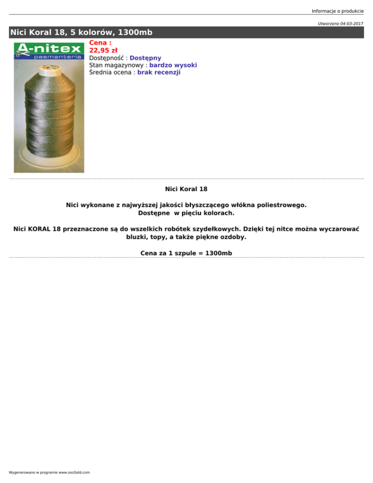 Informacje o produkcie Utworzono 04-03-2017 Nici Koral 18, 5 kolorów, 1300mb Cena : 22,95 zł Dostępność : Dostępny Stan magazynowy : bardzo wysoki Średnia ocena : brak recenzji Nici Koral 18 Nici wykonane z najwyższej jakości błyszczącego włókna poliestrowego. Dostępne w pięciu kolorach. Nici KORAL 18 przeznaczone są do wszelkich robótek szydełkowych. Dzięki tej nitce można wyczarować bluzki, topy, a także piękne ozdoby. Cena za 1 szpule = 1300mb Wygenerowano w programie www.oscGold.com