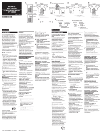 A 1 B C Wzmacniacz Уcилитeль (Tylko SA-W2500) (Только SA-W2500) D Ten subwoofer Єтoт низкoчacтoтный гpoмкoгoвopитeль SPEAKER SPEAKER OUT LINE LINE IN OUT Active Subwoofer Głośnik przedni (P) Пepeдний гpoмкoгoвopитeль (П) IN SPEAKER SA-W3800/SA-W3000/ SA-W2500 L L R R OUT SPEAKER IN 2 2-899-141-83(1) (Tylko SA-W3800/SA-W3000) (Только SA-W3800/SA-W3000) OUT IN LINE IN LINE (1) IN L L L R R Głośnik przedni (L) Пepeдний гpoмкoгoвopитeль (Л) Głośnik przedni (P) Пepeдний гpoмкoгoвopитeль (П) Głośnik przedni (L) Пepeдний гpoмкoгoвopитeль (Л) L SPEAKER OUT IN L L L L R R R R Ten subwoofer Єтoт низкoчacтoтный гpoмкoгoвopитeль Ten subwoofer Єтoт низкoчacтoтный гpoмкoгoвopитeль l: Przepływ sygnału Пpoxoждeниe cигнaлa l: Przepływ sygnału Пpoxoждeниe cигнaлa F l: Przepływ sygnału Пpoxoждeниe cигнaлa G SPEAKER IN R SPEAKER B l: Przepływ sygnału Пpoxoждeниe cигнaлa SPEAKER OUT IN Wzmacniacz Уcилитeль SPEAKER A IN IN SPEAKER E Wzmacniacz Уcилитeль 1 R (Tylko SA-W2500) (Только SA-W2500) Wzmacniacz Уcилитeль MONO OUT 2 (Tylko SA-W3800/SA-W3000) (Только SA-W3800/SA-W3000) Ten subwoofer Єтoт низкoчacтoтный гpoмкoгoвopитeль Wzmacniacz Уcилитeль IN Ten subwoofer Єтoт низкoчacтoтный гpoмкoгoвopитeль MONO OUT OUT LINE IN LINE l: Przepływ sygnału Пpoxoждeниe cигнaлa Русский язык Język polski OSTRZEŻENIE Instalacja Aby zmniejszyć ryzyko pożaru lub porażenia prądem, należy chronić ten aparat przed deszczem i wilgocią. Aby uniknąć pożaru, nie należy zakrywać otworów wentylacyjnych zestawu gazetami, obrusami, zasłonami itd. Nie należy stawiać na urządzeniu płonących świec. Aby uniknąć ryzyka pożaru lub porażenia prądem, nie należy stawiać na urządzeniu przedmiotów wypełnionych cieczami, np. wazonów. Aby uniknąć porażenia prądem elektrycznym, nie należy otwierać obudowy. Naprawy należy zlecać tylko wykwalifikowanemu personelwi. Nie instaluj urządzenia w przestrzeni zamkniętęj, takiej jak półka na książki, czy zabudowana szafka. Umieść ten zestaw tak, aby w razie problemu, możliwe było natychmiastowe wyjęcie wtyczki przewodu zasilającego z gniazdka ściennego. Środki ostrożności Bezpieczeństwo •Przed rozpoczęciem użytkowania subwoofera sprawdź, czy jego napięcie robocze odpowiada napięciu w sieci lokalnej. •Jeśli subwoofer nie będzie używany przez dłuższy czas, należy wyłączyć go z gniazdka ściennego. Aby odłączyć przewód zasilający, pociągnij go, chwytając za wtyczkę. Nigdy nie ciągnij za sam przewód. •Jeśli do subwoofera dostanie się przypadkowo jakiś przedmiot lub ciecz, należy odłączyć przewód zasilający i zlecić sprawdzenie subwoofera wykwalifikowanej osobie. •Przewód zasilający może być wymieniany tylko w autoryzowanym punkcie serwisowym. Przy włączaniu i wyłączaniu wzmacniacza lub innych urządzeń Ponieważ ucho ludzkie nie rozpoznaje kierunku i miejsca emisji dźwięków basowych z subwoofera (dźwięki o częstotliwości poniżej 200 Hz), subwoofer można zainstalować w dowolnym miejscu. Aby odtwarzanie basów było lepsze, zaleca się zainstalowanie subwoofera na solidnym podłożu, które nie jest podatne na występowanie rezonansu. Odtwarzanie niskich basów o odpowiedniej jakości można uzyskać z jednego subwoofera. Dzięki zastosowaniu kilku subwooferów można jednak uzyskać jeszcze lepszy efekt. Uwagi •Subwoofer należy zawsze instalować w pozycji pionowej, kilka centymetrów od ściany. •Na subwooferze nie należy siadać ani umieszczać na nim żadnych przedmiotów. •Jeśli subwoofer został zainstalowany w środkowej części pomieszczenia, basy mogą być bardzo słabo słyszalne. Jest to wynikiem działania fali stojącej pomieszczenia. W takim przypadku należy przesunąć subwoofer ze środka pomieszczenia lub wyeliminować działanie fali stojącej poprzez zawieszenie na ścianie półki na książki. Łączenie poszczególnych elementów systemu Omówienie Do łączenia subwoofera ze wzmacniaczem służą gniazda LINE IN lub SPEAKER IN. (A). • Jeśli wzmacniacz ma jeden z poniższych typów gniazd wyjściowych, gniazdo LINE IN subwoofera należy połączyć z odpowiednim gniazdem wzmacniacza za pomocą dostarczonego przewodu połączeniowego audio. — Gniazdo MONO OUT — Gniazdo MIX OUT — Gniazda wyjściowe SUBWOOFER — Gniazda wyjściowe SUPER WOOFER Aby uniknąć uszkodzenia subwoofera •Głośność wzmacniacza należy ustawiać ostrożnie, tak aby moc wejściowa nie była zbyt duża. •Nie próbuj otwierać obudowy lub demontować głośników i sieci. •Nie przyciskaj celowo lub niecelowo pokrywki od kurzu. W przypadku wystąpienia zmian kolorów na ekranie telewizora Z ekranowanym magnetycznie typem zestawu głośnikowego, subwoofer może być umieszczony w pobliżu telewizora. Zmiany kolorów mogą jednak wystąpić. Zależy to od typu telewizora. Jeśli wystąpią zmiany kolorów... tWyłącz telewizor, a następnie włącz go ponownie po 15 - 30 minutach. Jeśli zmiany kolorów wystąpią ponownie... tUmieść subwoofer dalej od telewizora. Jeśli występuje „wycie” Zmień usytuowanie głośników lub zmniejsz głośność wzmacniacza. Instalacja •Nie należy ustawiać subwoofera w pobliżu źródeł ciepła, takich jak grzejniki lub strumienie powietrza, ani w miejscach narażonych na bezpośrednie działanie promieni słonecznych, nadmiernych ilości kurzu lub wstrząsów mechanicznych. •Aby zapobiec wewnętrznej kumulacji ciepła, należy zapewnić właściwą wentylację subwoofera. Subwoofer należy zainstalować w miejscu, w którym jest właściwa wentylacja. Nie należy ustawiać subwoofera na delikatnych powierzchniach lub zbyt blisko ściany