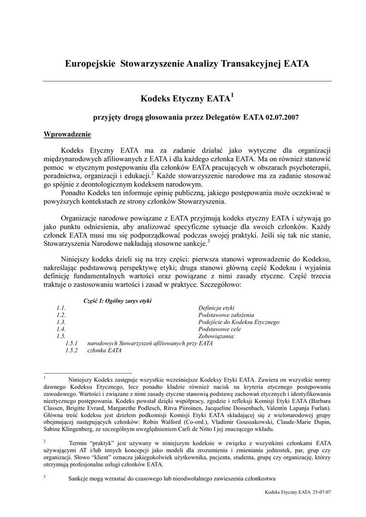 Europejskie Stowarzyszenie Analizy Transakcyjnej EATA Kodeks Etyczny EATA 1 przyjęty drogą głosowania przez Delegatów EATA 02.07.2007 Wprowadzenie Kodeks Etyczny EATA ma za zadanie działać jako wytyczne dla organizacji międzynarodowych afiliowanych z EATA i dla każdego członka EATA. Ma on również stanowić pomoc w etycznym postępowaniu dla członków EATA pracujących w obszarach psychoterapii, poradnictwa, organizacji i edukacji.2 Każde stowarzyszenie narodowe ma za zadanie stosować go spójnie z deontologicznym kodeksem narodowym. Ponadto Kodeks ten informuje opinię publiczną, jakiego postępowania może oczekiwać w powyższych kontekstach ze strony członków Stowarzyszenia. Organizacje narodowe powiązane z EATA przyjmują kodeks etyczny EATA i używają go jako punktu odniesienia, aby analizować specyficzne sytuacje dla swoich członków. Każdy członek EATA musi mu się podporządkować podczas swojej praktyki. Jeśli się tak nie stanie, Stowarzyszenia Narodowe nakładają stosowne sankcje.3 Niniejszy kodeks dzieli się na trzy części: pierwsza stanowi wprowadzenie do Kodeksu, nakreślając podstawową perspektywę etyki; druga stanowi główną część Kodeksu i wyjaśnia definicję fundamentalnych wartości oraz powiązane z nimi zasady etyczne. Część trzecia traktuje o zastosowaniu wartości i zasad w praktyce. Szczegółowo: Część I: Ogólny zarys etyki 1.1. 1.2. 1.3. 1.4. 1.5. 1.5.1 1.5.2 Definicja etyki Podstawowe założenia Podejście do Kodeksu Etycznego Podstawowe cele Zobowiązania: narodowych Stowarzyszeń afiliowanych przy EATA członka EATA 1 Niniejszy Kodeks zastępuje wszystkie wcześniejsze Kodeksy Etyki EATA. Zawiera on wszystkie normy dawnego Kodeksu Etycznego, lecz ponadto kładzie również nacisk na kryteria etycznego postępowania zawodowego. Wartości i związane z nimi zasady etyczne stanowią podstawę zachowań etycznych i identyfikowania nieetycznego postępowania. Kodeks powstał dzięki współpracy, zgodzie i refleksji Komisji Etyki EATA (Barbara Classen, Brigitte Evrard, Margarethe Podlesch, Ritva Piiroinen, Jacqueline Dossenbach, Valentin Lapanja Furlan). Główna treść kodeksu jest dziełem podkomisji Komisji Etyki EATA składającej się z wielonarodowej grupy obejmującej następujących członków: Robin Walford (Co-ord.), Vladimir Goussakowski, Claude-Marie Dupin, Sabine Klingenberg, ze szczególnym uwzględnieniem Carli de Nitto I jej znaczącego wkładu. 2 Termin “praktyk” jest używany w niniejszym kodeksie w związku z wszystkimi członkami EATA używającymi AT i/lub innych koncepcji jako modeli dla zrozumienia i zmieniania jednostek, par, grup czy organizacji. Słowo “klient” oznacza jakiegokolwiek użytkownika, pacjenta, studenta, grupę czy organizację, którzy otrzymują profesjonalne usługi członków EATA. 3 Sankcje mogą wzrastać do czasowego lub nieodwołalnego zawieszenia członkostwa Kodeks Etyczny EATA 25-07-07 Część II: Podstawowy Kodeks Etyczny 2.1. Wartości podstawowe 2.2. Podstawowe zasady etyczne 2.3. Wytyczne dla Kodeksu Etycznego EATA Aneks: Deklaracja Praw Człowieka Aneks 2: Przykłady wartości i zasad etycznych oraz postępowania zgodnego z kluczowymi punktami Kodeksu Etycznego EATA: 3.1. Psychoterapia 3.2. Doradztwo 3.3. Edukacja 3.4. Organizacja 3.5. Szkolenie Część I Ogólny zarys etyki 1.1. Niektóre definicje etyki Etyka4 w swym najszerszym znaczeniu jest dyscypliną filozoficzną, która bada ludzkie działania, co obejmuje zarówno intencje moralne, jak i ludzką wolę. Etyka5 zakłada zdolność do wyboru sposobu działania. Obejmuje ona zdolność do wybierania zgodnie z własnymi parametrami (etyka subiektywna) oraz zdolność do wybierania przy uwzględnieniu perspektywy drugiego człowieka (etyka intersubiektywna). Deontologia (etyka zawodowa) jest nauką o moralnym obowiązku i zobowiązaniu praktyków, aby działać etycznie. 1.2. Podstawowe założenia 4 Istnieje ścisły związek między etyką i praktyką6 - postępowanie może być etyczne lub nie w zależności od tego, czy przyczynia się do dobrostanu naszego i innych czy też nie. Etyka stanowi ogólne ramy, które prowadzą praktyka podczas świadczenia usług i zawsze leży u podstaw praktyki. Nie ogranicza się jedynie do rozwiązywania trudnych i problematycznych sytuacji. Etyka określa wartości które pomagają ludziom realizować swój potencjał jako istot ludzkich; wartości leżą u podstaw zasad etycznych jako wytycznych do realizowania wartości i zasad będących podstawą norm deontologicznych, i są wytycznymi dla praktyki zawodowej. Definicja ta pochodzi z włoskiego słownika Dizionario delle Idee, Sansoni, 1977, str. 392. 5 Dokładne znaczenie etyki przedstawia ją jako synonim moralności(“Ethos” i “Mos” w grece i łacinie oznaczają obyczaje, zwyczaje) i odnoszą się do zdolności autoanalizy w celu odnalezienia spełnienia: tak więc zachowujemy się etycznie kiedy spełniamy swój potencjał i dbamy o spełnienie innych. 6 Praktyka oznacza profesjonalną relację pomocy, która występuje kiedy praktyk i użytkownik zgadzają się na jasny kontrakt. Dotyczy to wszystkich czterech specjalności: psychoterapii, doradztwa, edukacji i organizacji; zastosowanie może być różne, lecz uzasadnienie jest takie samo we wszystkich tych obszarach. Kodeks Etyczny EATA 25-07-07 1.3. Podejście do Kodeksu Etycznego Kodeks Etyczny EATA określa wartości podstawowe. Wartości te zapewniają punkt odniesienia dla praktyka odnośnie postępowania osobistego i zawodowego, tak aby promować dobrostan osób zaangażowanych w profesjonalną relację. Wartości te pomagają skonstruować kryteria etycznego i profesjonalnego postępowania. Kodeks zawiera podstawowe założenia dotyczące wartości oraz związane z nimi zasady etyczne i stosuje je jako podstawę dla informowania o etycznej praktyce we wszystkich zawodach związanych z pomaganiem. Kodeks deontologiczny (kodeks etyki zawodo