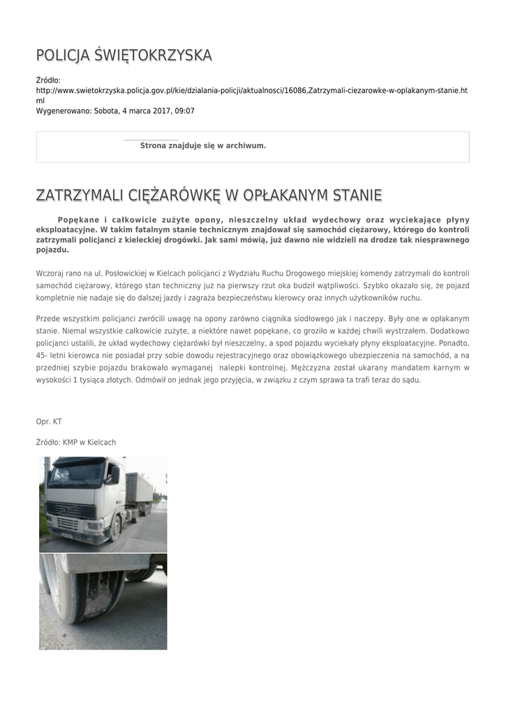 POLICJA ŚWIĘTOKRZYSKA Źródło: http://www.swietokrzyska.policja.gov.pl/kie/dzialania-policji/aktualnosci/16086,Zatrzymali-ciezarowke-w-oplakanym-stanie.ht ml Wygenerowano: Sobota, 4 marca 2017, 09:07 Strona znajduje się w archiwum. ZATRZYMALI CIĘŻARÓWKĘ W OPŁAKANYM STANIE Popękane i całkowicie zużyte opony, nieszczelny układ wydechowy oraz wyciekające płyny eksploatacyjne. W takim fatalnym stanie technicznym znajdował się samochód ciężarowy, którego do kontroli zatrzymali policjanci z kieleckiej drogówki. Jak sami mówią, już dawno nie widzieli na drodze tak niesprawnego pojazdu. Wczoraj rano na ul. Posłowickiej w Kielcach policjanci z Wydziału Ruchu Drogowego miejskiej komendy zatrzymali do kontroli samochód ciężarowy, którego stan techniczny już na pierwszy rzut oka budził wątpliwości. Szybko okazało się, że pojazd kompletnie nie nadaje się do dalszej jazdy i zagraża bezpieczeństwu kierowcy oraz innych użytkowników ruchu. Przede wszystkim policjanci zwrócili uwagę na opony zarówno ciągnika siodłowego jak i naczepy. Były one w opłakanym stanie. Niemal wszystkie całkowicie zużyte, a niektóre nawet popękane, co groziło w każdej chwili wystrzałem. Dodatkowo policjanci ustalili, że układ wydechowy ciężarówki był nieszczelny, a spod pojazdu wyciekały płyny eksploatacyjne. Ponadto, 45- letni kierowca nie posiadał przy sobie dowodu rejestracyjnego oraz obowiązkowego ubezpieczenia na samochód, a na przedniej szybie pojazdu brakowało wymaganej nalepki kontrolnej. Mężczyzna został ukarany mandatem karnym w wysokości 1 tysiąca złotych. Odmówił on jednak jego przyjęcia, w związku z czym sprawa ta trafi teraz do sądu. Opr. KT Źródło: KMP w Kielcach Ocena: 0/5 (0) Tweetnij