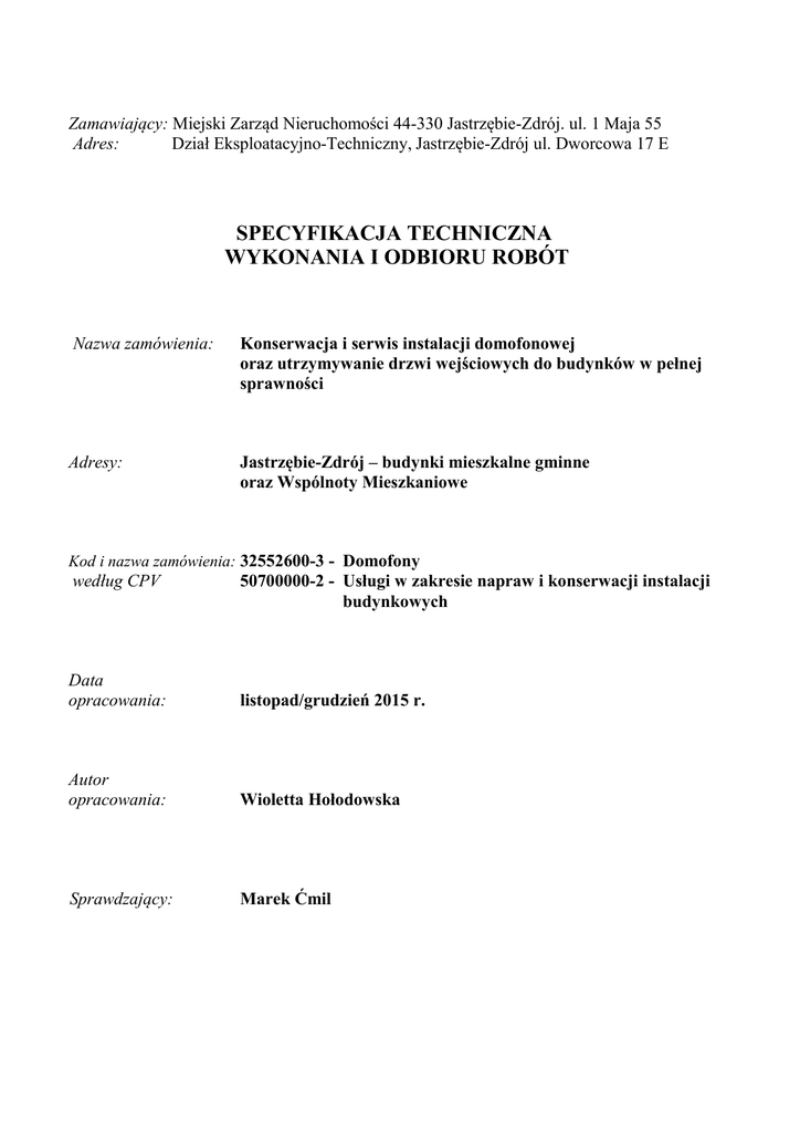 Zamawiający: Miejski Zarząd Nieruchomości 44-330 Jastrzębie-Zdrój. ul. 1 Maja 55 Adres: Dział Eksploatacyjno-Techniczny, Jastrzębie-Zdrój ul. Dworcowa 17 E SPECYFIKACJA TECHNICZNA WYKONANIA I ODBIORU ROBÓT Nazwa zamówienia: Konserwacja i serwis instalacji domofonowej oraz utrzymywanie drzwi wejściowych do budynków w pełnej sprawności Adresy: Jastrzębie-Zdrój – budynki mieszkalne gminne oraz Wspólnoty Mieszkaniowe Kod i nazwa zamówienia: 32552600-3 - Domofony według CPV 50700000-2 - Usługi w zakresie napraw i konserwacji instalacji budynkowych Data opracowania: listopad/grudzień 2015 r. Autor opracowania: Wioletta Hołodowska Sprawdzający: Marek Ćmil 1. Wstęp 1.1. Przedmiot Przedmiotem specyfikacji technicznej są wymagania dotyczące wykonania i odbioru usług związanych ze stałą konserwacją i serwisem instalacji domofonowych znajdujących się w Jastrzębiu-Zdroju w budynkach mieszkalnych gminnych administrowanych przez MZN oraz budynkach Wspólnot Mieszkaniowych zarządzanych przez MZN oraz utrzymywanie drzwi wejściowych do budynków w pełnej sprawności. 1.2. Zakres usług objętych specyfikacją Usługi, których dotyczy specyfikacja, obejmują wszystkie czynności mające na celu stałą konserwację i serwis instalacji domofonowych aby działała bezawaryjnie oraz utrzymywanie drzwi wejściowych do budynków w pełnej sprawności technicznej. Wykonawca przed złożeniem oferty zobowiązany jest do dokonania oględzin obiektów i zapoznania się z zakresem robót. 1.3. Ogólne wymagania dotyczące robót Wykonawca robót jest odpowiedzialny za jakość ich wykonania oraz za zgodność ze specyfikacją i poleceniami Inspektora Nadzoru. 2. Wykonanie robót Zakres usług, o których mowa w pkt 1.1. obejmuje: Zadanie nr I Konserwacja podstawowa - Stała konserwacja i serwis instalacji domofonowej – obejmująca następujące czynności: 1. naprawa elektrozaczepów w drzwiach wejściowych, 2. naprawa elektroryglów w drzwiach wejściowych, 3. naprawa przewodów oraz instalacji, puszek, gniazd, 4. naprawa układów zasilania, transformatorów oraz wzmacniaczy, 5. naprawa głośnika w kasetach oraz wzmacniaczy z mikrofonem, 6. wymiana wizytówek lub usunięcie nazwisk na spisie, 7. naprawa szyldów kasety, 8. naprawa panelu sterowania, 9. usuwanie przerw w dopływie sygnału między panelem sterowania a aparatem słuchawkowym w mieszkaniu, 10. przegląd instalacji domofonowej i usunięcie nieprawidłowości w tym zabezpieczenie kabli, 11. naprawa i regulacja samozamykaczy, 12. naprawa, czyszczenie i smarowanie zamków drzwiowych, zawiasów, 13. naprawa klamko-gałek, stopek drzwiowych, odbojów, itp. Realizacja zadania będzie następować poprzez: 1. Osobisty odbiór zlecenia roboczego przez Wykonawcą (pracownika oddelegowanego) ze wskazaniem adresu i opisu zgłoszonej usterki. Wykonawca po usunięciu usterki jest zobowiązany wpisać w zleceniu czas i sposób realizacji zgłoszenia oraz uzyskać potwierdzenie usunięcia usterki w postaci podpisu osoby zgłaszającej usterki. 2. Telefoniczne zgłoszenie usterki. Wykonawca na pustym druku zlecenia roboczego zobowiązany jest wpisać następujące informacje: datę przyjęcia zgłoszenia, informację STWiOR – Konserwacja instalacji domofonowej 2/12 o usterce. Po usunięciu usterki w zleceniu należy opisać sposób realizacji zgłoszenia oraz uzyskać potwierdzenie usunięcia usterki w postaci podpisu osoby zgłaszającej usterki. Zrealizowane zlecenie robocze Wykonawca dostarcza Inspektorowi Nadzoru najpóźniej do 3 dni roboczych od przekazania zlecenia. Usuwanie usterki powinno nastąpić w terminie do 24 godzin od chwili zgłoszenia, a w przypadku niemożliwości jej usunięcia (brak dostępu do lokalu) w terminie możliwie najkrótszym wraz z poinformowaniem Inspektora Nadzoru. W przypadku wystąpienia awarii np. zablokowania drzwi (lub braku możliwości ich otwarcia) usługę należy wykonać niezwłocznie - najpóźniej do 2 godzin od zgłoszenia, gdyż usterka ta może mieć wpływ na doprowadzenie do zniszczenia skrzydła drzwiowego. Czynności zawarte w pkt.: 1, 11, 12 – podlegają obowiązkowemu wykonaniu minimum jeden raz w miesiącu, co należy potwierdzić w protokole z kontroli, stanowiącym obligatoryjny załącznik do comiesięcznej faktury. Brak protokołu i załączników potwierdzających wykonanie czynności będzie podstawą do nie przyjęcia faktury. Zadanie nr II Konserwacja rozszerzona - Utrzymywanie drzwi wejściowych do budynków w pełnej sprawności – obejmująca następujące usługi: 1. wymiana/montaż samozamykacza typu GEZE-TS2000; 2. wymiana/montaż stopki drzwiowej (małej lub dużej w zależności od usytuowania wysokościowego podestu przed drzwiami); 3. wymiana wkładki bębenkowej w drzwiach wejściowych; 4. dorobienie klucza patentowego do wkładki bębenkowej – 1 szt.; 5. wymiana zamka wpuszczanego w drzwiach wejściowych; 6. wymiana elektrozamka w drzwiach wejściowych; 7. wymiana/montaż odboju do drzwi wejściowych; 8. wymiana /montaż klamko-gałki. Materiały - należy stosować materiały powszechnie stosowane, dopuszczone do użytku, posiadające wymagane odrębnymi przepisami certyfikaty, deklaracje zgodności itp. Poniżej przedstawiono wykaz wyposażenia technicznego podlegającego wymianie i ich minimalne parametry techniczne jakie powinny zostać spełnione przy realizacji zadania nr 2: 1) Samozamykacz GEZE-TS 2000: - z ramieniem nożycowym, - bezstopniowa regulacja siły zamykania w zakresie EN 2-4, - regulowana końcowa faza zamykania i prędkość zamykania, - blokada położenia otwarcia w zakresie 70°-150° (za pomocą mechanizmu blokującego, - faza dobicia regulowana hydraulicznie za pomocą śruby umieszczonej na powierzchni czołowej urządzenia oraz funkcja tłumienia otwierania (GEZE TS 2000 NV BC), - kolor srebrny lub ciemny brąz. 2) Stopka drzwiowa: - wykonana z metalu, malowana proszkowo w kolorze ciemnobrązowym, - dolna krawęd