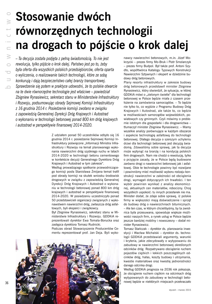 b u d o w n i c t w o Stosowanie dwóch równorzędnych technologii na drogach to pójście o krok dalej – Ta decyzja została podjęta z pełną świadomością. To nie jest rewolucja, tylko pójście o krok dalej. Państwo jest po to, żeby była oferta dla wszystkich polskich przedsiębiorców, oferta oparta o wyliczenia, o realizowanie takich technologii, które ze sobą konkurują i dają bezpieczeństwo całej branży transportowej. Sprawdzenie się potem w praktyce udowodni, że to polskie otwarcie na te dwie równorzędne technologie jest właściwe – powiedział Zbigniew Rynasiewicz, sekretarz stanu w Ministerstwie Infrastruktury i Rozwoju, podsumowując obrady Sejmowej Komisji Infrastruktury z 16 grudnia 2014 r. Posiedzenie komisji zwołano w związku z zapowiedzią Generalnej Dyrekcji Dróg Krajowych i Autostrad o wykonaniu w technologii betonowej ponad 800 km dróg krajowych i autostrad w perspektywie finansowej 2014-2020. 36 fot. Piotr Piestrzyński Z udziałem ponad 50 uczestników odbyło się 16 grudnia 2014 r. posiedzenie Sejmowej Komisji Infrastruktury poświęcone „Informacji Ministra Infrastruktury i Rozwoju na temat planowanego wykonania nawierzchni dróg szybkiego ruchu w latach 2014-2020 w technologii betonu cementowego w kontekście decyzji Generalnego Dyrektora Dróg Krajowych i Autostrad w tym zakresie”. Według prowadzącego spotkanie przewodniczącego komisji posła Stanisława Żmijana temat trafił pod obrady komisji na skutek wniosku środowisk drogowych w związku z zapowiedzią Generalnej Dyrekcji Dróg Krajowych i Autostrad o wykonaniu w technologii betonowej ponad 800 km dróg krajowych i autostrad w perspektywie finansowej 2014-2020. W posiedzeniu uczestniczyło ponad 50 przedstawicieli organizacji związanych z wykonawstwem nawierzchni dróg, zwłaszcza dróg asfaltowych, byli eksperci i związkowcy. Był Zbigniew Rynasiewicz, sekretarz stanu w Ministerstwie Infrastruktury i Rozwoju. GDDKiA reprezentowali dyrektor Ewa Tomala-Borucka oraz zastępca dyrektora Tomasz Rudnicki. Podczas obrad Stowarzyszenie Producentów Cementu reprezentował prof. Jan Deja. Byli wyko- nawcy nawierzchni betonowych, m.in. Józef Mokrzycki – prezes firmy Mo-Bruk i Piotr Smolarczyk – prezes firmy Budpol. Był także prof. Antoni Szydło, współtwórca Katalogu Typowych Konstrukcji Nawierzchni Sztywnych i ekspert w dziedzinie budowy dróg betonowych. Plany resortu infrastruktury w zakresie budowy dróg betonowych przedstawił minister Zbigniew Rynasiewicz, który stwierdził, że sytuacja, w której GDDKiA mówi o „zielonym świetle” dla technologii betonowej w Polsce będzie miała z czasem przełożenie na zamówienia samorządów. – To będzie nie tylko to, co wyjdzie z Programu Budowy Dróg Krajowych i Autostrad, ale także to, co będzie w możliwościach samorządów wojewódzkich, powiatowych czy gminnych. Czyli mówimy o problemie istotnym dla gospodarki i dla drogownictwa – tłumaczył minister Zbigniew Rynasiewicz. – Mamy wszelkie analizy porównujące w każdym obszarze i aspekcie technologię asfaltową do technologii betonowej. Dlatego decyzja o szerszym uchyleniu drzwi dla technologii betonowej jest decyzją świadomą. Zdawaliśmy sobie sprawę, jak ta decyzja może wpłynąć na branżę i na kondycję polskich firm drogowych. Nam nie chodzi o rewolucję, tylko o przyjęcie zasady, że w Polsce będą budowane zarówno drogi o nawierzchni betonowej jak i asfaltowej. Obie te technologie powinny być rozwijane i powinniśmy mieć możliwość wyboru rodzaju konstrukcji nawierzchni w zależności od obciążenia drogi, wymagań dotyczących ich trwałości. I ten wybór powinien wynikać z analizy ekonomicznej, aktualnych cen materiałów, robocizny. Chcę wszystkich uspokoić: tu innych przesłanek nie ma. Minister dodał, że zdaje sobie sprawę, iż polskie firmy w większości mają doświadczenie i sprzęt do budowy dróg o nawierzchniach bitumicznych. – Ale ten czas, w którym chcielibyśmy, by ta zwrotnica była przesuwana, spowoduje większe możliwości naszych firm, a rynek usług w Polsce będzie jeszcze bardziej mobilny i nowoczesny – dodał minister Rynasiewicz. Tomasz Stańczak – dyrektor ds. planowania inwestycji i Wacław Michalski – dyrektor ds. technologii GDDKiA przedstawiali argumenty, warunki i kryteria, jakie zdecydowały o wytypowaniu do zabudowy w nawierzchni betonowej określonych odcinków dróg. Rozpatrywano obciążenie ruchem pojazdów ciężkich i lekkich poszczególnych odcinków dróg, hałas, koszty budowy i utrzymania, kwestie materiałowe oraz kwestię jednorodności danego odcinka drogi. Według GDDKiA prognoza na 2036 rok pokazuje, że obciążenie ruchem ciężkim na odcinkach dróg wytypowanych do zabudowy w technologii betonowej będzie w niektórych miejscach przekraczało styczeń – marzec 2015 10 tys. pojazdów na dobę. – Sieć tych dróg betonowych pokrywa się z tym zwiększonym natężeniem ruchu ciężkiego. Dlatego nasze działanie jest w pełni przemyślane – uzasadniał dyrektor Stańczak. Jeżeli chodzi o poziom hałasu, to według GDDKiA różnica pomiędzy najgłośniejszym betonem a najcichszym asfaltem jest na granicy błędu. – Z analiz Politechniki Białostockiej wynika, że hałas na obydwu rodzajach dróg jest porównywalny – mówił Stańczak. Zdaniem dyrektora Wacława Michalskiego, przy podejmowaniu decyzji ważna jest zasada zrównoważonego rozwoju. - Chodzi o to, żeby równomiernie wykorzystać potencjał zarówno przemysłu petrochemicznego jak i cementowego – mówił dyrektor Michalski. Dyrektor Michalski wymienił następujące zalety nawierzchni betonowych: nie ulegają odkształceniom plastycznym, możliwość ułożenia nawierzchni w jednym przejściu zestawu maszyn – od pod- budowy do warstwy ścieralnej, duża sztywność nawierzchni w miejscach intensywnego obciążenia, możliwość ponownego użycia materiału z wyburzenia. Beton z rozbiórki 