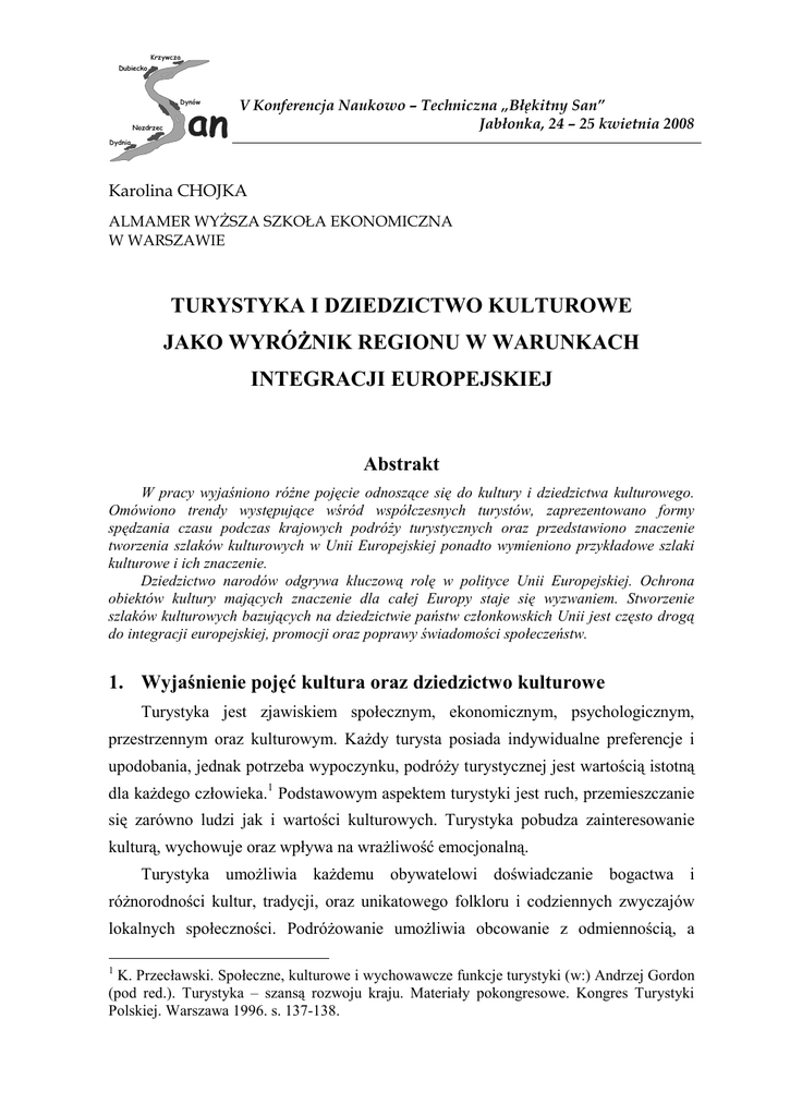 Krzywcza Dubiecko Dynów Nozdrzec V Konferencja Naukowo – Techniczna „Błękitny San” Jabłonka, 24 – 25 kwietnia 2008 Dydnia Karolina CHOJKA ALMAMER WYśSZA SZKOŁA EKONOMICZNA W WARSZAWIE TURYSTYKA I DZIEDZICTWO KULTUROWE JAKO WYRÓśNIK REGIONU W WARUNKACH INTEGRACJI EUROPEJSKIEJ Abstrakt W pracy wyjaśniono róŜne pojęcie odnoszące się do kultury i dziedzictwa kulturowego. Omówiono trendy występujące wśród współczesnych turystów, zaprezentowano formy spędzania czasu podczas krajowych podróŜy turystycznych oraz przedstawiono znaczenie tworzenia szlaków kulturowych w Unii Europejskiej ponadto wymieniono przykładowe szlaki kulturowe i ich znaczenie. Dziedzictwo narodów odgrywa kluczową rolę w polityce Unii Europejskiej. Ochrona obiektów kultury mających znaczenie dla całej Europy staje się wyzwaniem. Stworzenie szlaków kulturowych bazujących na dziedzictwie państw członkowskich Unii jest często drogą do integracji europejskiej, promocji oraz poprawy świadomości społeczeństw. 1. Wyjaśnienie pojęć kultura oraz dziedzictwo kulturowe Turystyka jest zjawiskiem społecznym, ekonomicznym, psychologicznym, przestrzennym oraz kulturowym. KaŜdy turysta posiada indywidualne preferencje i upodobania, jednak potrzeba wypoczynku, podróŜy turystycznej jest wartością istotną dla kaŜdego człowieka.1 Podstawowym aspektem turystyki jest ruch, przemieszczanie się zarówno ludzi jak i wartości kulturowych. Turystyka pobudza zainteresowanie kulturą, wychowuje oraz wpływa na wraŜliwość emocjonalną. Turystyka umoŜliwia kaŜdemu obywatelowi doświadczanie bogactwa i róŜnorodności kultur, tradycji, oraz unikatowego folkloru i codziennych zwyczajów lokalnych społeczności. PodróŜowanie umoŜliwia obcowanie z odmiennością, a 1 K. Przecławski. Społeczne, kulturowe i wychowawcze funkcje turystyki (w:) Andrzej Gordon (pod red.). Turystyka – szansą rozwoju kraju. Materiały pokongresowe. Kongres Turystyki Polskiej. Warszawa 1996. s. 137-138. Karolina Chojka poprzez poznawanie nowego pozwala wyzbyć się uprzedzeń, czy stereotypów, wpływając na światopogląd, wzbogacając nasze Ŝycie w doświadczenia, czy doznania estetyczne, duchowe i emocjonalne.2 Decydując się na wyjazd turystyczny róŜnimy się potrzebami, jakie nami kierują oraz oczekiwaniami względem oferty, czy miejscowości docelowej. Turysta znajdując się w kraju, regionie, który odwiedza ma styczność z miejscowymi społecznościami oraz ich codziennością. Poznaje ich kulturę, obyczaje oraz obowiązki. Regionalne tradycje i obyczajowość mają swoje odzwierciedlenie w dziedzictwie kulturowym stanowiącym spuściznę wielu pokoleń. Przekazują one kolejnym potomkom cenne, a zarazem unikatowe wartości dziedzictwa regionu. Pojęcie kultury definiować moŜna na szereg sposobów. Na kulturę składa się dorobek ludzkości wytworzony na przestrzeni lat; to dorobek społeczny, który został przekazany za pomocą treści pisanych, mówionych, w formie dzieł – rzeźb, obrazów, budowli. Kulturę moŜna postrzegać jako całość, bądź rozpatrywać pod względem elementów, które się na nią składają i jest toŜsama z tradycją. Dzięki unikatowym wartościom tradycji moŜemy wytypować obszary stanowiące regiony kulturowe.3 „Kultura to dziedzictwo narodowe, wytwory i czynności danego narodu, naleŜące do kategorii kultury symbolicznej, mające wyjątkową powszechną wartość, szczególnie dla narodu poprzez dawanie poczucia identyfikacji, więzi.”4 Mogą to być dobra ruchome i nieruchome, stanowiska archeologiczne, zespoły budowlane, dzieła sztuki, rękopisy, ksiąŜki itp. Zabytkami ruchomymi będą np.: dzieła rzemiosła artystycznego, wytwory sztuki ludowej i rękodzieła. Zabytkami nieruchomymi są zaś m.in. elementy krajobrazu kulturowego, dzieła architektury i budownictwa, parki, ogrody, cmentarze, miejsca martyrologii.5 Kultura regionu to tradycyjne pieśni, tańce, rękodzieło, styl zabudowy, stroje, gwara, produkty i potrawy kulinarne, jak równieŜ obrzędy, obyczaje, czy lokalne uroczystości. Wszystkie te przejawy unikalności stanowić mogą dla turysty nie tylko źródło wiedzy, ale takŜe doświadczeń emocjonalnych. 2 K. Orzechowska-Kowalska. Zasady tworzenia europejskich szlaków kulturowych. (w:) Turyzm. Zeszyt 2. 2003. Wydawnictwo Uniwersytetu Łódzkiego. s. 69. 3 J. Wojciechowska. Dziedzictwo kulturowe regionów jako element produktu turystycznego. (w:) Burzyński T., Łabaj M. (red. nauk.). Turystyka rekreacyjna oraz turystyka specjalistyczna. Warszawa 2003. s. 152-153. 4 (cyt.) Narodowy Program Kultury „Ochrona Zabytków i Dziedzictwa Kulturowego” na lata 2004-2013. Warszawa 2004. s. 6. 5 TamŜe. s. 6-7. 10 Turystyka i dziedzictwo kulturowe… Największe znaczenie mają elementy kultury ludowej dla ludzi wykształconych, niestety nie budzą one takiego entuzjazmu i zainteresowania wśród społeczności wiejskich. Kopiowanie obcych wzorców, poczucie zacofania spowodowały niedocenianie bogactwa regionu i jego obumieranie. MoŜna śmiało stwierdzić, iŜ nie zrozumie się w pełni kultury nie podróŜując turystycznie. Turystyka to spotkania róŜnych kultur, wymiana wartości pomiędzy turystami odwiedzającymi a lokalnymi społecznościami.6 RóŜnorodność i odmienność charakteryzująca kulturę stanowi bogactwo i atut społeczności lokalnych. Zachowanie, czy ocalenie odrębności pomiędzy regionami ma dziś istotne znaczenie dla sektora turystycznego. Niejednorodność kulturowa w skali kraju przyczyniać się powinna do pobudzenia zainteresowania turystów podróŜami w poszczególne obszary.7 Na dziedzictwo kulturowe, składa się „całokształt materialnego i duchowego dorobku ludzkości, narodu i epoki”.8 Obszary posiadające unikatową toŜsamość kulturową często nazywa się „małymi ojczyznami”. Są one trwałe, a rozwój technologiczno-kulturowy, nie wpływa negatywnie na zatracenie zach